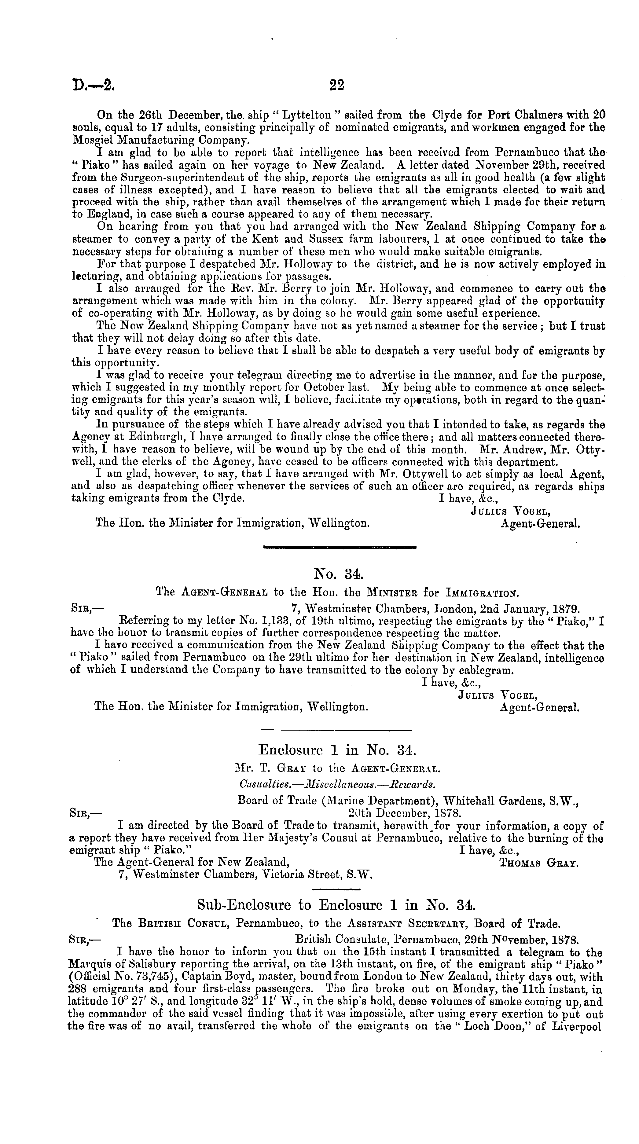 No. 34. The Aoent-GtENEealj to the Hou. the Minister for Imhigeatios". Sic, — 7, Westminster Chambers, London, 2nd January, 1879. Eeferring to my letter No. 1,133, of 19th ultimo, respecting the emigrants by the "Piuko," I have the honor to transmit copies of further correspondence respecting the matter. I hare received a communication from the New Zealand Shipping Company to the effect that the " Piako" sailed from Pernambuco on the 29th ultimo for her destination in New Zealand, intelligence of which I understand the Company to have transmitted to the colony by cablegram. I have, &c, JuLirs Vogel, The Hon. the Minister for Immigration, Wellington. Agent-General.