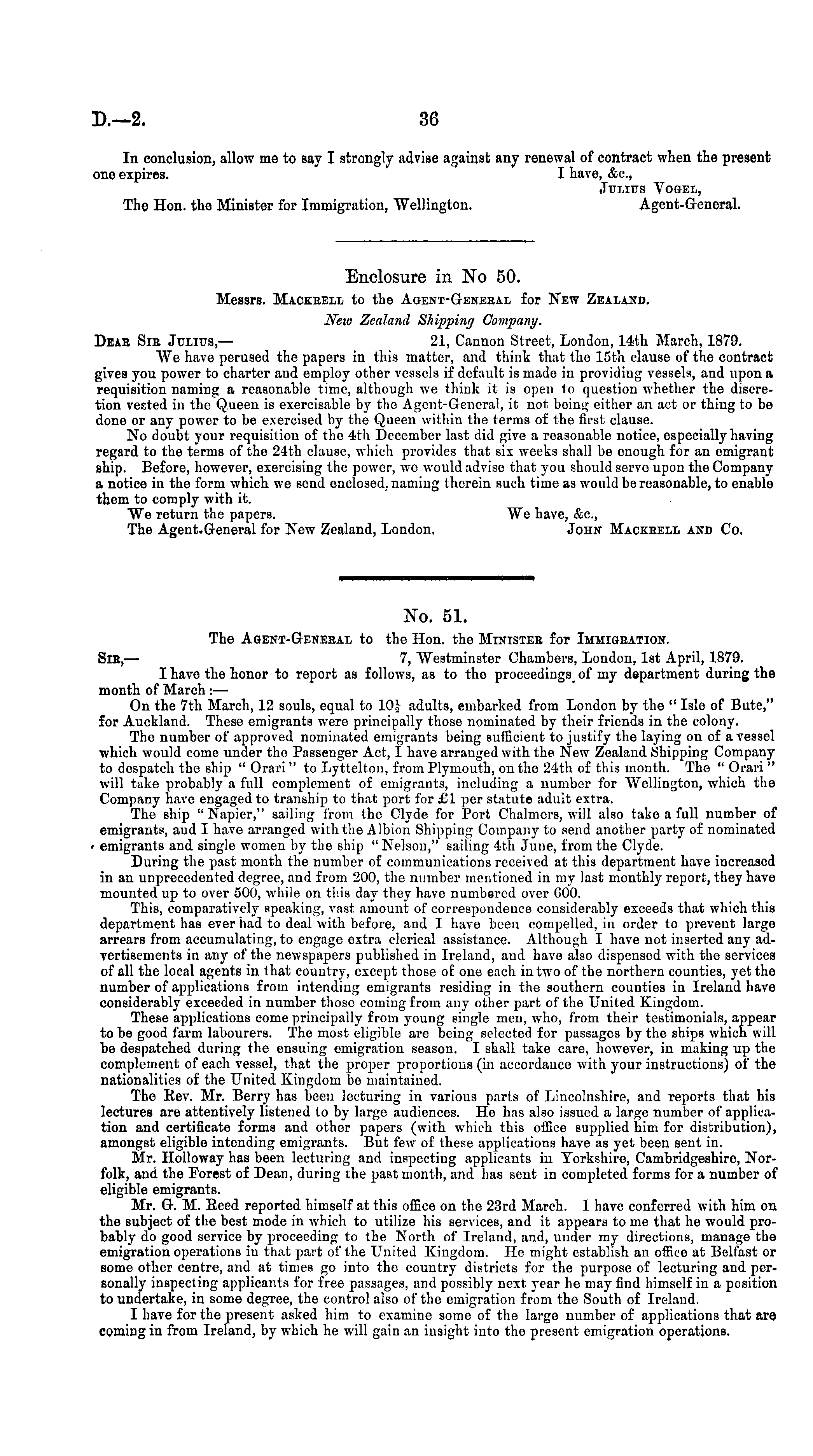 In conclusion, allow me to say I strongly advise against any renewal of contract when the present one expires. I have, &c, Julius Vogel, The Hon. the Minister for Immigration, Wellington. Agent-General.