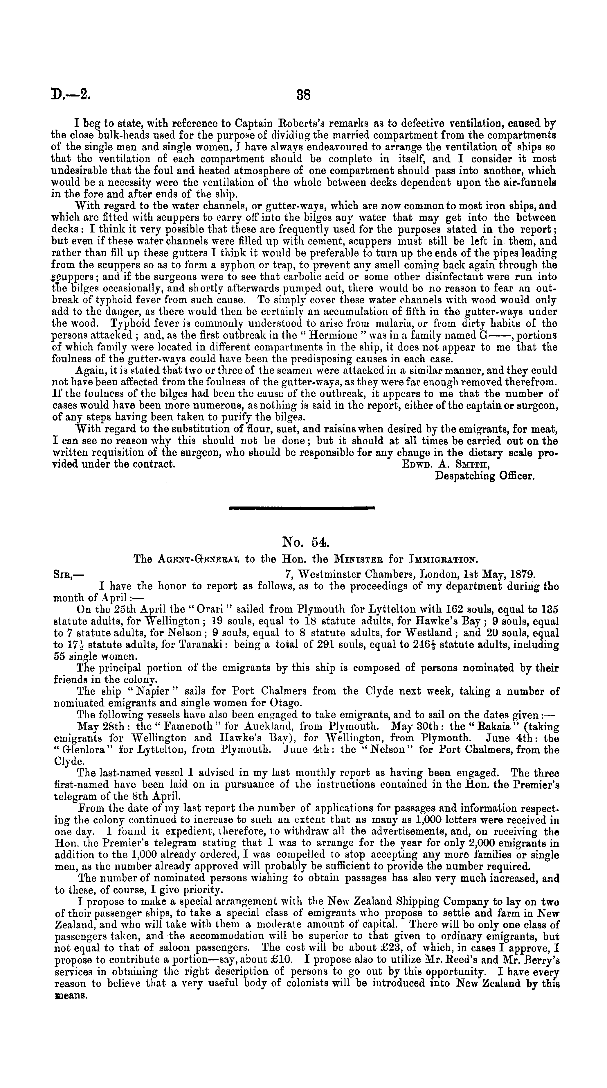 No. 54. The Agext-G-eneeai, to the Hon. the Minister for Immigeatiox. Sic, — 7, Westminster Chambers, London, Ist May, 1879. I have the honor to report as follows, as to the proceedings of my department during the month of April:— On the 25th April the " Orari" sailed from Plymouth for Lyttelton with IG2 souls, equal to 135 statute adults, for Wellington; 19 souls, equal to 18 statute adults, for Hawke's Bay ; 9 souls, equal to 7 statute adults, for Nelson ; 9 souls, equal to 8 statute adults, for Westland ; and 20 souls, equal to 17-i statute adults, for Taranaki: being a total of 291 souls, equal to 246-j statute adults, including 55 single women. The principal portion of the emigrants by this ship is composed of persons nominated by their friends in the colony. The ship " Napier " sails for Port Chalmers from the Clyde next week, taking a number of nominated emigrants and single women for Otago. The following vessels have also been engaged to take emigrants, and to sail on the dates given:— May 28th : the " Eamenoth " for Auckland, from Plymouth. May 30th : the " Eakaia " (taking emigrants for Wellington and Hawke's Bay), for Wellington, from Plymouth. June 4th: the " Glenlora " for Lyttelton, from Plymouth. June 4th : the " Nelson " for Port Chalmers, from the Clyde. The last-named vessel I advised in my last monthly report as having been engaged. The three first-named have been laid on in pursuance of the instructions contained in the Hon. the Premier's telegram of the Bth April. Prom the date of my last report the number of applications for passages and information respecting the colony continued to increase to such an extent that as many as 1,000 letters were received in one day. I found it expedient, therefore, to withdraw all the advertisements, and, on receiving the Hon. the Premier's telegram stating that I was to arrange for the year for only 2,000 emigrants in addition to the 1,000 already ordered, I was compelled to stop accepting any more families or single men, as the number already approved will probably be sufficient to provide the number required. The number of nominated persons wishing to obtain passages has also very much increased, and to these, of course, I give priority. I propose to make a special arrangement with the New Zealand Shipping Company to lay on two of their passenger ships, to take a special class of emigrants who propose to settle and farm in New Zealand, and who will take with them a moderate amount of capital. There will be only one class of passengers taken, and the accommodation will be superior to that given to ordinary emigrants, but not equal to that of saloon passengers. The cost will be about £23, of which, in cases I approve, I propose to contribute a portion —say, about £10. I propose also to utilize Mr. Reed's and Mr. Berry's services in obtaining the right description of persons to go out by this opportunity. I have every reason to believe that a very useful body of colonists will be introduced into New Zealand by this Beans.
