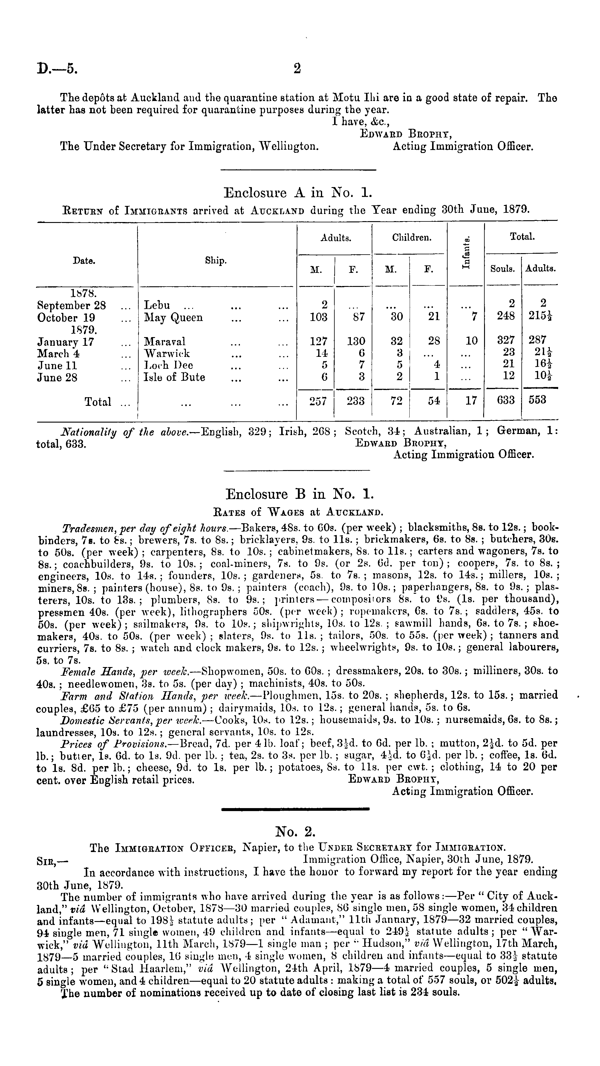 No. 2. The Immigbation Offices, Napier, to the L txder Seceetaby for Immigbation. Sir — Immigration Office, Napier, 30th June, 1879. In accordance with instructions, I have the honor to forward my report for the year ending 30th June, 1879. The number of immigrants who have arrived during the year is as follows: —Per " City of Auckland," via Wellington, October, 1878 —30 married couples, 86 single men, 58 single women, 34 children and infants —equal to 19Si- statute adults; per " Adamant," lltli January, 1879 —32 married couples, 94 single men, 71 single women, 49 children and infants —equal to 249 i statute adults; per "Warwick," vid Wellington, 11th March, 1879—1 single man ; per " Hudson," vid Wellington, 17th March, IS7<) —5 married couples, 16 single men, 4 single women, 8 children and infants—equal to 331- statute adults ; per " Stad Haarlem," vid Wellington, 24th April, 1879 —4 married couples, 5 single men, 5 single women, and 4 children —equal to 20 statute adults : making a total of 557 souls, or 502* adults. The number of nominations received up to date of closing last list is 234 souls.