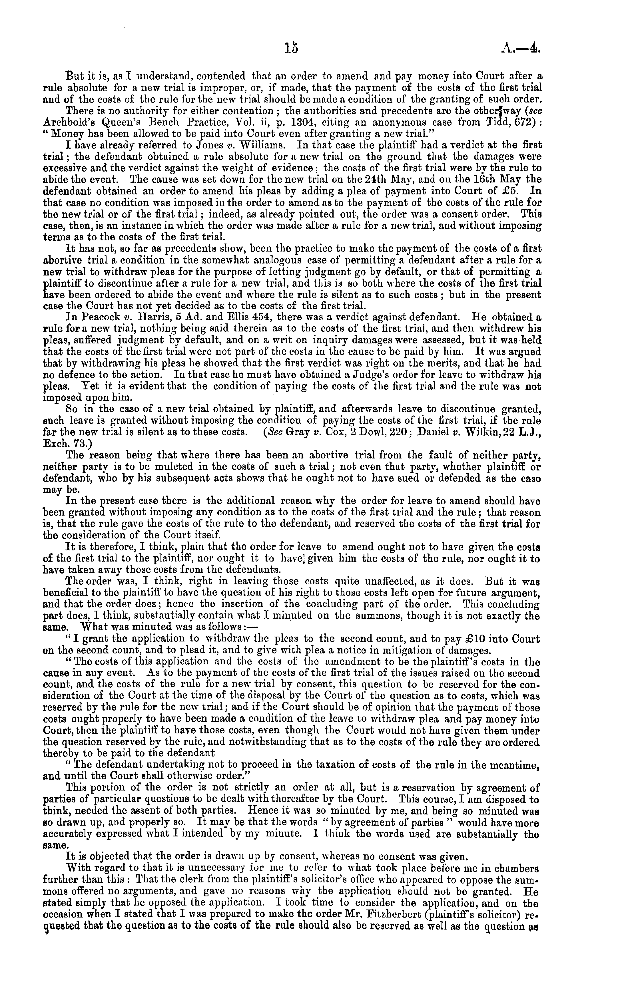 But it is, as I understand, contended that an order to amend and pay money into Court after a rule absolute for a new trial is improper, or, if made, that the payment of the costs of the first trial and of the costs of the rule for the new trial should be made a condition of the granting of such order. There is no authority for either contention ; the authorities and precedents are the otherjway (see Archbold's Queen's Bench Practice, Vol. ii, p. 1304, citing an anonymous case from Tidd, 672) : " Money has been allowed to be paid into Court even after granting a new trial." I have already referred to Jones v. "Williams. In that case the plaintiff had a verdict at the first trial; the defendant obtained a rule absolute for a new trial on the ground that the damages were excessive and the verdict against the weight of evidence ; the costs of the first trial were by the rule to abide the event. The cause was set down for the new trial on the 24th May, and on the 16th May the defendant obtained an order to amend his pleas by adding a plea of payment into Court of £5. In that case no condition was imposed in the order to amend as to the pavinent of the costs of the rule for the new trial or of the first trial; indeed, as already pointed out, the order was a consent order. This case, then, is an instance in which the order was made after a rule for a new trial, and without imposing terms as to the costs of the first trial. It has not, so far as precedents show, been the practice to make the payment of the costs of a first abortivo trial a condition in tho somewhat analogous case of permitting a defendant after a rule for a new trial to withdraw pleas for the purpose of letting judgment go by default, or that of permitting a plaintiff to discontinue after a rule for a new trial, and this is so both where the costs of the first trial have been ordered to abide the event and where the rule is silent as to such costs ; but in the present case the Court has not yet decided as to the costs of the first trial. In Peacock v. Harris, 5 Ad. and Ellis 454, there was a verdict against defendant. He obtained a rule fora new trial, nothing being said therein as to the costs of the first trial, and then withdrew his pleas, suffered judgment by default, and on a writ on inquiry damages were assessed, but it was held that the costs of the first trial were not part of the costs in the cause to be paid by him. It was argued that by withdrawing his pleas he showed that the first verdict was right on the merits, and that he had no defence to the action. In that case he must have obtained a Judge's order for leave to withdraw his pleas. Yet it is evident that the condition of paying the costs of the first trial and the rule was not imposed upon him. So in the case of a new trial obtained by plaintiff, and afterwards leave to discontinue granted, such leave is granted without imposing the condition of paying the costs of the first trial, if the rule far the new trial is silent as to these costs. (See Gray v. Cox, 2 Dowl, 220; Daniel v. Wilkin, 22 L. J., Exch. 73.) The reason being that where there has been an abortive trial from the fault of neither party, neither party is to be mulcted in the costs of such a trial; not even that party, whether plaintiff or defendant, who by his subsequent acts shows that he ought not to have sued or defended as the case may be. In the present case there is the additional reason why the order for leave to amend should have been granted without imposing any condition as to the costs of the first trial and the rule ; that reason is, that the rule gave the costs of the rule to the defendant, and reserved the costs of the first trial for the consideration of the Court itself. It is therefore, I think, plain that the order for leave to amend ought not to have given the costs of the first trial to the plaintiff, nor ought it to have] given him the costs of the rule, nor ought it to have taken away those costs from the defendants. The order was, I think, right in leaving those costs quite unaffected, as it does. But it was beneficial to the plaintiff to have the question of his right to those costs left open for future argument, and that the order docs; hence the insertion of the concluding part of tho order. This concluding part does, I think, substantially contain what I minuted on the summons, though it is not exactly the same. What was minuted was as follows: — " I grant the application to withdraw the pleas to the second count, and to pay £10 into Court on the second count, and to plead it, and to give with plea a notice in mitigation of damages. " The costs of this application and the costs of the amendment to be the plaintiff's costs in the cause in any event. As to the payment of the costs of the first trial of the issues raised on the second count, and the costs of the rule for a new trial by consent, this question to be reserved for the consideration of the Court at the time of the disposal by the Court of the question as to costs, which was reserved by the rule for the new trial; and if "the Court should be of opinion that the payment of those costs ought properly to have been made a condition of the leave to withdraw plea and pay money into Court, then the plaintiff to have those costs, even though the Court would not have given them under the question reserved by the rule, and notwithstanding that as to the costs of the rule they are ordered thereby to be paid to the defendant " The defendant undertaking not to proceed in the taxation of costs of the rule in the meantime, and until the Court shall otherwise order." This portion of the order is not strictly an order at all, but is a reservation by agreement of parties of particular questions to be dealt with thereafter by the Court. This course, lam disposed to think, needed the assent of both parties. Hence it was so minuted by me, and being so minuted was so drawn up, and properly so. It may be that the words "by agreemen
