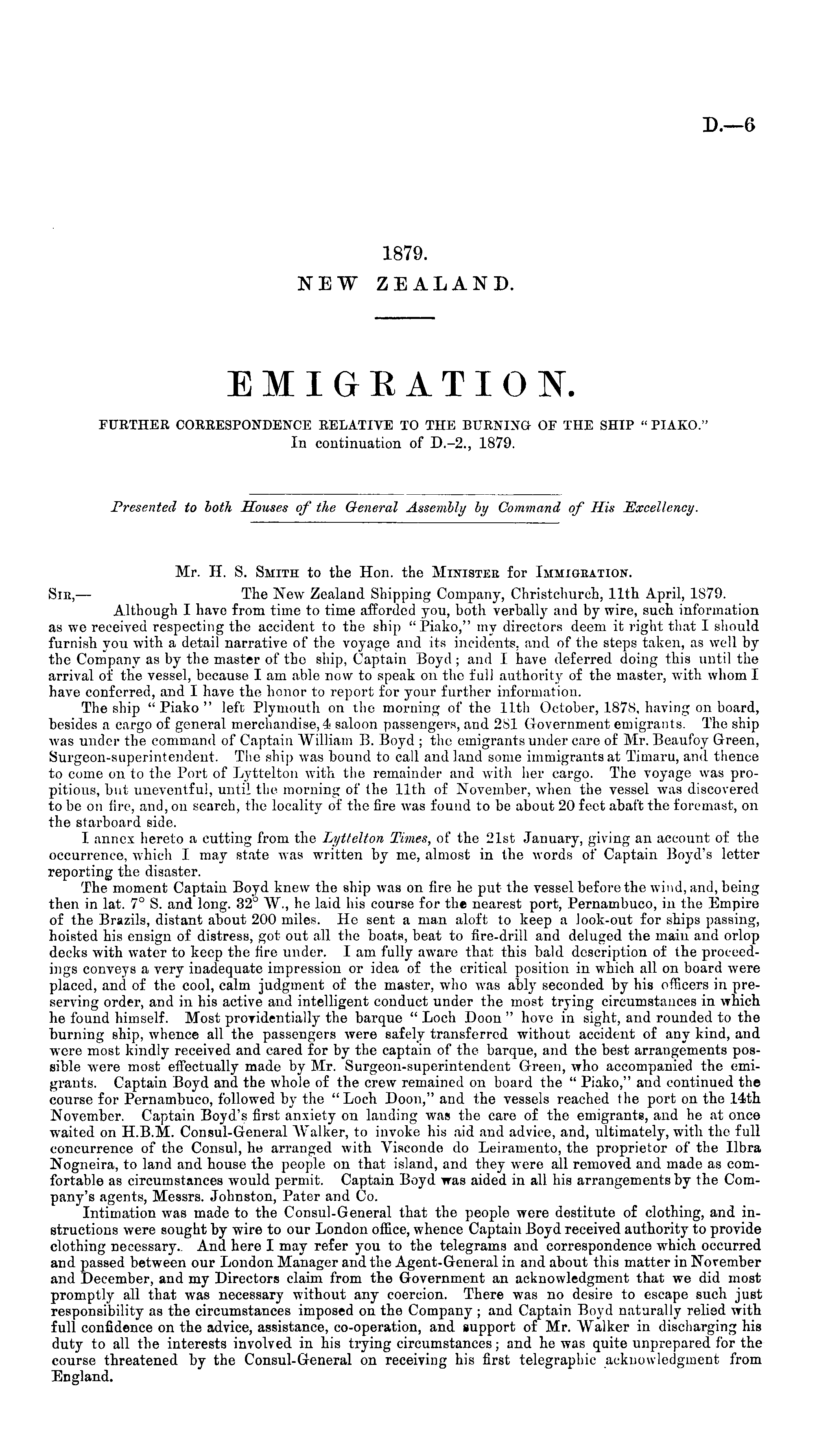 Presented to both Souses of the General Assembly by Command of His Excellency. Mr. H. S. Smith to the Hon. the Minister for Immigration. Sik, — The New Zealand Shipping Company, Christchurch, 11th April, 1879. Although I have from time to time afforded you, both verbally and by wire, such information as we received respecting the accident to the ship "Piako," my directors deem it right that I should furnish you with a detail narrative of the voyage and its incidents, and of the steps taken, as well by the Company as by the master of the ship, Captain Boyd; and I have deferred doing this until the arrival of the vessel, because I am able now to speak on the full authority of the master, with whom I have conferred, and I have the honor to report for your further information. The ship " Piako " left Plymouth on the morning of the 11th October, 187S, having on board, besides a cargo of general merchandise,4 saloon passengers, and 281 Government emigrants. The ship was under the command of Captain William B. Boyd ; the emigrants under care of Mr. Beaufoy Green, Surgeon-superintendent. The ship was bound to call and land some immigrants at Timaru, and thence to come on to the Port of Lyttelton with the remainder and with her cargo. The voyage was propitious, but uneventful, until the morning of the 11th of November, when the vessel was discovered to be on fire, and, on search, the locality of the fire was found to be about 20 feet abaft the foremast, on the starboard side. I annex hereto a cutting from the Lyttelton Times, of the 21st January, giving an account of the occurrence, which I may state was written by me, almost in the words of Captain Boyd's letter reporting the disaster. The moment Captain Boyd knew the ship was on fire he put the vessel before the wind, and, being then in lat. 7° S. and long. 32° W., he laid his course for the nearest port, Pernambuco, in the Empire of the Brazils, distant about 200 miles. He sent a man aloft to keep a look-out for ships passing, hoisted his ensign of distress, got out all the boats, beat to fire-drill and deluged the main and orlop docks with water to keep the fire under. lam fully aware that this bald description of the proceedings conveys a very inadequate impression or idea of the critical position in which all on board were placed, and of the cool, calm judgment of the master, who was ably seconded by his officers in preserving order, and in his active and intelligent conduct under the most trying circumstances in which he found himself. Most providentially the barque " Loch Doon " hove in sight, and rounded to the burning ship, whence all the passengers were safely transferred without accident of any kind, and were most kindly received and cared for by the captain of the barque, and the best arrangements possible were most effectually made by Mr. Surgeon-superintendent Green, who accompanied the emigrants. Captain Boyd and the whole of the crew remained on board the " Piako," and continued the course for Pernambuco, followed by the "Loch Doon," and the vessels reached the port on the 14th. November. Captain Boyd's first anxiety on landing was the care of the emigrants, and he at once waited on H.B.M. Consul-General Walker, to invoke his aid and advice, and, ultimately, with the full concurrence of the Consul, he arranged with Visconde do Leiramento, the proprietor of the libra Nogneira, to land and house the people on that island, and they were all removed and made as comfortable as circumstances would permit. Captain Boyd iras aided in all his arrangements by the Company's agents, Messrs. Johnston, Pater and Co. Intimation was made to the Consul-General that the people wore destitute of clothing, and instructions were sought by wire to our London office, whence Captain Boyd received authority to provide clothing necessary. And here I may refer you to the telegrams and correspondence which occurred and passed between our London Manager and the Agent-General in and about this matter in November and December, and my Directors claim from the Government an acknowledgment that we did most promptly all that was necessary without any coercion. There was no desire to escape such just responsibility as the circumstances imposed on the Company ; and Captain Boyd naturally relied with full confidence on the advice, assistance, co-operation, and support of Mr. Walker in discharging his duty to all the interests involved in his trying circumstances; and he was quite unprepared for the course threatened by the Consul-General on receiving his first telegraphic acknowledgment from England.
