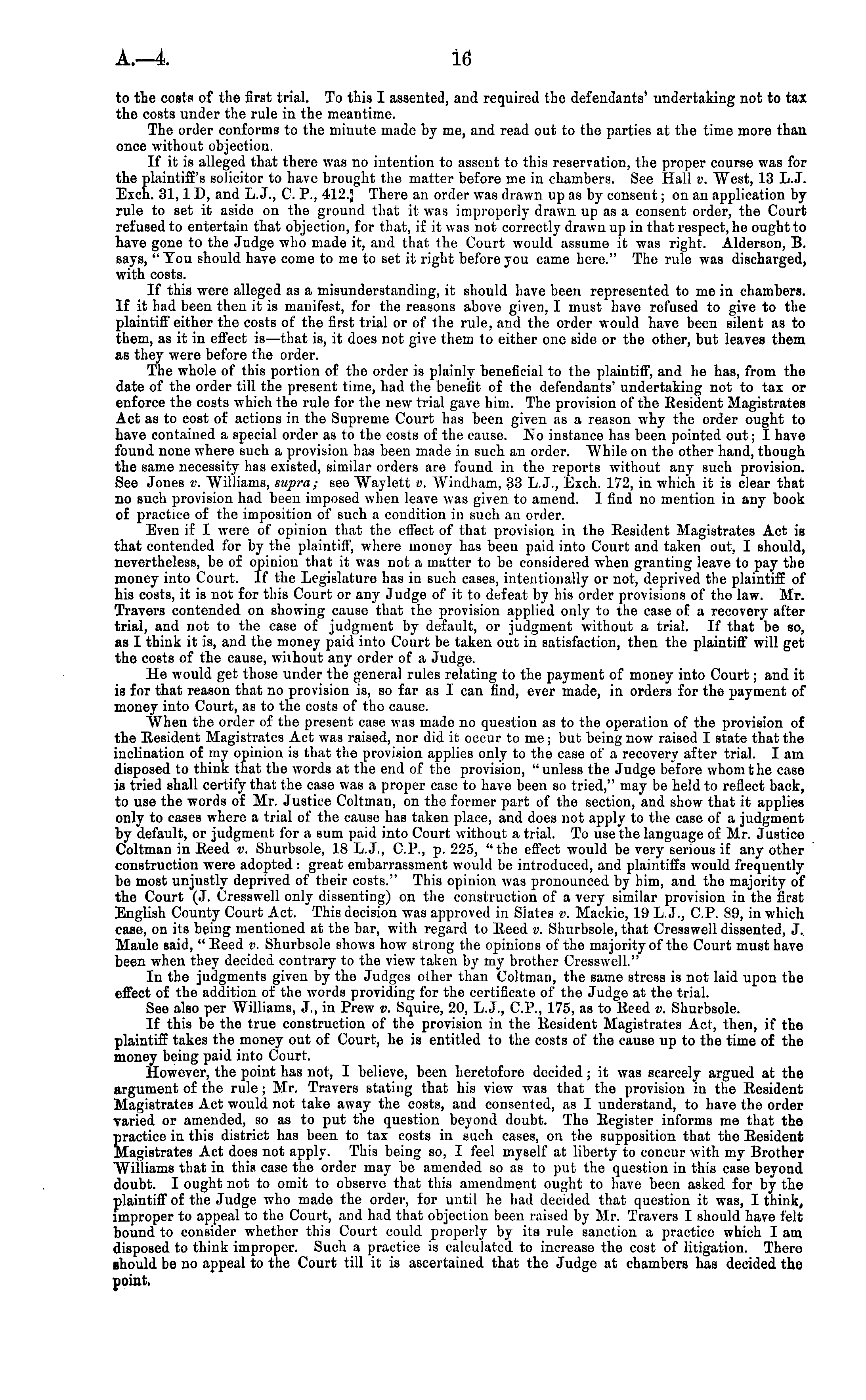 to the costs of the first trial. To this I assented, and required the defendants' undertaking not to tax the costs under the rule in the meantime. The order conforms to the minute made by me, and read out to the parties at the time more than once without objection. If it is alleged that there was no intention to assent to this reservation, the proper course was for the plaintiff's solicitor to have brought the matter before me in chambers. See Hall v. West, 13 L.J. Exch. 31,1D, and L. J., C. P., 412.J There an order was drawn up as by consent; on an application by rule to set it aside on the ground that it was improperly drawn up as a consent order, the Court refused to entertain that objection, for that, if it was not correctly drawn up in that respect, he ought to have gone to the Judge who made it, and that Ihe Court would assume it was right. Alderson, B. says, " You should have come to me to set it right before you came here." The rule was discharged, with costs. If this were alleged as a misunderstanding, it should have been represented to me in chambers. If it had been then it is manifest, for the reasons above given, I must have refused to give to the plaintiff either the costs of the first trial or of the rule, and the order would have been silent as to them, as it in effect is—that is, it does not give them to either one side or the other, but leaves them as they were before the order. The whole of this portion of the order is plainly beneficial to the plaintiff, and he has, from the date of the order till the present time, had the benefit of the defendants' undertaking not to tax or enforce the costs which the rule for the new trial gave him. The provision of the Resident Magistrates Act as to cost of actions in the Supreme Court has been given as a reason why the order ought to have contained a special order as to the costs of the cause. No instance has been pointed out; I have found none where such a provision has been made in such an order. While on the other hand, though the same necessity has existed, similar orders are found in the reports without any such provision. See Jones v. Williams, supra ; see Waylett v. Windham, 33 L.J., Exch. 172, in which it is clear that no such provision had been imposed when leave was given to amend. I find no mention in any book of practice of the imposition of such a condition in such an order. Even if I were of opinion that the effect of that provision in the Eesident Magistrates Act is that contended for by the plaintiff, where money has been paid into Court and taken out, I should, nevertheless, be of opinion that it was not a matter to be considered when granting leave to pay the money into Court. If the Legislature has in such cases, intentionally or not, deprived the plaintiff of his costs, it is not for this Court or any Judge of it to defeat by his order provisions of the law. Mr. Travers contended on showing cause that the provision applied only to the case of a recovery after trial, and not to the case of judgment by default, or judgment without a trial. If that be so, as I think it is, and the money paid into Court be taken out in satisfaction, then the plaintiff will get the costs of the cause, without any order of a Judge. He would get those under the general rules relating to the payment of money into Court; and it is for that reason that no provision is, so far as I can find, ever made, in orders for the payment of money into Court, as to the costs of the cause. When the order of the present case was made no question as to the operation of the provision of the Resident Magistrates Act was raised, nor did it occur to me; but being now raised I state that the inclination of my opinion is that the provision applies only to the case of a recovery after trial. lam disposed to think that the words at the end of the provision, "unless the Judge before whom the case is tried shall certify that the case was a proper case to have been so tried," may he held to reflect back, to use the words of Mr. Justice Coltman, on the former part of the section, and show that it applies only to cases where a trial of the cause has taken place, and does not apply to the case of a judgment by default, or judgment for a sum paid into Court without a trial. To use the language of Mr. Justice Coltman in Eeed v. Shurbsole, 18 L.J., C.P., p. 225, "the effect would be very serious if any other construction were adopted : great embarrassment would be introduced, and plaintiffs would frequently be most unjustly deprived of their costs." This opinion was pronounced by him, and the majority of the Court (J. Cresswell only dissenting) on the construction of a very similar provision in the first English County Court Act. This decision was approved in Slates v. Mackie, 19 L. J., C.P. 89, in which case, on its being mentioued at the bar, with regard to Eeed v. Shurbsole, that Cresswell dissented, J. Maule said, " Eeed v. Shurbsole shows how strong the opinions of the majority of the Court must have been when they decided contrary to the view taken by my brother Cresswell." In the judgments given by the Judges other than Coltman, the same stress is not laid upon the effect of the addition of the words providing for the certificate of the Judge at the trial. See also per Williams, J., in Prew v. Squire, 20, L.J., C.P., 175, as to Eeed v. Shurbsole. If this be the true construction of the provision in the Eesident Magistrates Act, then, if the plaintiff takes the money out of Court, he is entitled to the costs of the cause up to the time of the money being paid into Court. However, the point has not, I believe, been heretofore decided; it was scarcely argued at the argument of the rule ; Mr. Travers stating that his view was that the provision in the Eesident Magistrates Act would not take away the costs, and consented, as I understand, to have the order varied or amended, so as to put the question beyond doubt. The Eegister informs me that the practice in this di