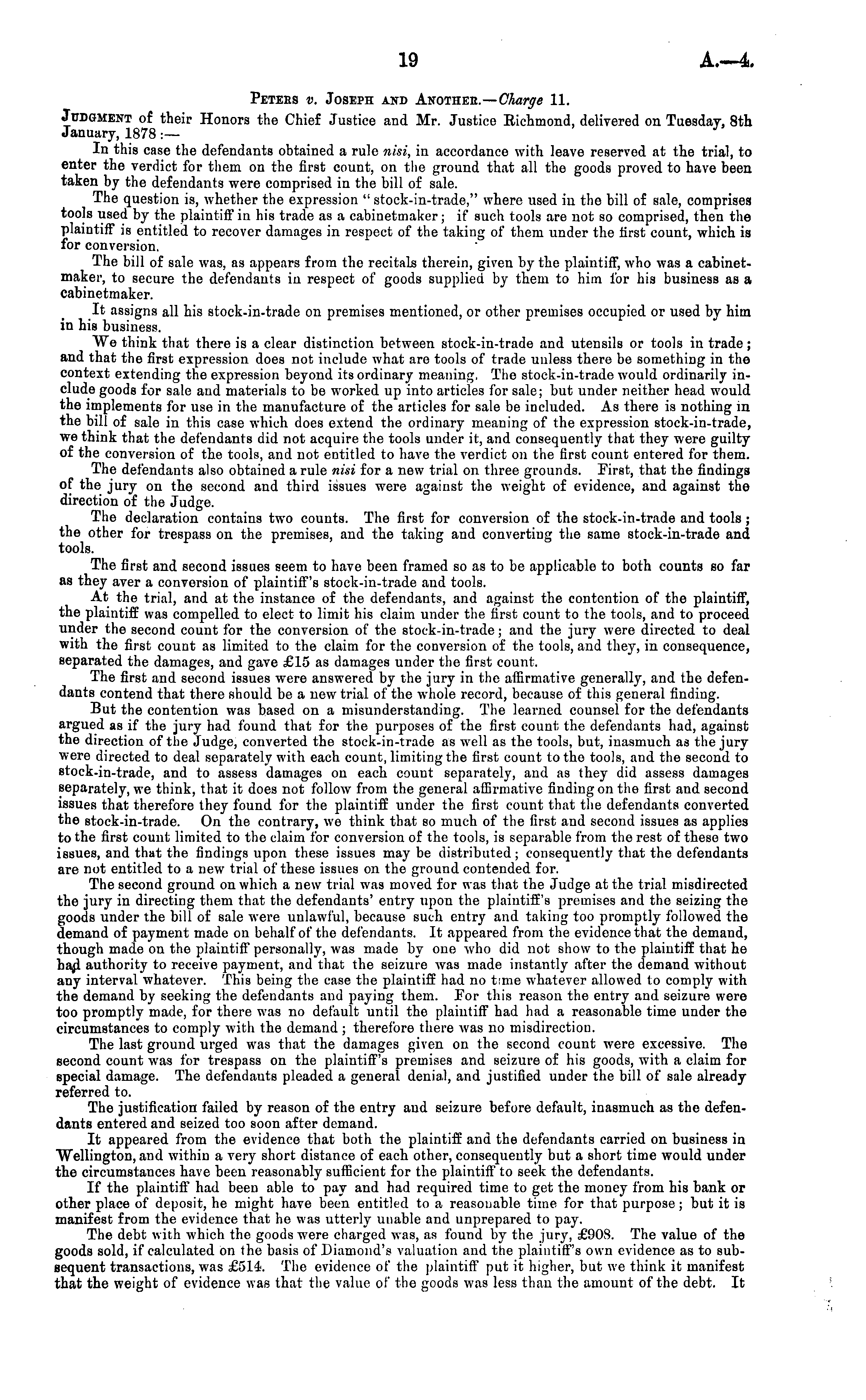 Petees v. Joseph and Another.— Charge 11. Judgment of their Honors the Chief Justice and Mr. Justice Richmond, delivered on Tuesday, Bth January, 1878 :— In this case the defendants obtained a rule nisi, in accordance with leave reserved at the trial, to enter the verdict for them on the first count, on the ground that all the goods proved to have been taken by the defendants were comprised in the bill of sale. The question is, whether the expression "stock-in-trade," where used in the bill of sale, comprises tools used by the plaintiff in his trade as a cabinetmaker; if such tools are not so comprised, then the plaintiff is entitled to recover damages in respect of the taking of them under the first count, which is for conversion. The bill of sale was, as appears from the recitals therein, given by the plaintiff, who was a cabinetmaker, to secure the defendants in respect of goods supplied by them to him for his business as a cabinetmaker. It assigns all his stock-in-trade on premises mentioned, or other premises occupied or used by him in his business. We think that there is a clear distinction between stock-in-trade and utensils or tools in trade; and that the first expression does not include what are tools of trade unless there be something in the context extending the expression beyond its ordinary meaning, The stock-in-trade would ordinarily include goods for sale and materials to be worked up into articles for sale; but under neither head would the implements for use in the manufacture of the articles for sale be included. As there is nothing in the bill of sale in this case which does extend the ordinary meaning of the expression stock-in-trade, we think that the defendants did not acquire the tools under it, and consequently that they were guilty of the conversion of the tools, and not entitled to have the verdict on the first count entered for them. The defendants also obtained a rule nisi for a new trial on three grounds. First, that the findings of the jury on the second and third issues were against the weight of evidence, and against the direction of the Judge. The declaration contains two counts. The first for conversion of the stock-in-trade and tools ; the other for trespass on the premises, and the taking and converting the same stock-in-trade and tools. The first and second issues seem to have been framed so as to be applicable to both counts so far as they aver a conversion of plaintiff's stock-in-trade and tools. At the trial, and at the instance of the defendants, and against the contention of the plaintiff, the plaintiff was compelled to elect to limit his claim under the first count to the tools, and to proceed under the second count for the conversion of the stock-in-trade; and the jury were directed to deal with the first count as limited to the claim for the conversion of the tools, and they, in consequence, separated the damages, and gave £15 as damages under the first count. The first and second issues were answered by the jury in the affirmative generally, and the defendants contend that there should be a new trial of the whole record, because of this general finding. But the contention was based on a misunderstanding. The learned counsel for the defendants argued as if the jury had found that for the purposes of the first count the defendants had, against the direction of the Judge, converted the stock-in-trade as well as the tools, but, inasmuch as the jury were directed to deal separately with each count, limiting the first count to the tools, and the second to stock-in-trade, and to assess damages on each count separately, and as they did assess damages separately, we think, that it does not follow from the general affirmative finding on the first and second issues that therefore they found for the plaintiff under the first count that the defendants converted the stock-in-trade. On the contrary, we think that so much of the first and second issues as applies to the first count limited to the claim for conversion of the tools, is separable from the rest of these two issues, and that the findings upon these issues may be distributed; consequently that the defendants are not entitled to a new trial of these issues on the ground contended for. The second ground on which a new trial was moved for was that the Judge at the trial misdirected the jury in directing them that the defendants' entry upon the plaintiff's premises and the seizing the goods under the bill of sale were unlawful, because such entry and taking too promptly followed the demand of payment made on behalf of the defendants. It appeared from the evidence that the demand, though made on the plaintiff personally, was made by one who did not show to the plaintiff that he had authority to receive payment, and that the seizure was made instantly after the demand without any interval whatever. This being the case the plaintiff had no time whatever allowed to comply with the demand by seeking the defendants and paying them. For this reason the entry and seizure were too promptly made, for there was no default until the plaintiff had had a reasonable time under the circumstances to comply with the demand ; therefore there was no misdirection. The last ground urged was that the damages given on the second count were excessive. The second count was for trespass on the plaintiff's premises and seizure of his goods, with a claim for special damage. The defendants pleaded a general denial, and justified under the bill of sale already referred to. The justification failed by reason of the entry and seizure before default, inasmuch as the defendants entered and seized too soon after demand. It appeared from the evidence that both the plaintiff and the defendants carried on business in Wellington, and within a very short distance of each other, consequently but a short time would under the circumstances have been reasonably sufficient for the plaintiff to seek the defendants. If the plaintiff had been a