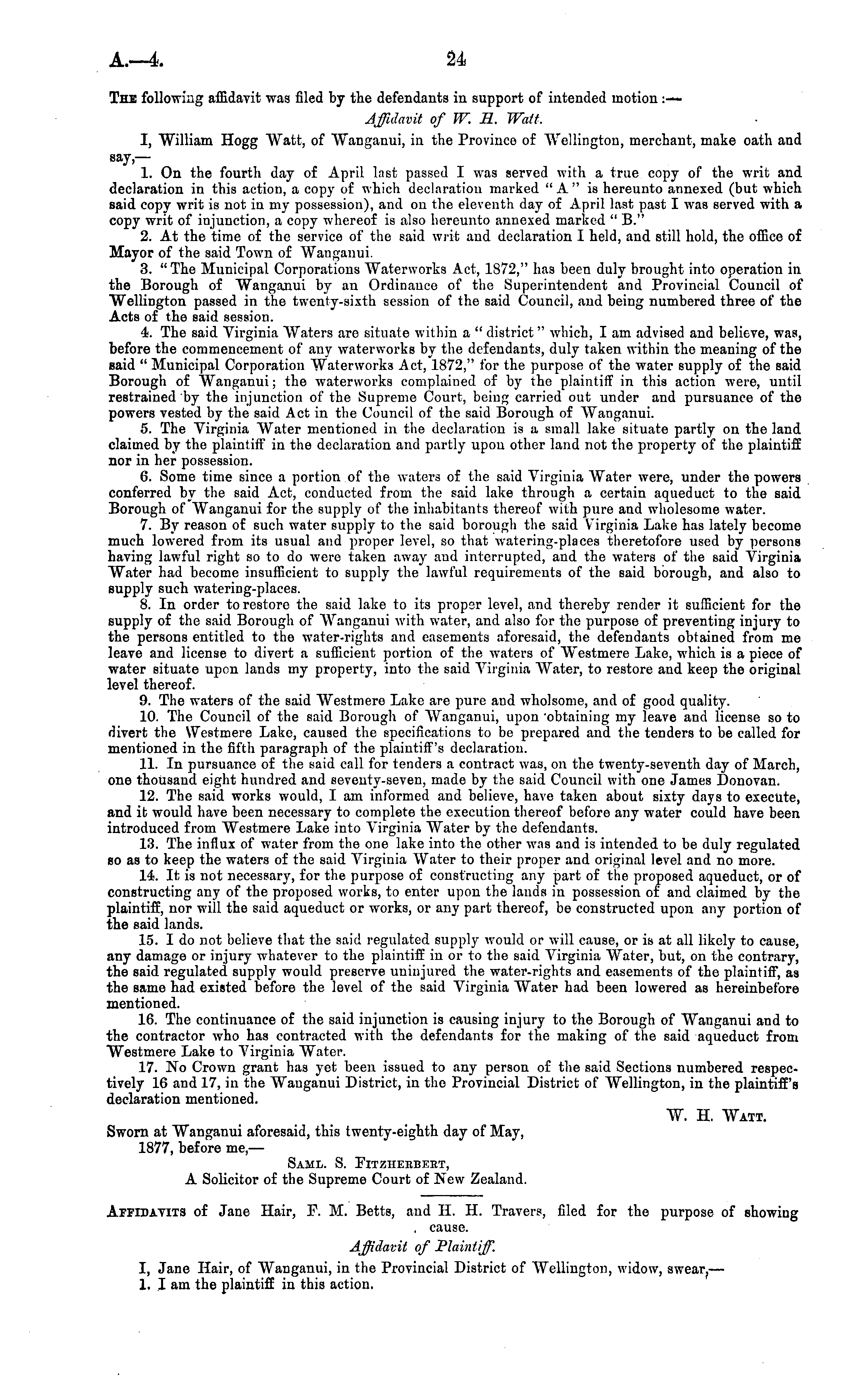 The following affidavit -was filed by the defendants in support of intended motion : — Affidavit of W. R. Watt. I, William Hogg "Watt, of Wanganui, in the Province of "Wellington, merchant, make oath and say,— 1. On the fourth day of April last passed I was served with a true copy of the writ and declaration in this action, a copy of which declaration marked "A" is hereunto annexed (but which said copv writ is not in my possession), and on the eleventh day of April last past I was served with a copy writ of injunction, a copy whereof is also hereunto annexed marked " B." 2. At the time of the service of the said writ and declaration I held, and still hold, the office of Mayor of the said Town of Wanganui. 3. " The Municipal Corporations Waterworks Act, 1872," has been duly brought into operation in the Borough of Wanganui by an Ordinauce of the Superintendent and Provincial Council of Wellington passed in the twenty-sixth session of the said Council, and being numbered three of the Acts of the said session. 4. The said Virginia Waters arc situate within a " district" which, lam advised and believe, was, before the commencement of any waterworks by the defendants, duly taken within the meaning of the said " Municipal Corporation Waterworks Act, 1872," for the purpose of the water supply of the said Borough of Wanganui; the waterworks complained of by the plaintiff in this action were, until restrained by the injunction of the Supreme Court, being carried out under and pursuance of the powers vested by the said Act in the Council of the said Borough of Wanganui. 5. The Virginia Water mentioned in the declaration is a small lake situate partly on the land claimed by the plaintiff in the declaration and partly upon other land not the property of the plaintiff nor in her possession. 6. Some time since a portion of the waters of the said Virginia Water were, under the powers conferred by the said Act, conducted from the said lake through a certain aqueduct to the said Borough of Wanganui for the supply of the inhabitants thereof with pure and wholesome water. 7. By reason of such water supply to the said borough the said Virginia Lake has lately become much lowered from its usual and proper level, so that watering-places theretofore used by persons having lawful right so to do were taken away and interrupted, and the waters of the said Virginia Water had become insufficient to supply the lawful requirements of the said borough, and also to supply such watering-places. 8. In order to restore the said lake to its proper level, and thereby render it sufficient for the supply of the said Borough of Wanganui with water, and also for the purpose of preventing injury to the persons entitled to the water-rights and easements aforesaid, the defendants obtained from me leave and license to divert a sufficient portion of the waters of Westmere Lake, which is a piece of water situate upon lands my property, into the said Virginia Water, to restore and keep the original level thereof. 9. The waters of the said Westmere Lake are pure and wholsome, and of good quality. 10. The Council of the said Borough of Wanganui, upon 'obtaining my leave and license so to divert the Westmere Lake, caused the specifications to be prepared and the tenders to be called for mentioned in the fifth paragraph of the plaintiff's declaration. 11. In pursuance of the said call for tenders a contract was, on the twenty-seventh day of March, one thousand eight hundred and seventy-seven, made by the said Council with one James Donovan. 12. The said works would, I am informed and believe, have taken about sixty days to execute, and it would have been necessary to complete the execution thereof before any water could have been introduced from Westmere Lake into Virginia Water by the defendants. 13. The influx of water from the one lake into the other was and is intended to be duly regulated so as to keep the waters of the said Virginia Water to their proper and original level and no more. 14. It is not necessary, for the purpose of constructing any part of the proposed aqueduct, or of constructing any of the proposed works, to enter upon the lands in possession of and claimed by the plaintiff, nor will the said aqueduct or works, or any part thereof, be constructed upon any portion of the said lands. 15. I do not believe that the said regulated supply would or will cause, or is at all likely to cause, any damage or injury whatever to the plaintiff in or to the said Virginia Water, but, on the contrary, the said regulated supply would preserve uninjured the water-rights and easements of the plaintiff, as the same had existed before the level of the said Virginia Water had been lowered as hereinbefore mentioned. 16. The continuance of the said injunction is causing injury to the Borough of Wanganui and to the contractor who has contracted with the defendants for the making of the said aqueduct from Westmere Lake to Virginia Water. 17. No Crown grant has yet been issued to any person of the said Sections numbered respectively 1G and 17, in the Wauganui District, in the Provincial District of Wellington, in the plaintiff's declaration mentioned. W. H. Watt. Sworn at Wanganui aforesaid, this twenty-eighth day of May, 1877, before me,— Saml. S. Fitzherbert, A Solicitor of the Supreme Court of New Zealand. Affidavits of Jane Hair, F. M. Betts, and H. 11. Travers, filed for the purpose of showing , cause. Affidavit of Plaintiffi. I, Jane Hair, of Wanganui, in the Provincial District of Wellington, widow, swear, — 1. I am the plaintiff in this action.