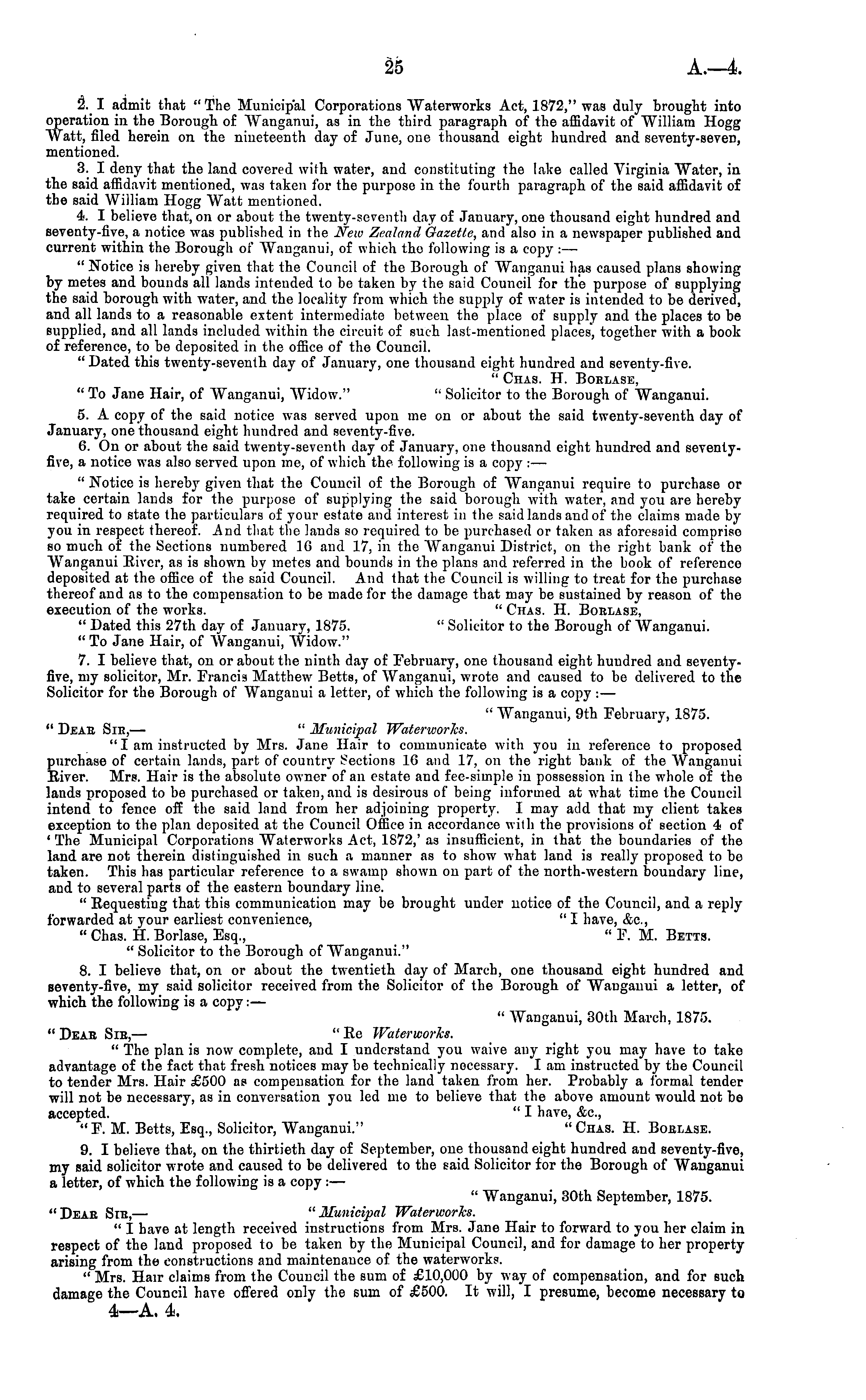 2. I admit that " The Municipal Corporations "Waterworks Act, 1872," was duly brought into operation in the Borough of Wanganui, as in the third paragraph of the affidavit of William Hogg Watt, filed herein on the nineteenth day of June, one thousand eight hundred and seventy-seven, mentioned. 3. I deny that the land covered wilh. water, and constituting the lake called Virginia "Water, in the said affidavit mentioned, was taken for the purpose in the fourth paragraph of the said affidavit of the said William Hogg "Watt mentioned. 4. I believe that, on or about the twenty-seventh day of January, one thousand eight hundred and seventy-five, a notice was published in the New Zealand Gazette, and also in a newspaper published and current within the Borough of "Wanganui, of which the following is a copy : — " Notice is hereby given that the Council of the Borough of "Wanganui has caused plans showing by metes and bounds all lands intended to be taken by the said Council for the purpose of supplying the said borough with water, and the locality from which the supply of water is intended to be derived, and all lands to a reasonable extent intermediate between the place of supply and the places to be supplied, and all lands included within the circuit of such last-mentioned places, together with a book of reference, to be deposited in the office of the Council. " Dated this twenty-seventh day of January, one thousand eight hundred and seventy-five. " CIIAS. H. BOELASE, " To Jane Hair, of "Wanganui, "Widow." " Solicitor to the Borough of "Wanganui. 5. A copy of the said notice was served upon me on or about the said twenty-seventh day of January, one thousand eight hundred and seventy-five. 6. On or about the said twenty-seventh day of January, one thousand eight hundred and seventyfive, a notice was also served upon me, of which the following is a copy : —■ " Notice is hereby given that the Council of the Borough of "Wanganui require to purchase or take certain lands for the purpose of supplying the said borough with water, and yo\i are hercbv required to state the particulars of your estate and interest in the said lands and of the claims made by 3 rou in respect thereof. And that the lands so required to be purchased or taken as aforesaid comprise so much of the Sections numbered ]G and 17, in the "Wanganui District, on the right bank of the "Wanganui Eiver, as is shown by metes and bounds in the plans and referred in the book of reference deposited at the oflice of the said Council. And that the Council is willing to treat for the purchase thereof and as to the compensation to be made for the damage that may be sustained by reason of the execution of the works. " Chas. H. Boelase, " Dated this 27th day of January, 1875. " Solicitor to the Borough of Wanganui. " To Jane Hair, of Wanganui, Widow." 7. I believe that, on or about the ninth day of February, one thousand eight hundred and seventyfive, my solicitor, Mr. Francis Matthew Betts, of Wanganui, wrote and caused to be delivered to the Solicitor for the Borough of Wangauui a letter, of which the following is a copy :— " Wanganui, 9th February, 1875. " Deae Sie, — " Municipal Waterworks. " I am instructed by Mrs. Jane Hair to communicate with you in reference to proposed purchase of certain lands, part of country Sections 1G and 17, on the right bank of the Wanganui Eiver. Mrs. Hair is the absolute owner of an estate and fee-simple in possession in the whole of the lands proposed to be purchased or taken, and is desirous of being informed at what time the Council intend to fence off the said land from her adjoining property. I may add that my client takes exception to the plan deposited at the Council Office in accordance with the provisions of section 4 of ' The Municipal Corporations Waterworks Act, 1872,' as insufficient, in that the boundaries of the land are not therein distinguished in such a manner as to show what land is really proposed to bo taken. This lias particular reference to a swamp shown on part of the north-western boundary line, and to several parts of the eastern boundary line. " Eequesting that this communication may be brought under notice of the Council, and a reply forwarded at 3'our earliest convenience, " I have, &c, " Chas. H. Borlase, Esq., " F. M. Betts. " Solicitor to the Borough of Wanganui." 8. I believe that, on or about the twentieth day of March, one thousand eight hundred and seventy-five, my said solicitor received from the Solicitor of the Borough of Wanganui a letter, of which the following is a copy:— " Wanganui, 30th March, 1875. " Deae Sie, — "Re Waterworks. " The plan is now complete, and I understand you waive any right you may have to take advantage of the fact that fresh notices may be technically necessary. lam instructed by the Council to tender Mrs. Hair £500 as compensation for the land taken from her. Probably a formal tender will not be necessary, as in conversation you led me to believe that the above amount would not be accepted. " I have, &c, "F. M. Betts, Esq., Solicitor, Wanganui." " Chas. H. Boelase. 9. I believe that, on the thirtieth day of September, one thousand eight hundred and seventj'-five, my said solicitor wrote and caused to be delivered to the said Solicitor for the Borough of Wanganui a letter, of which the following is a copy :— " Wanganui, 30th September, 1875. "Deae Sie, — "Municipal Waterworks. " I have at length received instructions from Mrs. Jane Hair to forward to you her claim in respect of the land proposed to be taken by the Municipal Council, and for damage to her property arising from the constructions and maintenance of the waterworks. " Mrs. Hair claims from the Council the sum of £10,000 by way of compensation, and for such damage the Council have offered only the sum of £500. It will, I presume, become necessary to 4—A. 4