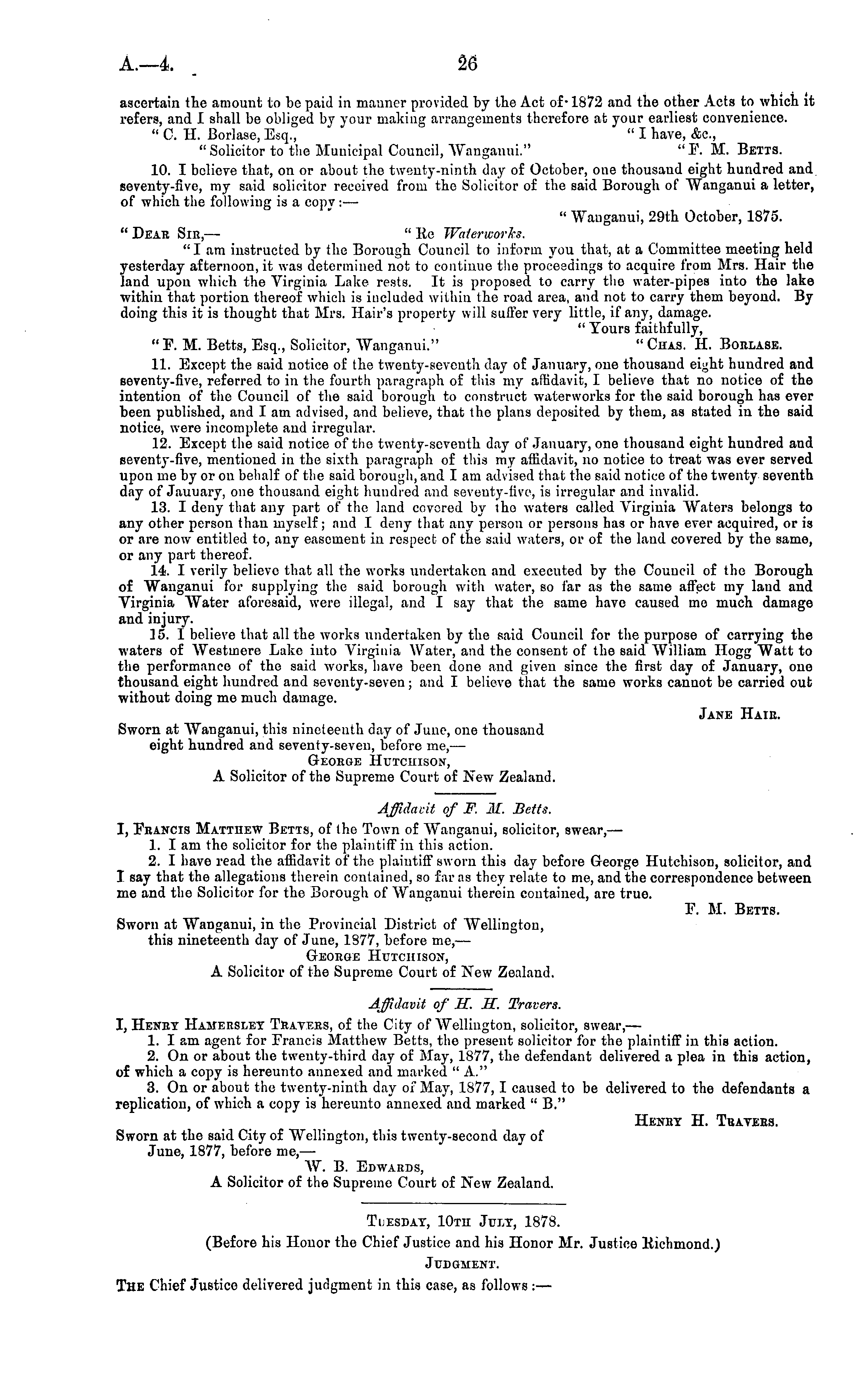 ascertain the amount to be paid in manner provided by the Act of-1872 and the other Acts to which it refers, and I shall be obliged by your making arrangements therefore at your earliest convenience. " C. H. Borlase, Esq., " I have, &c, "Solicitor to the Municipal Council, AVanganui." "F. M. Betts. 10. I believe that, on or about the twenty-ninth day of October, one thousand eight hundred and seventy-five, ray said solicitor received from the Solicitor of the said Borough of AVanganui a letter, of which the following is a copv : — " AVauganui, 29th October, 1875. " Dear Sin,— " Ke Waterworks. " I am instructed by the Borough Council to inform you that, at a Committee meeting held yesterday afternoon, it was determined not to continue the proceedings to acquire from Mrs. Hair the land upon which the Virginia Lake rests. It is proposed to carry the water-pipes into the lake within that portion thereof which is included within the road area, and not to carry them beyond. By doing this it is thought that Mrs. Hair's property will suffer very little, if any, damage. " Tours faithfully, " F. M. Betts, Esq., Solicitor, AVanganui." " Chas. H. Borlask. 11. Except the said notice of the twenty-seventh clay of January, one thousand eight hundred and seventy-five, referred to in the fourth paragraph of this my affidavit, I believe that no notice of the intention of the Council of the said borough to construct waterworks for the said borough has ever been published, and I am advised, and believe, that the plans deposited by them, as stated in the said notice, were incomplete and irregular. 12. Except the said notice of the twenty-seventh day of January, one thousand eight hundred and seventy-five, mentioned in the sixth paragraph of this my affidavit, no notice to treat was ever served upon me by or on behalf of the said borough, and I am advised that the said notice of the twenty seventh day of Jauuary, one thousand eight hundred and seventy-five, is irregular and invalid. 13. I deny that any part of the land covered by iho waters called Airginia Waters belongs to any other person than myself; and I deny that any person or persons has or have ever acquired, or is or are now entitled to, any easement in respect of the said waters, or of the land covered by the same, or any part thereof. 14. I verily believe that all the works undertaken and executed by the Council of the Borough of AVanganui for supplying the said borough with water, so far as the same affect my land and Virginia AVater aforesaid, were illegal, and I say that the same have caused me much damage and injury. 15. I believe that all the works undertaken by the said Council for the purpose of carrying the waters of AVestmere Lake into Virginia Water, and the consent of the said William Hogg AVatt to the performance of the said works, have been done and given since the first day of January, one thousand eight hundred and seventy-seven; and I believe that the same works cannot be carried oub without doing me much damage. Jane Hair. Sworn at AVanganui, this nineteenth day of June, one thousand eight hundred and seventy-seven, before me, — George Hutchison, A Solicitor of the Supreme Court of New Zealand. Affidavit of F. M. Betts. I, Francis Matthew Betts, of the Town of AVanganui, solicitor, swear, — 1. I am the solicitor for the plaintiff in this action. 2. I have read the affidavit of the plaintiff sworn this day before George Hutchison, solicitor, and I say that the allegations therein contained, so far as they relate to me, and the correspondence between me and the Solicitor for the Borough of AVanganui therein contained, are true. F. M. Betts. Sworn at AVanganui, in the Provincial District of AVellington, this nineteenth day of June, 1577, before me, — Geokoe Hutchison, A Solicitor of the Supreme Court of New Zealand. Affidavit of H. H. Travers. I, Henry Hamersley Travers, of the City of AVelliugton, solicitor, swear, — 1. I am agent for Francis Matthew Betts, the present solicitor for the plaintiff in this action. 2. On or about the twenty-third day of May, 1877, the defendant delivered a plea in this action, of which a copy is hereunto annexed and marked " A." 3. On or about the twenty-ninth day of May, 1877,1 caused to be delivered to the defendants a replication, of which a copy is hereunto annexed and marked " B." Henry H. Trayers. Sworn at the said City of AVellington, this twenty-second dav of June, 1877, before me, — AV. B. Edwards, A Solicitor of the Supreme Court of New Zealand. Tuesday, lOtii July, 1878. (Before his Honor the Chief Justice and his Honor Mr. Justice Kichmond.) Judgment. The Chief Justice delivered judgment in this case, as follows :—