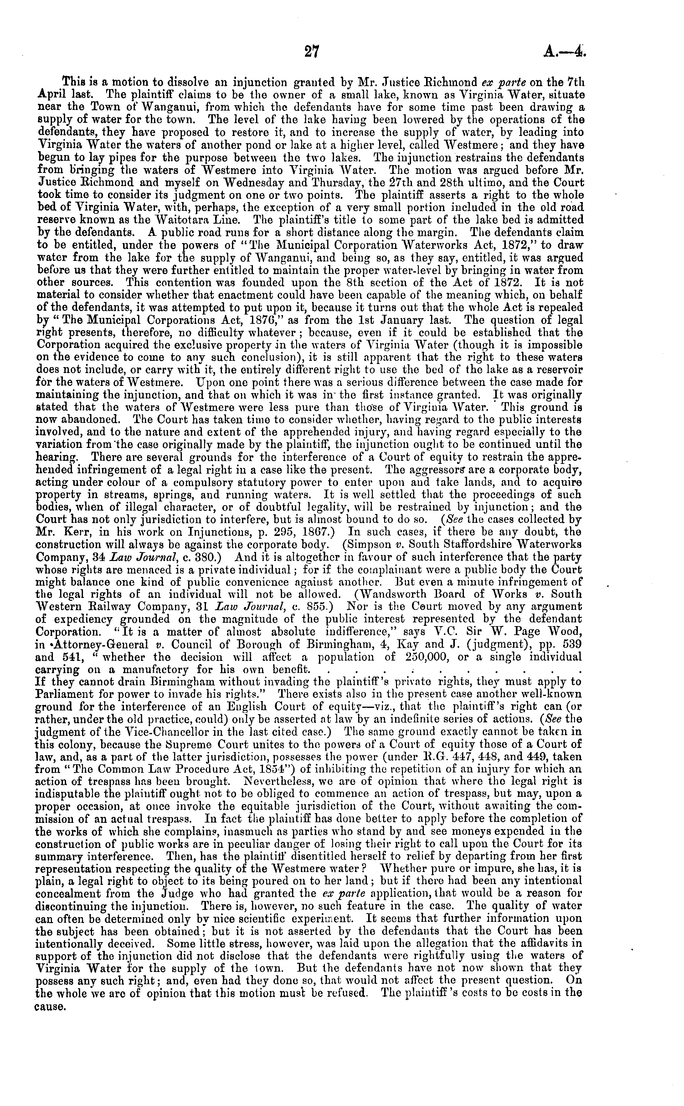 This is a motion to dissolve an injunction granted by Mr. Justice Richmond ex parte on the 7th April last. The plaintiff claims to be the owner of a small lake, known os Virginia Water, situate near the Town of Wanganui, from which the defendants have for some time past been drawing a supply of water for the town. The level of the lake having been lowered by the operations of the defendants, they have proposed to restore it, and to increase the supply of water, by leading into Virginia Water the waters of another pond or lake at a higher level, called Westmere; and they have begun to lay pipes for the purpose between the two lakes. The injunction restrains the defendants from bringing the waters of Westmere into Virginia Water. The motion was argued before Mr. Justice Richmond and myself on Wednesday and Thursday, the 27th and 28th ultimo, and the Court took time to consider its judgment on one or two points. The plaintiff asserts a right to the whole bed of Virginia Water, with, perhaps, the exception of a very small portion included in the old road reserve known as the Waitotara Line. Tho plaintiff's title to some part of the lake bed is admitted by the defendants. A public road runs for a short distance along the margin. The defendants claim to be entitled, under the powers of "The Municipal Corporation Waterworks Act, 1872," to draw water from tho lake for the supply of Wanganui, and being so, as they say, entitled, it was argued before us that they were further entitled to maintain the proper water-level by bringing in water from other sources. This contention was founded upon the Bth section of the Act of 1872. It is not material to consider whether that enactment could have been capable of the meaning which, on behalf ofthe defendants, it was attempted to put upon it, because it turns out that the whole Act is repealed by " The Municipal Corporations Act, 1876," as from the Ist January last. The question of legal right presents, therefore, no difficulty whatever ; because, even if it could be established that the Corporation acquired the exclusive property in the waters of Virginia Water (though it is impossible on the evidence to come to any such conclusion), it is still apparent that the right to these waters does not include, or carry with it, the entirely different right to use the bed of the lake as a reservoir for the waters of Westmere. Upon one point there was a serious difference between the case made for maintaining the injunction, and that on which it was in the first instance granted. It was originally stated that the waters of Westmere were less pure than those of Virginia Water. This ground is now abandoned. The Court has taken time to consider whether, having regard to the public interests involved, and to the nature and extent of the apprehended injury, and having regard especially to the variation from the case originally made by the plaintiff, tho injunction ought to be continued until the hearing. There are several grounds for tho interference of a Court of equity to restrain the apprehended infringement of a legal right in a ease like the present. The aggressors* are a corporate body, acting under colour of a compulsory statutory power to enter upon and take lands, and to acquire property in streams, springs, and running waters. It is well settled that the proceedings of such bodies, when of illegal character, or of doubtful legality, will be restrained by injunction; and the Court has not only jurisdiction to interfere, but is almost bound to do so. (See the cases collected by Mr. Kerr, in his work on Injunctions, p. 295, 1867.) In such cases, if there be any doubt, the construction will always be against the corporate body. (Simpson v. Soutii Staffordshire Waterworks Company, 34 Law Journal, c. 380.) And it is altogether in favour of such interference that the party whose rights aro menaced is a private individual; for if the complainant were a public body the Court might balance one kind of publie convenience against another. But even a minute infringement of the legal rights of an individual will not be allowed. (Wandsworth Board of Works v. South Western Railway Company, 31 Law Journal, c. 555.) Nor is tlie Ceurt moved by any argument of expediency grounded on the magnitude of the public interest represented by the defendant Corporation. "Itis a matter of almost absolute indifference," says V.C. Sir W. Page Wood, in 'Attorney-General v. Council of Borough of Birmingham, 4, Kay and J. (judgment), pp. 539 and 541, " whether the decision will affect a population of 250,000, or a single individual carrying on a manufactory for his own benefit. .......... If they cannot drain Birmingham without invading the plaintiff's private rights, they must apply to Parliament for power to invade his rights." There exists also in the present case another well-known ground forthe interference of an English Court of equity—viz., that the plaintiff's right can (or rather, under the old practice, could) only be asserted at law by an indefinite series of actions. (See tho judgment ofthe A rice-Chancellor in the last cited case.) The same ground exactly cannot be taken in this colony, because the Supreme Court unites to tho powers of a Court of equity those of a Court of law, and, as a part of the latter jurisdiction, possesses the power (under R.G. 447, 448, and 449, taken from "The Common Law Procedure Act, 1854") of inhibiting the repetition of an injury for which an action of trespass has been brought. Nevertheless, we are of opinion that where tho legal right is indisputable the plaintiff ought not to be obliged to commence an action of trespass, but may, upon a proper occasion, at once invoke the equitable jurisdiction of the Court, without awaiting the commission of an actual trespass. In fact tlie plaintiff has done better to apply before the completion of the works of which she complains, inasmuch as parties who stand by and see moneys expended iu the construction of p