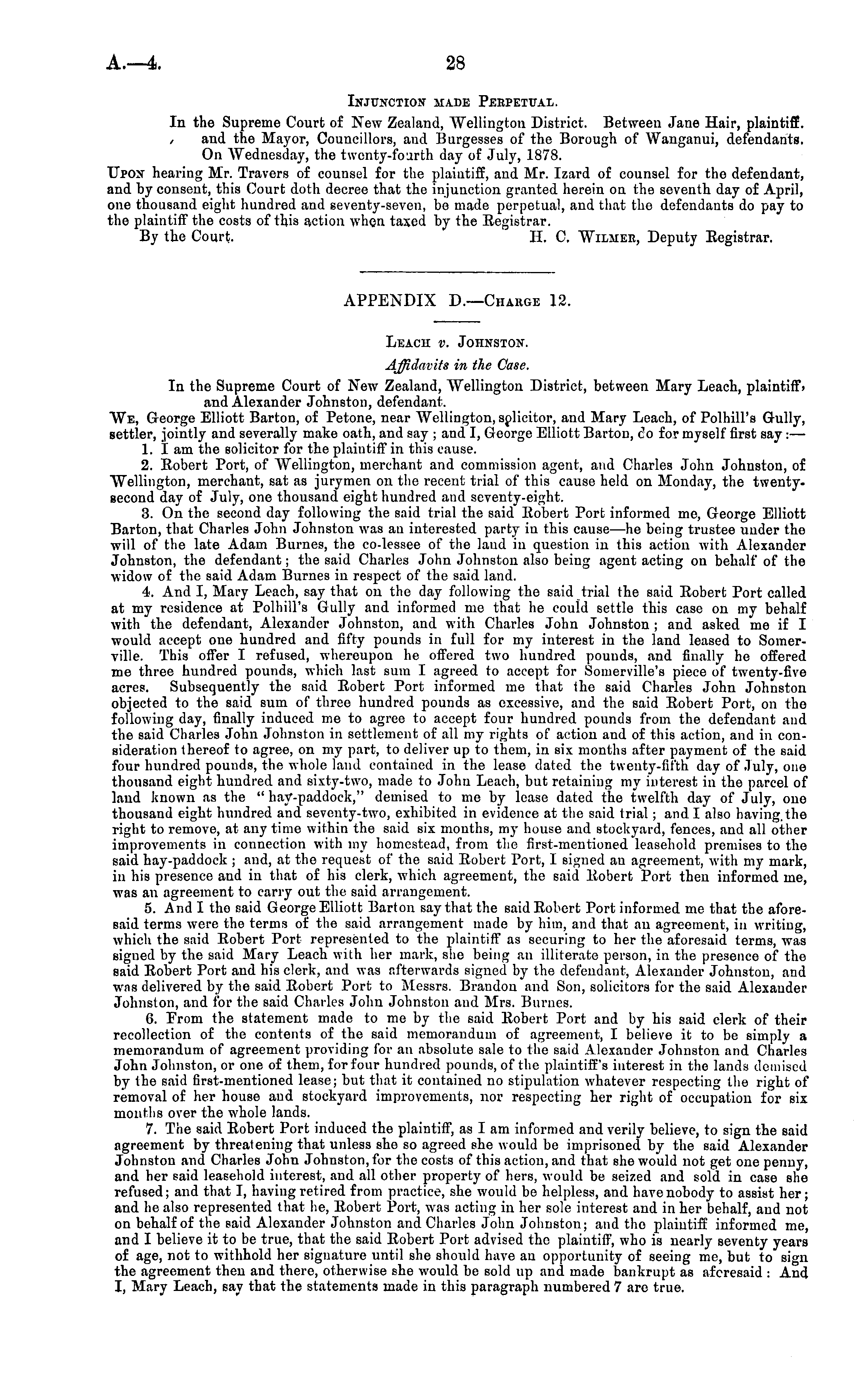 APPENDIX D.—Charge 12. Leach v. Johnston. Affidavits in the Case. In the Supreme Court of New Zealand, "Wellington District, between Mary Leach, plaintiff; and Alexander Johnston, defendant. We, G-eorge Elliott Barton, of Petone, near Wellington, solicitor, and Mary Leach, of Polhill's Gully, settler, jointly and severally make oath, and say ; and I, George Elliott Barton, c"o for myself first say : — 1. I am the solicitor for the plaintiff in this cause. 2. Robert Port, of Wellington, merchant and commission agent, and Charles John Johnston, of Wellington, merchant, sat as jurymen on the recent trial of this cause held on Monday, the twenty, second day of July, one thousand eight hundred and seventy-eight. 3. On the second day following the said trial the said Robert Port informed me, George Elliott Barton, that Charles John Johnston was an interested party in this cause —he being trustee under the will of the late Adam Burnes, the co-lessee of the laud in question in this action with Alexander Johnston, the defendant; the said Charles John Johnston also being agent acting on behalf of the widow of the said Adam Burnes in respect of the said land. 4. And I, Mary Leach, say that on the day following the said trial the said Robert Port called at my residence at Polhill's Gully and informed me that he could settle this case on my behalf with the defendant, Alexander Johnston, and with Charles John Johnston ; and asked me if I would accept one hundred and fifty pounds in full for my interest in the land leased to Somerville. This offer I refused, whereupon he offered two hundred pounds, and finally he offered me three hundred pounds, which last sum I agreed to accept for Soiuerville's piece of twenty-five acres. Subsequently the said Robert Port informed me that the said Charles John Johnston objected to the said sum of three hundred pounds as excessive, and the said Robert Port, on the following day, finally induced me to agree to accept four hundred pounds from the defendant and the said Charles John Johnston in settlement of all my rights of action and of this action, and in consideration thereof to agree, on my part, to deliver up to them, in six months after payment of the said four hundred pounds, the whole land contained in the lease dated the twenty-fifth dav of .luly, one thousand eight hundred and sixty-two, made to John Leach, but retaining my interest in the parcel of land known as the " hay-paddock," demised to me by lease dated the twelfth day of July, one thousand eight hundred and seventy-two, exhibited in evidence at the said (rial; and I also having the right to remove, at any time within the said six months, my house and stockyard, fences, and all other improvements in connection with my homestead, from the first-mentioned leasehold premises to the said hay-paddock ; and, at the request of the said Robert Port, I signed au agreement, with my mark, in his presence and in that of his clerk, which agreement, the said Robert Port then informed ine, was an agreement to carry out the said arrangement. 5. And I the said George Elliott Barton say that the said Robert Port informed me that the aforesaid terms wore the terms of the said arrangement made by him, and that au agreement, in writing, which the said Robert Port represented to the plaintiff as securing to her the aforesaid terms, was signed by the said Mary Leach with her mark, she being an illiterate person, in the presence of the said Robert Port and his clerk, and was afterwards signed by the defendant, Alexander Johnston, and was delivered by the said Robert Port to Messrs. Brandon and Son, solicitors for the said Alexander Johnston, and for the said Charles John Johnston and Mrs. Burnes. 6. From the statement made to me by the said Robert Port and by his said clerk of their recollection of the contents of the said memorandum of agreement, I believe it to be simply a memorandum of agreement providing for an absolute sale to the said Alexander Johnston and Charles John Johnston, or one of them, for four hundred pounds, of the plaintiff's interest in the lands demised by the said first-mentioned lease; but that it contained no stipulation whatever respecting the right of removal of her house and stockyard improvements, nor respecting her right of occupation for six months over the whole lands. 7. The said Robert Port induced the plaintiff, as I am informed and verily believe, to sign the said agreement by threatening that unless she so agreed she would be imprisoned by the said Alexander Johnston and Charles John Johnston, for the costs of this action, and that she would not get one penny, and her said leasehold interest, and all other property of hers, would be seized and sold in case she refused; and that I, having retired from practice, she would be helpless, and have nobody to assist her; and he also represented that he, Robert Port, was acting in her sole interest and in her behalf, and not on behalf of the said Alexander Johnston and Charles John Johnston; and the plaintiff informed me, and I believe it to be true, that the said Robert Port advised the plaintiff, who is nearly seventy years of age, not to withhold her signature until she should have au opportunity of seeing me, but to sign the agreement then and there, otherwise she would be sold up and made bankrupt as afcresaid : And I, Mary Leach, say that the statements made in this paragraph numbered 7 are true.