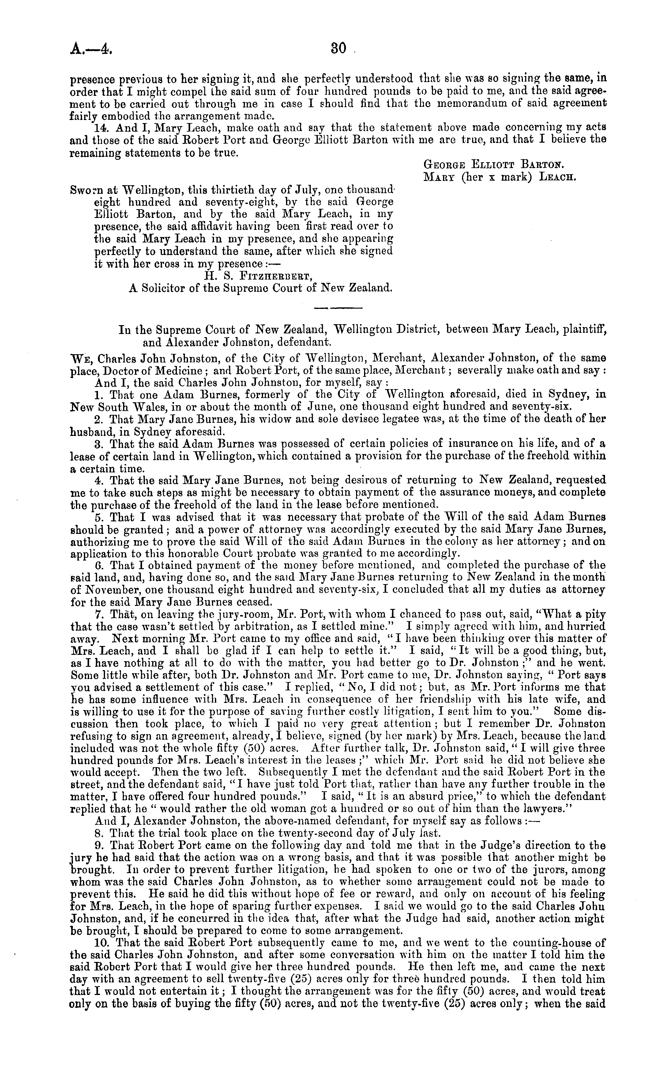 presence previous to her signing it, and slie perfectly understood that she was so signing the same, in order that I might compel the said sum of four hundred pounds to be paid to me, and the said agreement to be carried out through me in case I should find that the memorandum of said agreement fairly embodied the arrangement made. 14. And I, Mary Leach, make oath and say that the statement above made concerning my acts and those of the said Kobert Port and George Elliott Barton with me are true, and that I believe the remaining statements to be true. Georoe Elliott Barton. Maky (her x mark) Leach. Sworn at Wellington, this thirtieth day of July, one thousandeight hundred and seventy-eight, by the said George Elliott Barton, and by the said Mary Leach, in my presence, the said affidavit having been first read over to the said Mary Leach in my presence, and she appearing perfectly to understand the same, after which she signed it with her cross in my presence : —■ H. S. FITZIIEBUERT, A Solicitor of the Supremo Court of New Zealand. Iu the Supreme Court of New Zealand, "Wellington District, between Mary Leach, plaintiff, and Alexander Johnston, defendant. "We, Charles John Johnston, of the City of "Wellington, Merchant, Alexander Johnston, of the same place, Doctor of Medicine ; and Eobert Port, of the same place, Merchant; severally make oath and say : And I, the said Charles John Johnston, for myself, say : 1. That one Adam Burnes, formerly of the City of "Wellington aforesaid, died in Sydney, in New South Wales, in or about the month of June, one thousand eight hundred and seventy-six. 2. That Mary Jane Burnes, his w ridow and sole devisee legatee was, at the time of the death of her husband, in Sydney aforesaid. 3. That the said Adam Burnes was possessed of certain policies of insurance on his life, and of a lease of certain land in Wellington, which contained a provision for the purchase of the freehold within a certain time. 4. That the said Mary Jane Burnes, not being desirous of returning to New Zealand, requested me to take such steps as might he necessary to obtain payment of the assurance moneys, and complete the purchase of the freehold of the land in the lease before mentioned. 5. That I was advised that it was necessary that probate of the Will of the said Adam Burnes should be granted ; and a power of attorney was accordingly executed by the said Mary Jane Burnes, authorizing me to prove the said Will of the said Adam Burnes in the colony as her attorney; and on application to this honorable Court probate was granted to me accordingly. G. That I obtained payment of the money before mentioned, and completed the purchase of the said land, and, having done so, and the said Mary Jane Burnes returning to New Zealand in the month of November, one thousand eight hundred and seventy-six, I concluded that all my duties as attorney for the said Mary Jane Burnes ceased. 7. That, on leaving the jury-room, Mr. Port, with whom I chanced to pass out, said, "What a pity that the case wasn't settled by arbitration, as I settled mine." I simply agreed with him, and hurried away. Next morning Mr. Port came to my office and said, " I have been thinking over this matter of Mrs. Leach, and I shall bo glad if I can help to settle it." I said, "It will be a good thing, but, as I have nothing at all to do with the matter, you had better go to Dr. Johnston ;" and he went. Some little while after, both Dr. Johnston and Mr. Port came to me, Dr. Johnston saying, " Port says you advised a settlement of this case." I replied, "No, I did not; but. as Mr. Port informs me that he has some influence with Mrs. Leach in consequence of her friendship with his late wife, and is willing to use it for the purpose of saving further costly litigation, I sent him to you." Some discussion then took place, to which I paid no very great attention ; but I remember Dr. Johnston refusing to sign an agreement, already, I believe, signed (b} r her mark) by Mrs. Leach, because the land included was not the whole fifty (50) acres. After further talk, Dr. Johnston said, " I will give three hundred pounds for Mrs. Leach's interest in the leases ;" which Mr. Port said he did not believe she would accept. Then the two left. Subsequently I met the defendant and the said Eobert Port in the street, and the defendant said, "I have just told Port that, rather than have any further trouble in the matter, I have offered four hundred pounds." I said, "Itis an absurd price," to which the defendant replied that he " would rather the old woman got a hundred or so out of him than the lawyers." And I, Alexander Johnston, the above-named defendant, for myself say as follows : — 8. That the trial took place on the twenty-second day of July last. 9. That Robert Port came on the following day and told me that in the Judge's direction to the jury he had said that the action was on a wrong basis, and that it was possible that another might be brought, In order to prevent further litigation, he had spoken to one or two of the jurors, among whom was the said Charles John Johnston, as to whether some arrangement could not be made to prevent this. He said he did this without hope of fee or reward, and only on account of his feeling for Mrs. Leach, in the hope of sparing further expenses. I said we would go to the said Charles Johu Johnston, and, if he concurred in the idea that, after what the Judge had said, another action might be brought, I should be prepared to come to some arrangement. 10. That the said Eobert Port subsequently came to me, and we went to the counting-house of the said Charles John Johnston, and after some conversation with him on the matter I told him the said Eobert Port that I would give her three hundred pounds. He then left me, and came the next day with an agreement to sell twenty-five (25) acres only for three hundred pounds. I then told him that I would not entertain it; I thought the arrangement was for the fifty (50) 