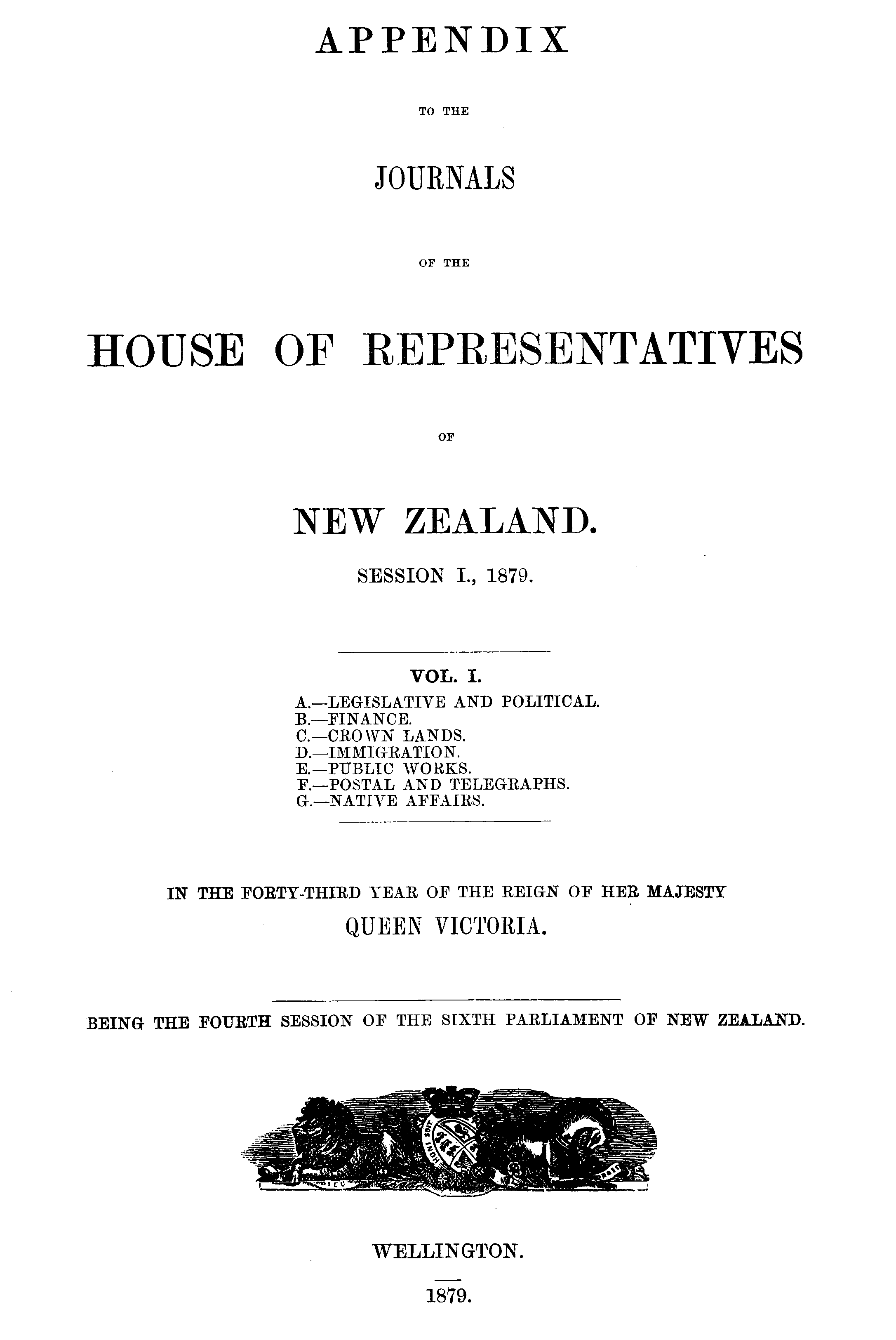 VOL. I. A.—LEGISLATIVE AND POLITICAL. B.—FINANCE. O—CROWN LANDS. D.—IMMIGRATION. E.—PUBLIC WORKS. I\—POSTAL AND TELEGRAPHS. G.—NATIVE AFFAIRS.