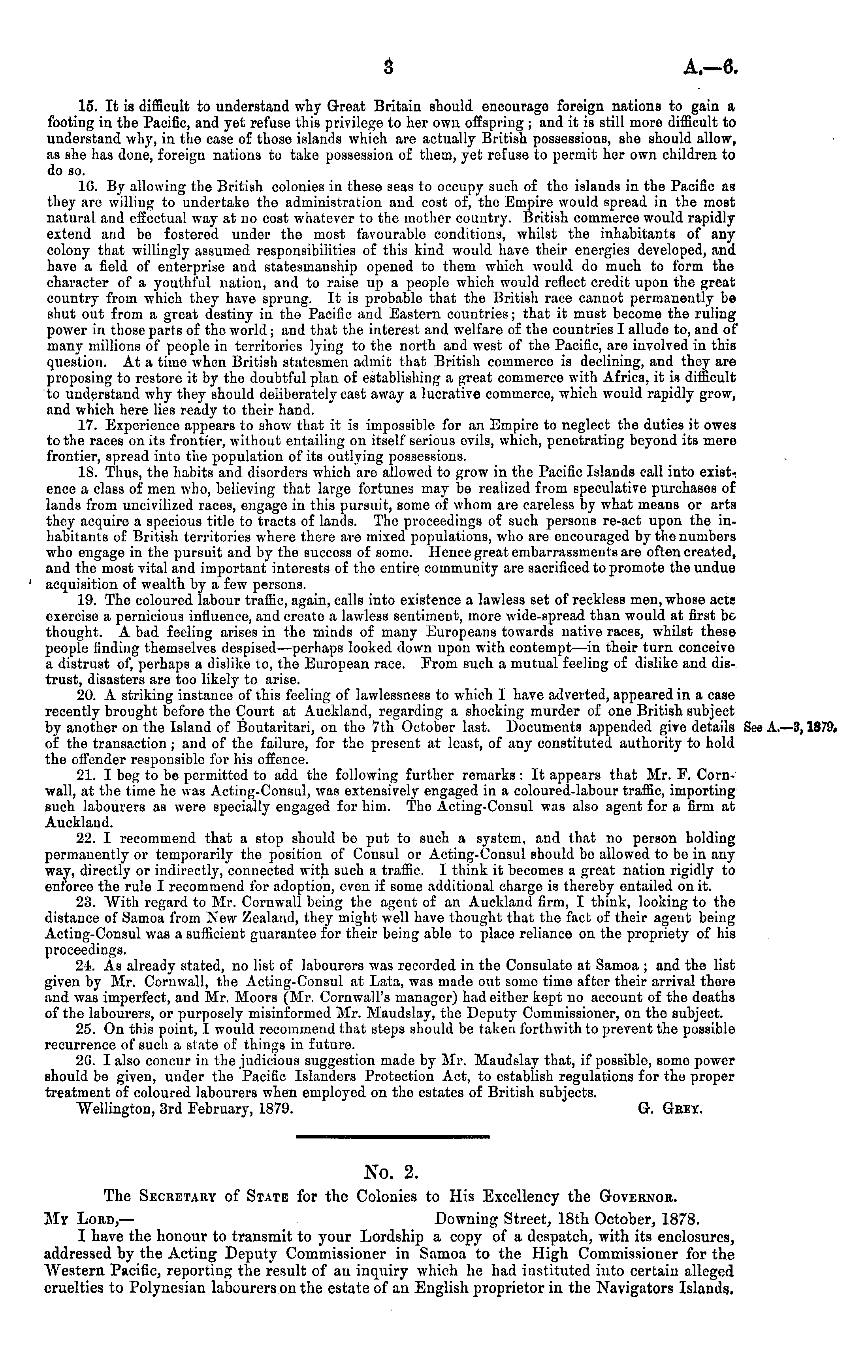 No. 2. The Secretary of State for the Colonies to His Excellency the Governor. My Lord, — Downing Street, 18th October, 1878. I have the honour to transmit to your Lordship a copy of a despatch, with its enclosures, addressed by the Acting Deputy Commissioner in Samoa to the High Commissioner for the Western Pacific, reporting the result of an inquiry which he had instituted into certain alleged cruelties to Polynesian labourers on the estate of an English proprietor in the Navigators Islands.