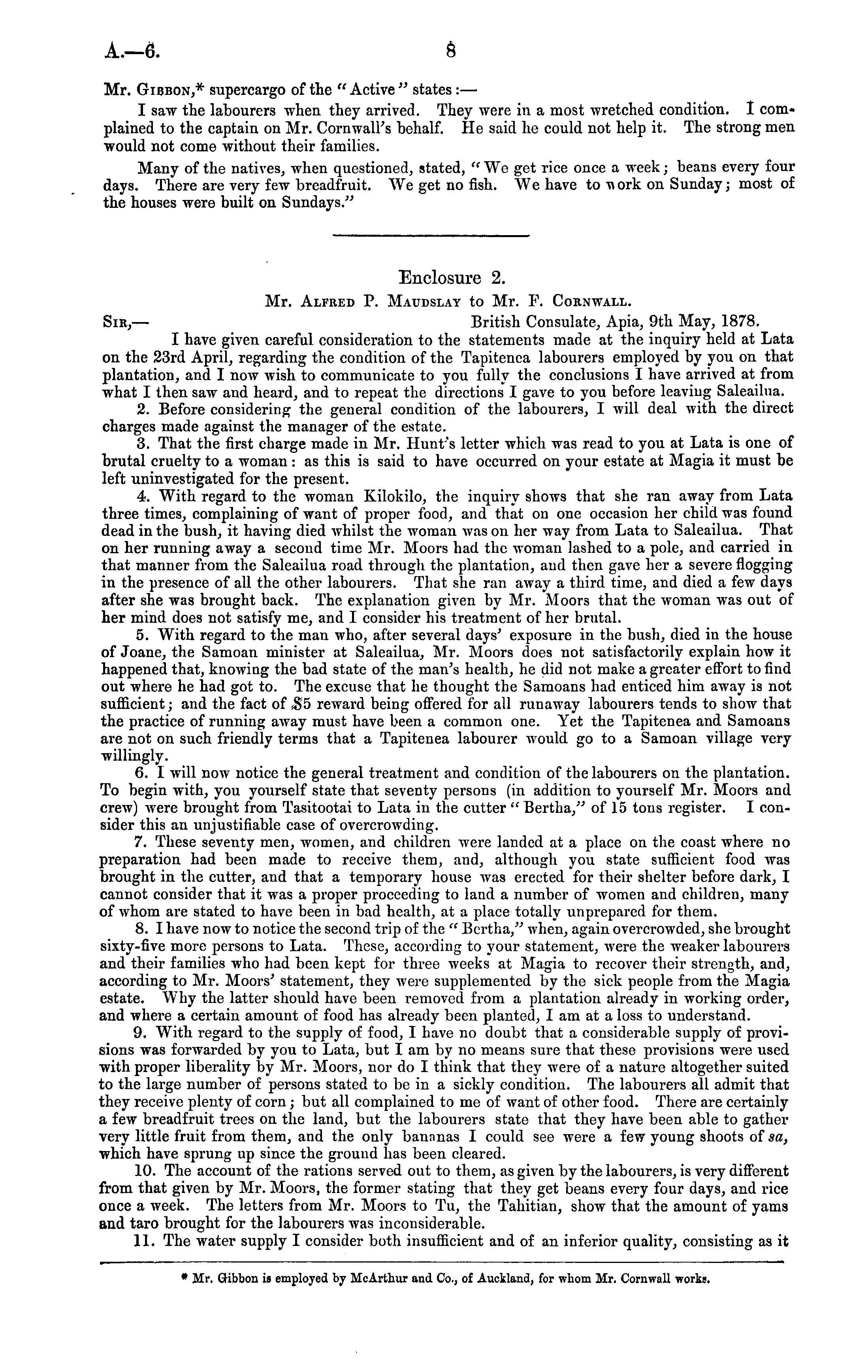 Enclosure 2. Mr. Alfred P. Maudslay to Mr. F. Cornwall. Sir,— British Consulate, Apia, 9th May, 1878. I have given careful consideration to the statements made at the inquiry held at Lata on the 23rd April, regarding the condition of the Tapitenca labourers employed by you on that plantation, and I now wish to communicate to you fully the conclusions I have arrived at from what I then saw and heard, and to repeat the directions I gave to you before leaving Saleailua. 2. Before considering the general condition of the labourers, I will deal with the direct charges made against the manager of the estate. 3. That the first charge made in Mr. Hunt's letter which was read to you at Lata is one of brutal cruelty to a woman : as this is said to have occurred on your estate at Magia it must be left uninvestigated for the present. 4. With regard to the woman Kilokilo, the inquiry shows that she ran away from Lata three times, complaining of want of proper food, and that on one occasion her child was found dead in the bush, it having died whilst the woman was on her way from Lata to Saleailua. That on her running away a second time Mr. Moors had the woman lashed to a pole, and carried in that manner from the Saleailua road through the plantation, and then gave her a severe flogging in the presence of all the other labourers. That she ran away a third time, and died a few days after she was brought back. The explanation given by Mr. Moors that the woman was out of her mind does not satisfy me, and I consider his treatment of her brutal. 5. With regard to the man who, after several days' exposure in the bush, died in the bouse of Joane, the Samoan minister at Saleailua, Mr. Moors does not satisfactorily explain how it happened that, knowing the bad state of the man's health, he did not make a greater effort to find out where he had got to. The excuse that he thought the Samoans had enticed him away is not sufficient; and the fact of <S5 reward being offered for all runaway labourers tends to show that the practice of running away must have been a common one. Yet the Tapitcnea and Samoans are not on such friendly terms that a Tapitenea labourer would go to a Samoan village very willingly. 6. I will now notice the general treatment and condition of the labourers on the plantation. To begin with, you yourself state that seventy persons (in addition to yourself Mr. Moors and crew) were brought from Tasitootai to Lata in the cutter "Bertha," of 15 tons register. I consider this an unjustifiable case of overcrowding. 7. These seventy men, women, and children were landed at a place on the coast whei'e no preparation had been made to receive them, and, although you state sufficient food was brought in the cutter, and that a temporary house was erected for their shelter before dark, I cannot consider that it was a proper proceeding to land a number of women and children, many of whom are stated to have been in bad health, at a place totally unprepared for them. 8. I have now to notice the second trip of the " Bertha," when, again overcrowded, she brought sixty-five more persons to Lata. These, according to your statement, were the weaker labourers and their families who had been kept for three weeks at Magia to recover their strength, and, according to Mr. Moors' statement, they were supplemented by the sick people from the Magia estate. Why the latter should have been removed from a plantation already in working order, and where a certain amount of food has already been jDlantod, I am at a loss to understand. 9. With regard to the supply of food, I have no doubt that a considerable supply of provisions was forwarded by you to Lata, but I am by no means sure that these provisions were used with proper liberality by Mr. Moors, nor do I think that they were of a nature altogether suited to the large number of persons stated to be in a sickly condition. The labourers all admit that they receive plenty of corn ; but all complained to me of want of other food. There are certainly a few breadfruit trees on the land, but the labourers state that they have been able to gather very little fruit from them, and the only bananas I could see were a few young shoots of sa, which have sprung up since the ground has been cleared. 10. The account of the rations served out to them, as given by the labourers, is very different from that given by Mr. Moors, the former stating that they get beans every four days, and rice once a week. The letters from Mr. Moors to Tv, the Tahitian, show that the amount of yams and taro brought for the labourers was inconsiderable. 11. The water supply I consider both insufficient and of an inferior quality, consisting as it * Mr. Oibbon is employed by McArthur and Co., of Auckland, for whom Mr. Cornwall works.