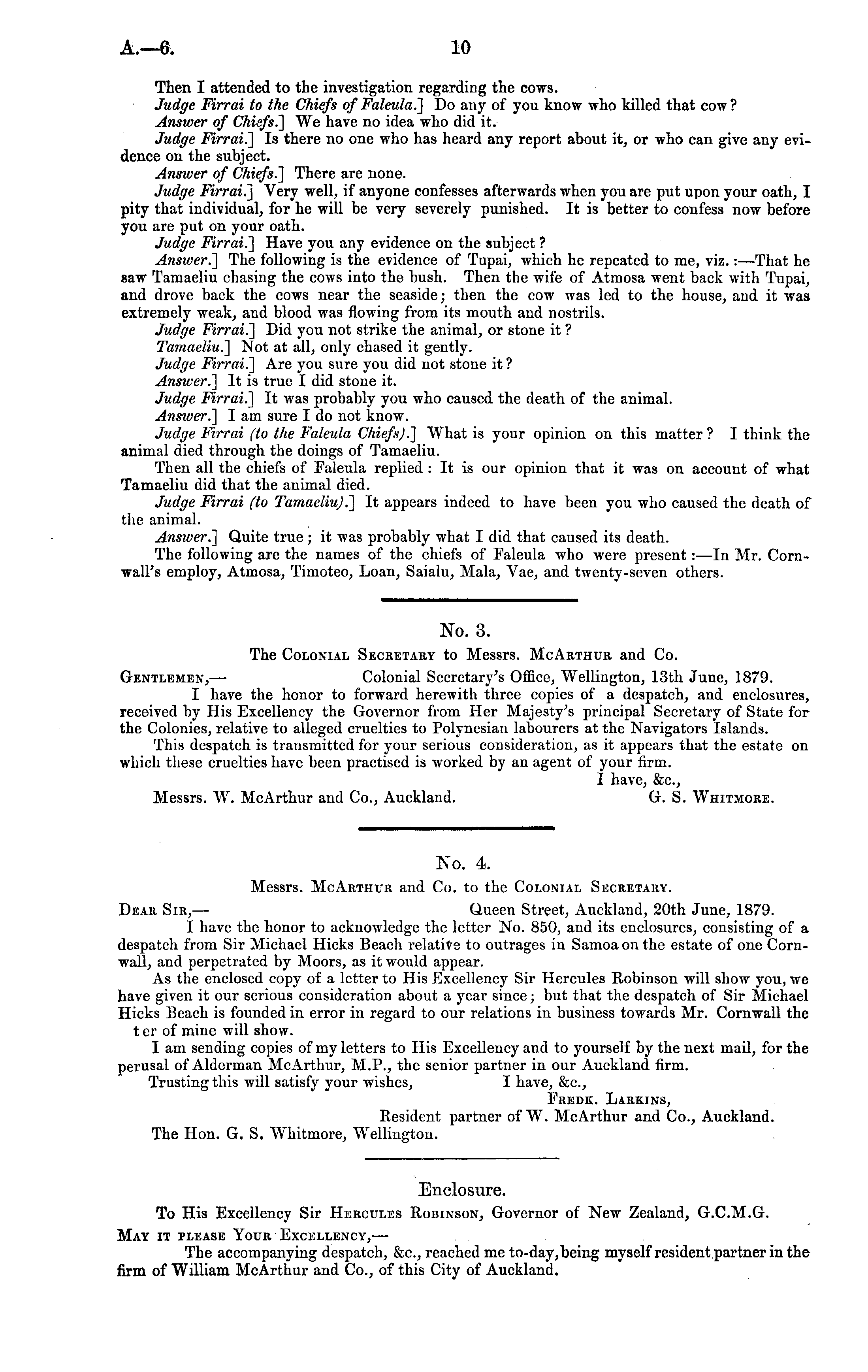 No. 3. The Colonial Secretary to Messrs. McArthur and Co. Gentlemen, — Colonial Secretary's Office, Wellington, 13th June, 1879. I have the honor to forward herewith three copies of a despatch, and enclosures, received by His Excellency the Governor from Her Majesty's principal Secretary of State for the Colonies, relative to alleged cruelties to Polynesian labourers at the Navigators Islands. This despatch is transmitted for your serious consideration, as it appears that the estate on which these cruelties have been practised is worked by an agent of your firm. I have, &c., Messrs. W. McArthur and Co., Auckland. G. S. Whitmore.