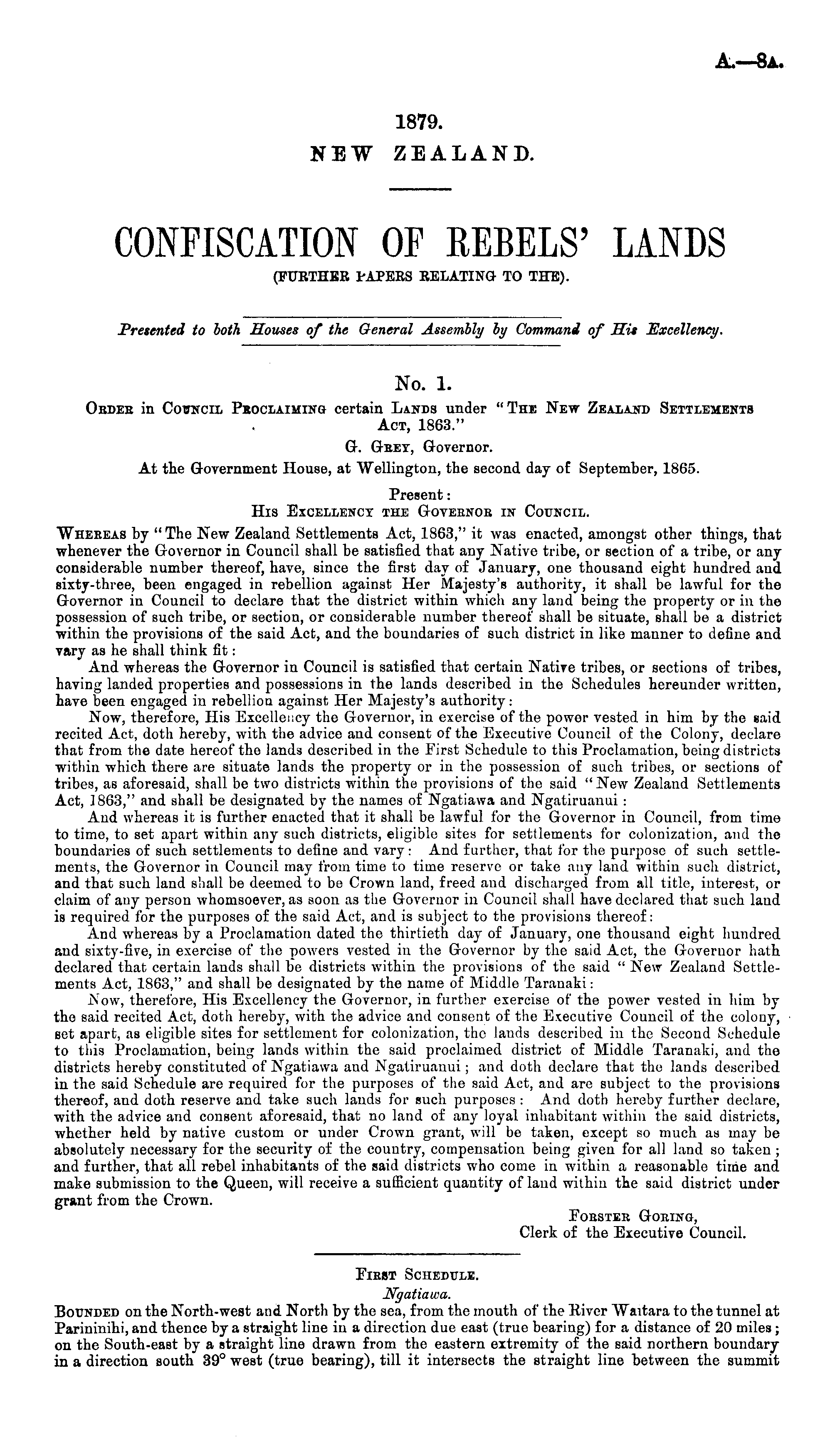 Presented to both Houses of the General Assembly by Command of His Excellency. No. 1. Obdee in Council Proclaiming certain Lands under "The New Zealand Settlements Act, 1863." G. Geey, Governor. At the Government House, at Wellington, the second day of September, 1865. Present: His Excellency the Goveenoe in Council. Wheeeas by " The New Zealand Settlements Act, 1863," it was enacted, amongst other things, that whenever the Governor in Council shall be satisfied that any Native tribe, or section of a tribe, or any considerable number thereof, have, since the first day of January, one thousand eight hundred and sixty-three, been engaged in rebellion against Her Majesty's authority, it shall be lawful for the Governor in Council to declare that the district within which any land being the property or in the possession of such tribe, or section, or considerable number thereof shall be situate, shall be a district within the provisions of the said Act, and the boundaries of such district in like manner to define and vary as he shall think fit: And whereas the Governor in Council is satisfied that certain Native tribes, or sections of tribes, having landed properties and possessions in the lands described in the Schedules hereunder written, have been engaged in rebellion against Her Majesty's authority: Now, therefore, His Excellency the Governor, in exercise of the power vested in him by the said recited Act, doth hereby, with the advice and consent of the Executive Council of the Colony, declare that from the date hereof the lands described in the First Schedule to this Proclamation, being districts within which there are situate lands the property or in the possession of such tribes, or sections of tribes, as aforesaid, shall be two districts within the provisions of the said "New Zealand Settlements Act, 1863," and shall be designated by the names of Ngatiawa and Ngatiruanui : And whereas it is further enacted that it shall be lawful for the Governor in Council, from time to time, to set apart within any such districts, eligible sites for settlements for colonization, and the boundaries of such settlements to define and vary : And further, that for the purpose of such settlements, the Governor in Council may from time to time reserve or take any land within such district, and that such land shall be deemed to be Crown land, freed and discharged from all title, interest, or claim of any person whomsoever, as soon as the Governor in Council shall have declared that such laud is required for the purposes of the said Act, and is subject to the provisions thereof: And whereas by a Proclamation dated the thirtieth day of January, one thousand eight hundred and sixty-five, in exercise of the powers vested in the Governor by the said Act, the Governor hath declared that certain lands shall be districts within the provisions of the said " New Zealand Settlements Act, 1863," and shall be designated by the name of Middle Taranaki: Now, therefore, His Excellency the Governor, in further exercise of the power vested in him by the said recited Act, doth hereby, with the advice and consent of the Executive Council of the colony, set apart, as eligible sites for settlement for colonization, tho lands described in the Second Schedule to this Proclamation, being lands within the said proclaimed district of Middle Taranaki, and the districts hereby constituted of Ngatiawa aud Ngatiruanui; and doth declare that the lands described in the said Schedule are required for the purposes of the said Act, and are subject to the provisions thereof, and doth reserve and take such lauds for such purposes : And doth hereby further declare, with the advice and consent aforesaid, that no land of any loyal inhabitant within the said districts, whether held by native custom or under Crown grant, will be taken, except so much as may be absolutely necessary for the security of the country, compensation being given for all land so taken; and further, that all rebel inhabitants of the said districts who come in within a reasonable time and make submission to the Queen, will receive a sufficient quantity of land within the said district under grant from the Crown. FOESTEE GoEING, Clerk of the Executive Council. Fiebt Schedule. Ngatiawa. Bounded on the North-west and North by the sea, from the mouth of the River AVaitara to the tunnel at Parininihi, and thence by a straight line in a direction due east (true bearing) for a distance of 20 miles; on the South-east by a straight line drawn from the eastern extremity of the said northern boundary in a direction south 39° west (true bearing), till it intersects the straight line between the summit