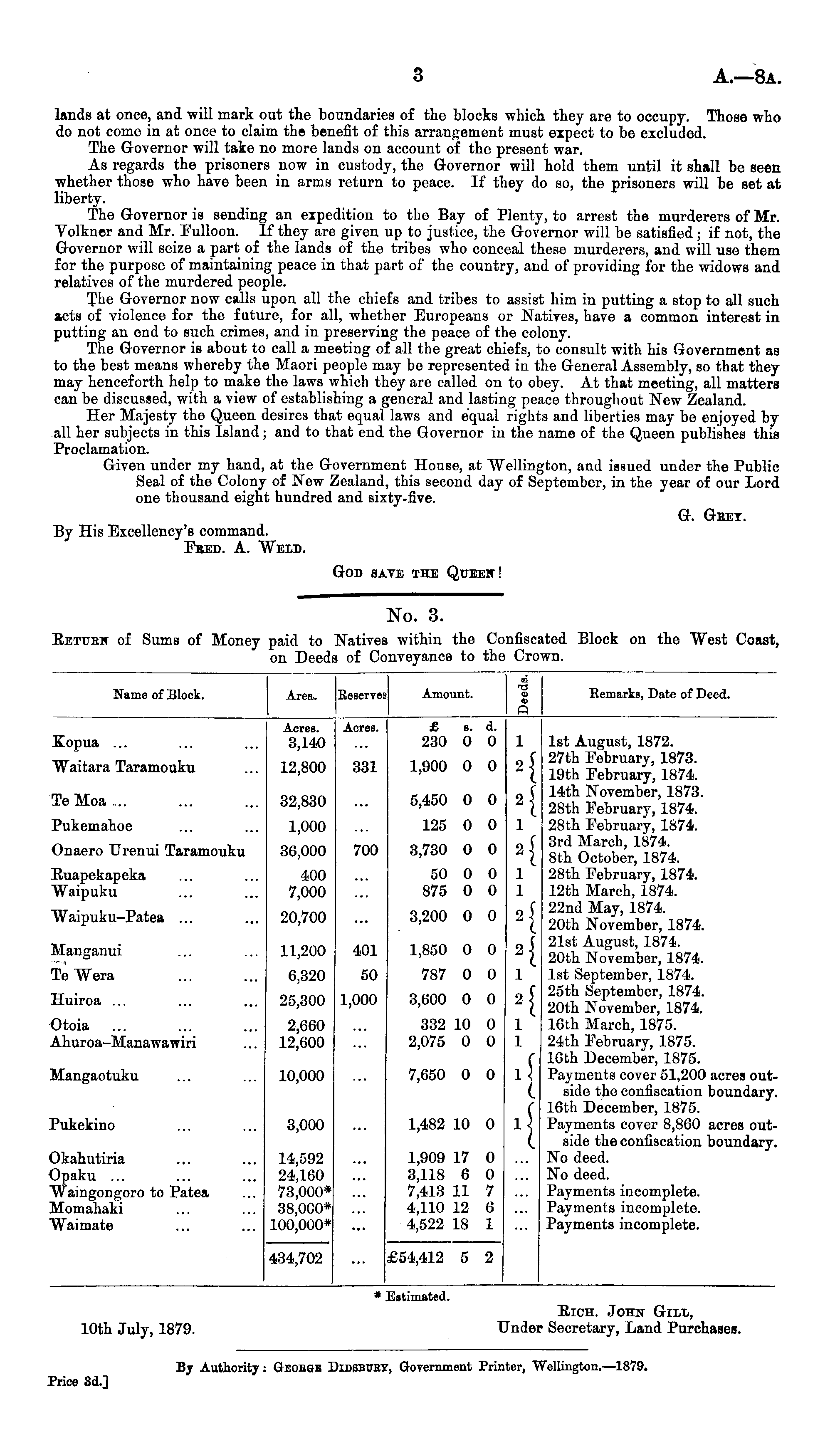 No. 3. RETURN of Sums of Money paid to Natives within the Confiscated Block on the West Coast, on Deeds of Conveyance to the Crown.