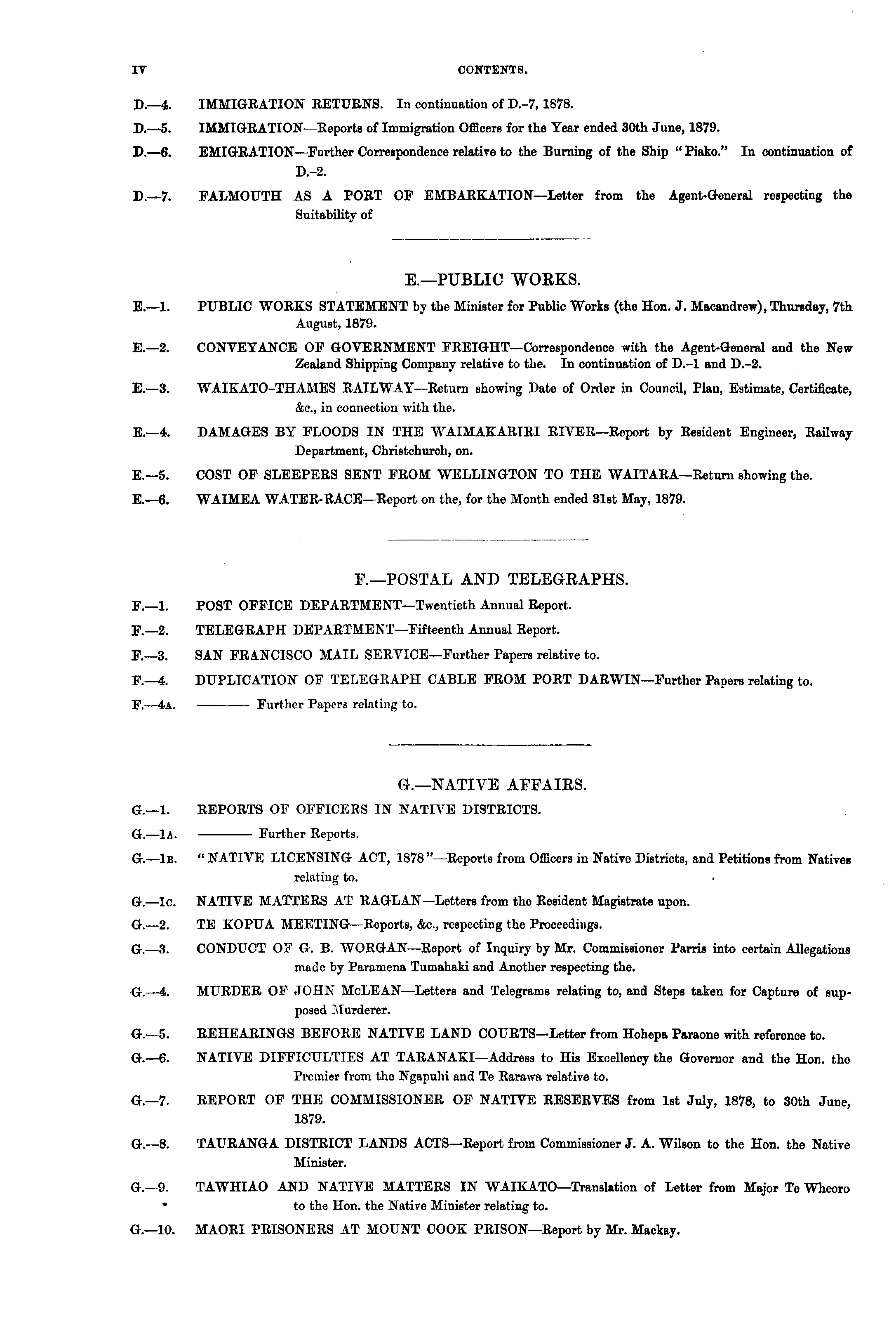D.—4. IMMIGRATION RETURNS. In continuation of D.-7, 1878. D— 5. IMMIGRATION—Reports of Immigration Officers for the Year ended 30th June, 1879. D.—6. EMIGRATION —Further Correspondence relative to the Burning of the Ship "Piako." In continuation of D.-2. D.—7. FALMOUTH AS A PORT OF EMBARKATION—Letter from the Agent-General respecting the Suitability of