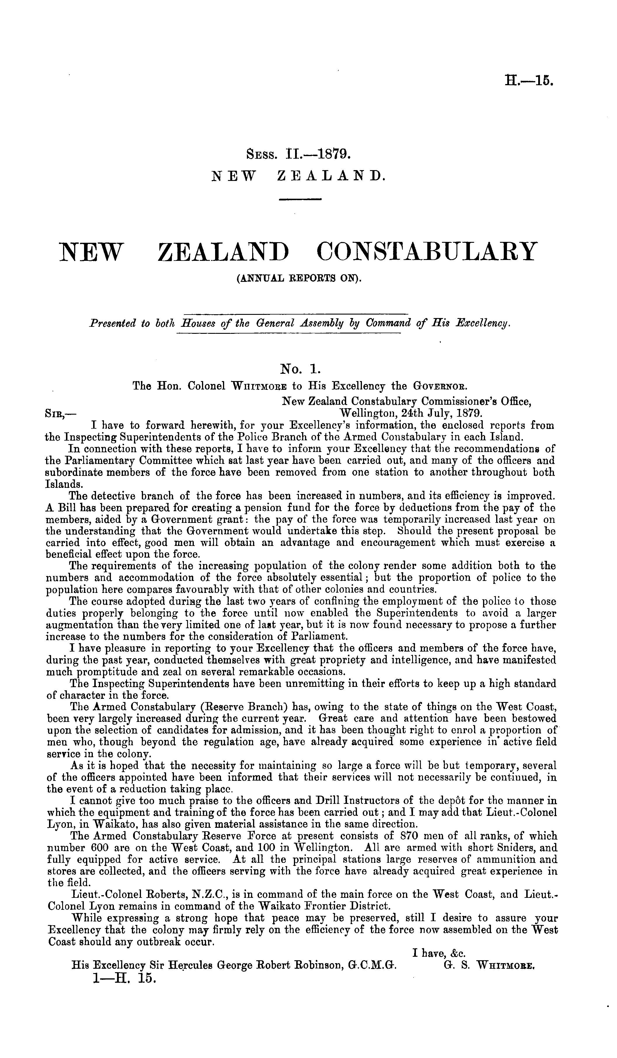 Presented to both Houses of the General Assembly by Command of His Excellency. No. 1. The Hon. Colonel WniTMORE to His Excellency the Governor. New Zealand Constabulary Commissioner's Office, Sir,— Wellington, 24th July, 1879. I liave to forward herewith, for your Excellency's information, the enclosed reports from the Inspecting Superintendents of the Police Branch of the Armed Constabulary in each Island. In connection with these reports, I have to inform your Excellency that the recommendations of tho Parliamentary Committee which sat last year have been carried out, and many of the officers and subordinate members of the force have been removed from one station to another throughout both Islands. The detective branch of the force has been increased in numbers, and its efficiency is improved. A Bill has been prepared for creating a pension fund for the force by deductions from the pay of the members, aided by a Government grant: the pay of the force was temporarily increased last year on the understanding that the Government would undertake this step. Should the present proposal be carried into effect, good men will obtain an advantage and encouragement which must exercise a beneficial effect upon the force. The requirements of the increasing population of the colony render some addition both to the numbers and accommodation of the force absolutely essential; but the proportion of police to the population here compares favourably with that of other colonies and countries. The course adopted during the last two years of confining the employment of the police to those duties properly belonging to the force until now enabled the Superintendents to avoid a larger augmentation than the very limited one of last year, but it is now found necessary to propose a further increase to the numbers for the consideration of Parliament. I have pleasure in reporting to your Excellency that the officers and members of the force have, during the past year, conducted themselves with great propriety and intelligence, and have manifested much promptitude and zeal on several remarkable occasions. The Inspecting Superintendents have been unremitting in their efforts to keep up a high standard of character in the force. The Armed Constabulary (Beserve Branch) has, owing to the state of things on the West Coast, been very largely increased during the current year. Great care and attention have been bestowed upon the selection of candidates for admission, and it has been thought right to enrol a proportion of men who, though beyond the regulation age, have already acquired some experience in' active field service in the colony. As it is hoped that the necessity for maintaining so large a force will be but temporary, several of the officers appointed have been informed that their services will not necessarily be continued, in the event of a reduction taking place. I cannot give too much praise to the officers and Drill Instructors of the depot for tho manner in which the equipment and training of the force has been carried out; and I may add that Lieut.-Colonel Lyon, in Waikato, has also given material assistance in the same direction. The Armed Constabulary Reserve Eorce at present consists of 870 men of all ranks, of which number 600 are on the West Coast, aud 100 in Wellington. All are armed with short Sniders, and fully equipped for active service. At all the principal stations large reserves of ammunition and stores are collected, and the officers serving with the force have already acquired great experience in the field. Lieut.-Colonel Eoberts, N.Z.C., is in command of the main force on the West Coast, and Lieut.Colonel Lyon remains in command of the Waikato Frontier District. While expressing a strong hope that peace may be preserved, still I desire to assure your Excellency that the colony may firmly rely on the efficiency of the force now assembled on the West Coast should any outbreak occur. I have, &c. His Excellency Sir Hercules George Eobert Eobinson, G.C.M.G. G. S. Whitmore. I—II. 15.