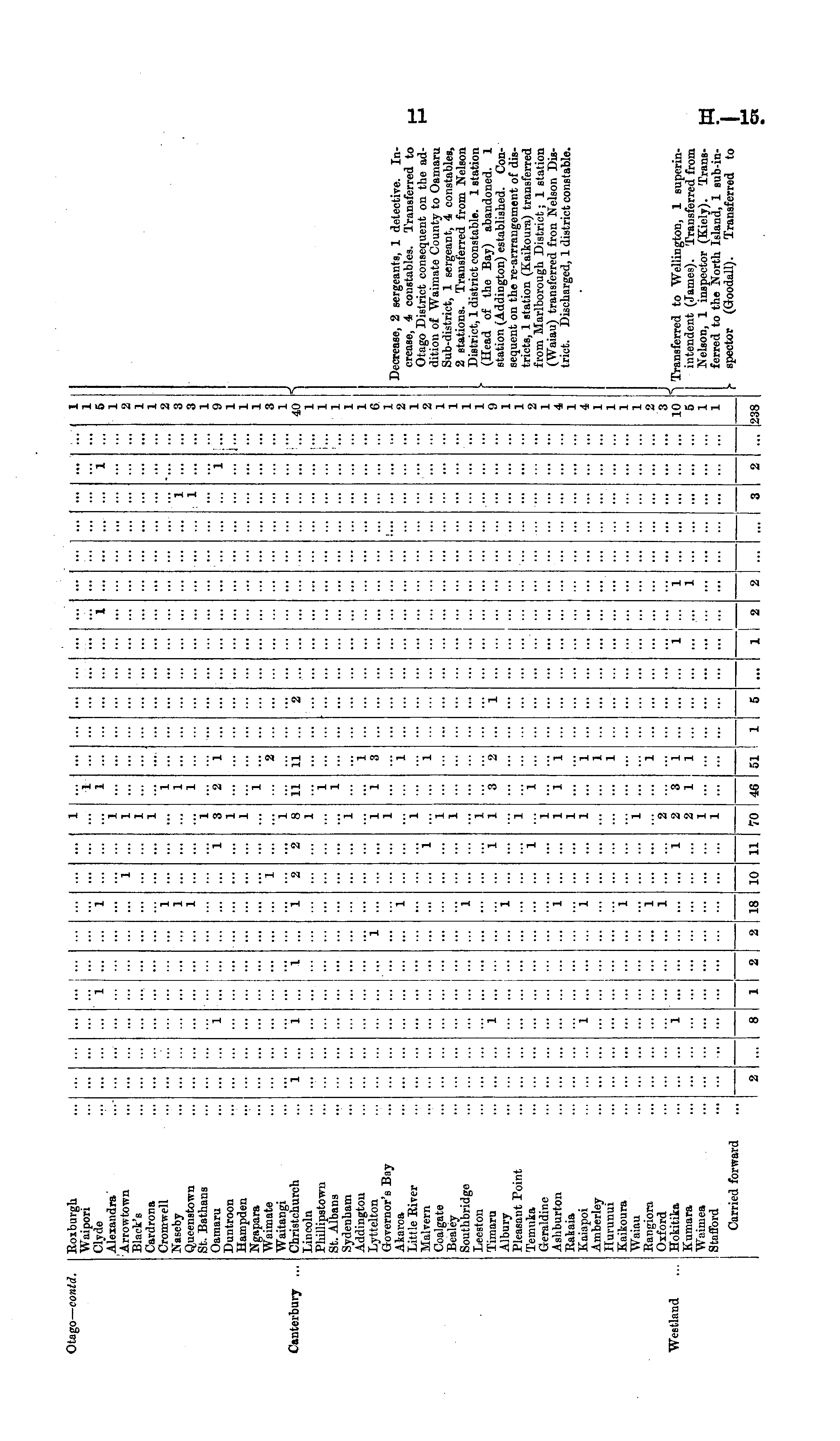 Otago — contd. Canterbury ... Roxburgh Waipori Clyde Alexandra Arrowtown Black's Cardrona Cromwell Naseby Queenstown St. Bathans Oamaru Duntroon Hampden Ngapara Waimate Waitangi Christchurch Lincoln Phillipstown St. Albans Sydenham Addington Lyttelton Governor's Buy Akaroa Little River JIalvern Coalgate Bealey Southbridge Leeston Timaru Albury Pleasant Point Temuka Geraldine Ashburton Rakaia Kaiapoi Amberley Hurunui Kaikoura Waiau Bangiora Oxford Hokitika Kumara Waimea Stafford ... ... ... i ... ... i i ■•• i ... ! - i i ••• ... "i ... i i i l l "i ... I 1 ... ... "i 2 ... ... I i "i I M i i i i i 3 1 1 1 8 1 i "i l i 1 1 1 1 2 1 11 i 1 1 ... - ... i "2 11 i 3 "i ... ... ... ... 2 ... ... ... 1 ... 1 i ... ... .... ... ... ... ... .... ... ... ... "i 1 - i i I- I ... ... ' ... 1 1 5 1 2 1 1 2 3 3 1 9 1 1 1 3 1 40 1 1 1 1 1 6 1 2 1 2 1 1 1 1 9 1 1 2 1 4 1 4 1 1 1 1 3 10 5 1 1 Decrease, 2 sergeants, 1 detective. Increase, 4 constables. Transferred to Otago District consequent on the addition of Waimate County to Oamaru Sub-district, 1 sergeant, 4 constables, 2 stations. Transferred from Nelson District, 1 district constable. 1 station (Head of the Bay) abandoned. 1 station (Addington) established. Consequent on the re-arrrangement of districts, 1 station (Kaikoura) transferred from Jlarlborough District; 1 station (Waiau) transferred fron Nelson District. Discharged, 1 district constable. ... i 1 "i "i l i 1... ... i ... ... i i ... l l 3 2 1 ... ... '" "i I i i l l l l i "i i i ... i "i 1 1 1 ... "i ... ... i ... Westland ... I ... "i "i l i 2 2 2 1 1 3 1 i i 1 ... ... ... ... "i 1 ! i 1 Transferred to Wellington, 1 superinintendent (James). Transferred from Nelson, 1 inspector (Kiely). Transferred to the Nortli Island, 1 sub-in-spector (Goodall). Transferred to ... i ... Carried forward — I I i I — I 2 I 8 1 2 2 18 10 ii 70 I 51 ! ! 1 5 I il I 2 2 !... I 3 2 238
