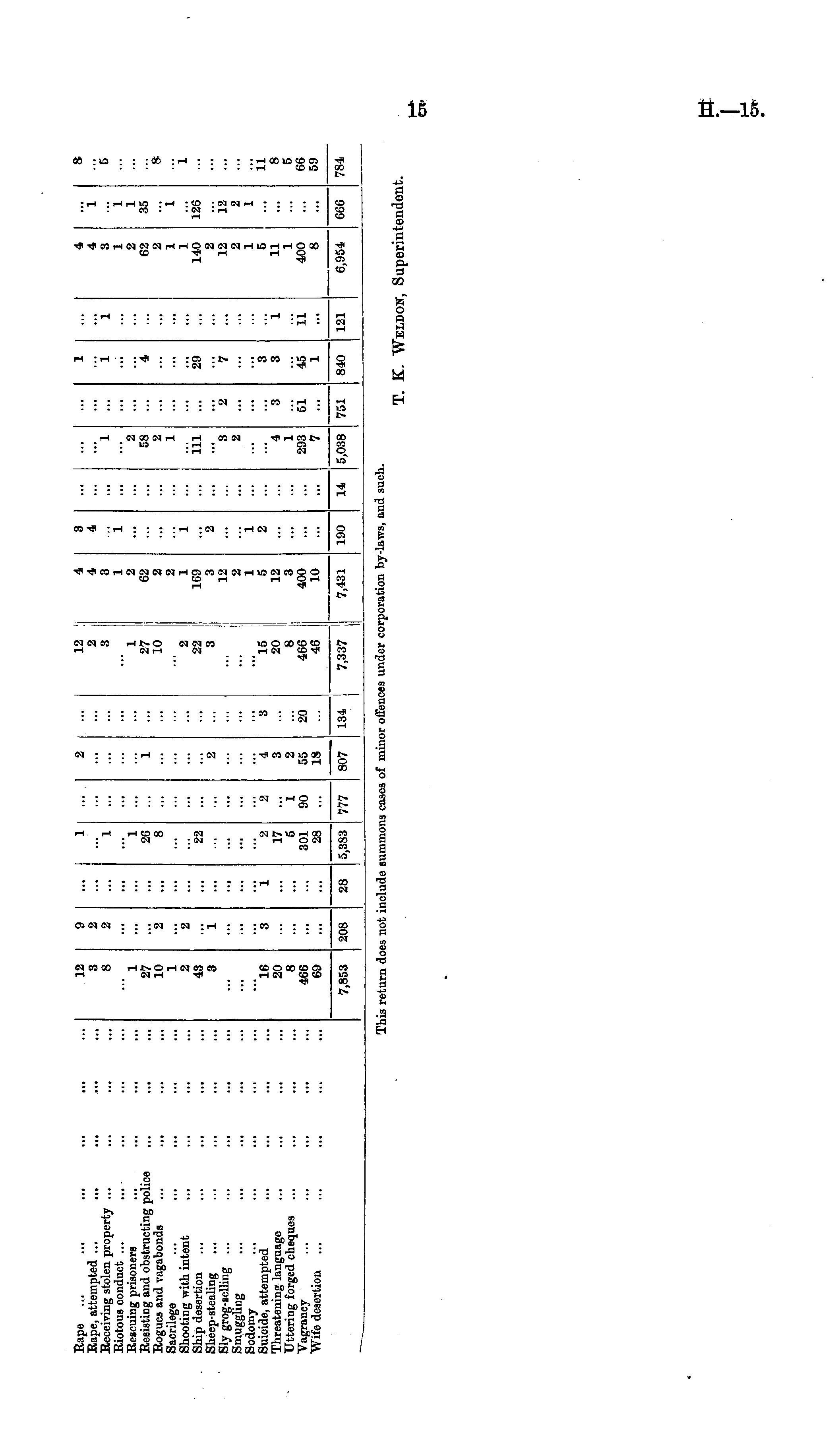 Rape Rape, attempted ... Receiving stolen property .., Riotous conduct ... ... Rescuing prisoners ... Resisting and obstructing police Rogues and vagabonds Sacrilege ... .,, Shooting with intent Ship desertion Sheep-stealing Sly grog-selling ... Smuggling ... ... Sodomy ... ... Suioide, attempted Threatening language Uttering forged cheques Vagrancy Wife desertion 12 3 8 1 27 10 1 2 43 3 9 2 2 "2 "2 i ... ... ... ... ... l \ "l 1 26 8 22 ... ... - 2 1 2 ... ... | ... | 12 2 3 Ji 10 I 2 ! 22 3 4 4 3 1 2 62 2 2 1 169 3 12 2 1 5 12 3 400 10 3 4 i ... i "2 ... ... "l 2 58 2 1 iii ... ... ... ... ... 1 I i "4 29 ... i ... ••• 4 4 3 1 2 62 2 1 1 140 2 12 2 1 5 11 400 8 "i 1 1 35 "i 126 8 5 * i I - ... ... ... ... ... 3 2 "2 "7 12 2 1 ... ... - I "i 2 ... 16 20 8 466 69 3 1 2 17 5 301 28 "i 4 3 2 55 18 3 15 20 8 466 46 i ... 3 3 11 s 5 GG 59 i 90 20 4 1 293 7 3 51 45 1 "i ii ... ... ... ... 7,853 208 28 5,383 777 807 134 7,337 7,431 190 14 5,038 751 840 121 6,954 666 784 This return does not ii iclude summoi is cases of minor offences under corporation by-laws, and such. T. K. Weldok, Superintendent.