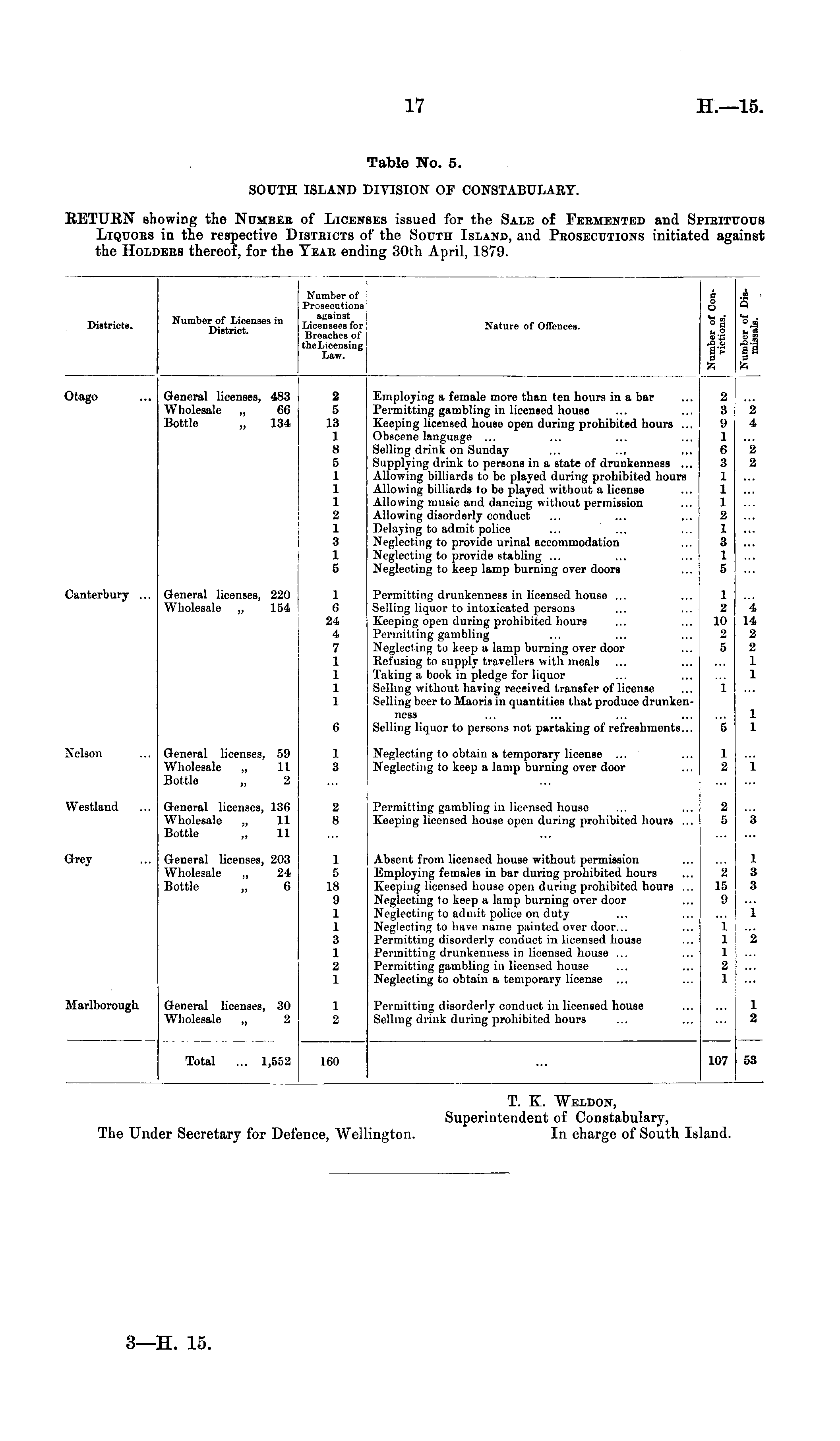 Table TJo. 5. SOUTH ISLAND ] DIVISION OF CONSTABULARY. .ETITEN sh. Liquors the Hole owing the Number of Liceni in the respective Districts o _rs thereof, for the Tear endi 3es issued for the Sale of Fermented and Spiriti f the South Island, aud Prosecutions initiated agi ing 30th April, 1879. rOUl in 81 Districts. Number of Licenses in District. Number of Prosecutions against Licensees for Breaches of theLicensing Law. Nature of Offences. a o o ° a b.l !■- P r a _ . °_S fl a I. 'tago General licenses, 483 Wholesale „ 66 Bottle „ 134 2 5 18 1 8 5 1 1 1 2 1 3 1 5 Employing a female more than ten hours in a bar Permitting gambling in licensed house Keeping licensed house open during prohibited hours ... Obscene language ... Selling drink on Sunday Supplying drink to persons in a state of drunkenness ... Allowing billiards to be played during prohibited hours Allowing billiards to be played without a license Allowing music and dancing without permission Allowing disorderly conduct Delaying to admit police Neglecting to provide urinal accommodation Neglecting to provide stabling ... Neglecting to keep lamp burning over doors o 8 9 1 8 3 1 1 1 2 1 3 1 5 2 4 "_ 2 !anterbury ... General licenses, 220 Wholesale „ 154 1 6 84 4 7 1 1 1 1 Permitting drunkenness in licensed house ... Selling liquor to intoxicated persons Keeping open during prohibited hours Permitting gambling Neglecting to keep a lamp burning over door Refusing to supply travellers with meals Taking a book in pledge for liquor Selling without having received transfer of license Selling beer to Maoris in quantities that produce drunkenness Selling liquor to persons not partaking of refreshments... 1 2 10 2 5 4 14 2 2 1 1 i 6 5 1 1 ielson General licenses, 59 Wholesale „ 11 Bottle „ 2 1 3 Neglecting to obtain a temporary license ... ' Neglecting to keep a lamp burning over door 1 2 1 Westland General licenses, 136 Wholesale „ 11 Bottle „ 11 2 8 Permitting gambling in licensed house Keeping licensed house open during prohibited hours ... 2 5 3 rrey General licenses, 203 Wholesale „ 24 Bottle „ 6 1 5 18 9 1 1 3 1 2 1 Absent from licensed house without permission Employing females in bar during prohibited hours Keeping licensed house open during prohibited hours ... Neglecting to keep a lamp burning over door Neglecting to admit police on duty Neglecting to have name painted over door... Permitting disorderly conduct in licensed house Permitting drunkenness in licensed house ... Permitting gambling in licensed house Neglecting to obtain a temporary license ... 2 16 9 1 8 3 i 1 1 1 2 1 "a General licenses, 30 Wholesale „ 2 iarlborough 1 2 Permitting disorderly conduct in licensed house Selling drink during prohibited hours i 2 Total ... 1,552 160 107 53 The Under Secretary for Defence, AVellington. T. K. Weldon, Superintendent of Constabulary, In charge of South Island.