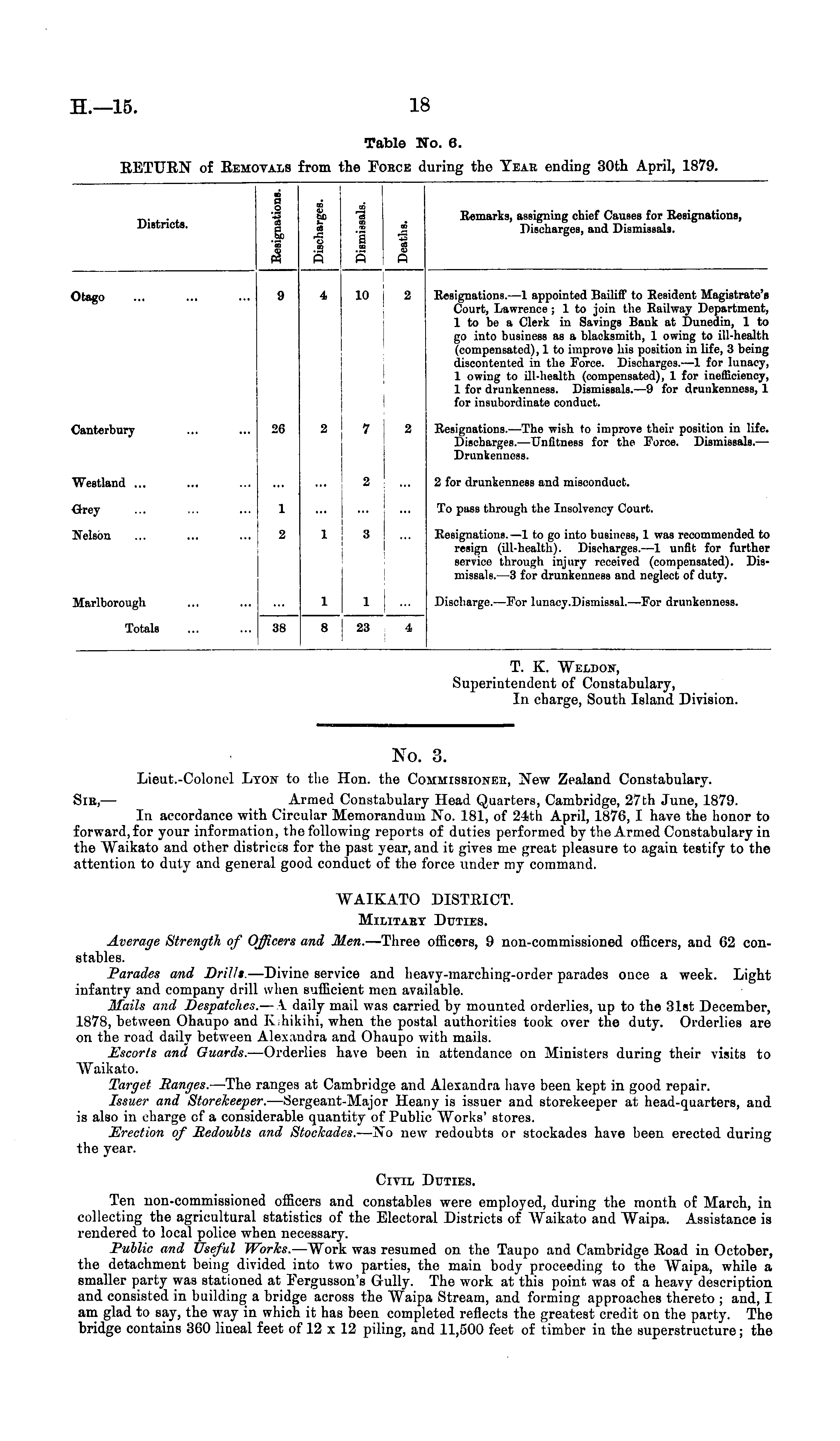 No. 3. Lieut.-Colonel Lyon to the Hon. the Commissioner, New Zealand Constahulary. Sir, — Armed Constabulary Head Quarters, Cambridge, 27th June, 1879. In accordance with Circular Memorandum No. 181, of 24th April, 1876, I have the honor to forward,for your information, the following reports of duties performed by the Armed Constabulary in the Waikato and other districcs for the past year, and it gives me great pleasure to again testify to the attention to duty and general good conduct of the force under my command. WAIKATO DISTEICT. Military Duties. Average Strength of Officers and Men. —Three officers, 9 non-commissioned officers, and G2 constables. Parades and Drill*. —Divine service and heavy-marching-order parades once a week. Light infantry and company drill when sufficient men available. Mails and Despatches. — A daily mail was carried by mounted orderlies, up to the 31st December, 1878, between Ohaupo and Kihikihi, when the postal authorities took over the duty. Orderlies are on the road daily between Alexandra and Ohaupo with mails. Escorts and Guards. —Orderlies have been in attendance on Ministers during their visits to .Vaikato. Target Ranges. —The ranges at Cambridge and Alexandra have been kept in good repair. Issuer and Storekeeper. —Sergeant-Major Heany is issuer and storekeeper at head-quarters, and is also in charge of a considerable quantity of Public Works' stores. Erection of Redoubts and Stockades. —No new redoubts or stockades have been erected during the year. Citil Duties. Ten non-commissioned officers and constables were employed, during the month of March, in collecting the agricultural statistics of the Electoral Districts of Waikato and Waipa. Assistance is rendered to local police when necessary. Public and Useful Works. —Work was resumed on the Taupo and Cambridge Eoad in October, the detachment being divided into two parties, the main body proceeding to the Waipa, while a smaller party was stationed at Eergusson's Gully. The work at this point was of a heavy description and consisted in building a bridge across the Waipa Stream, and forming approaches thereto ; and, I am glad to say, the way in which it has been completed reflects the greatest credit on the party. The bridge contains 3GO lineal feet of 12 xl 2 piling, and 11,500 feet of timber in the superstructure; the