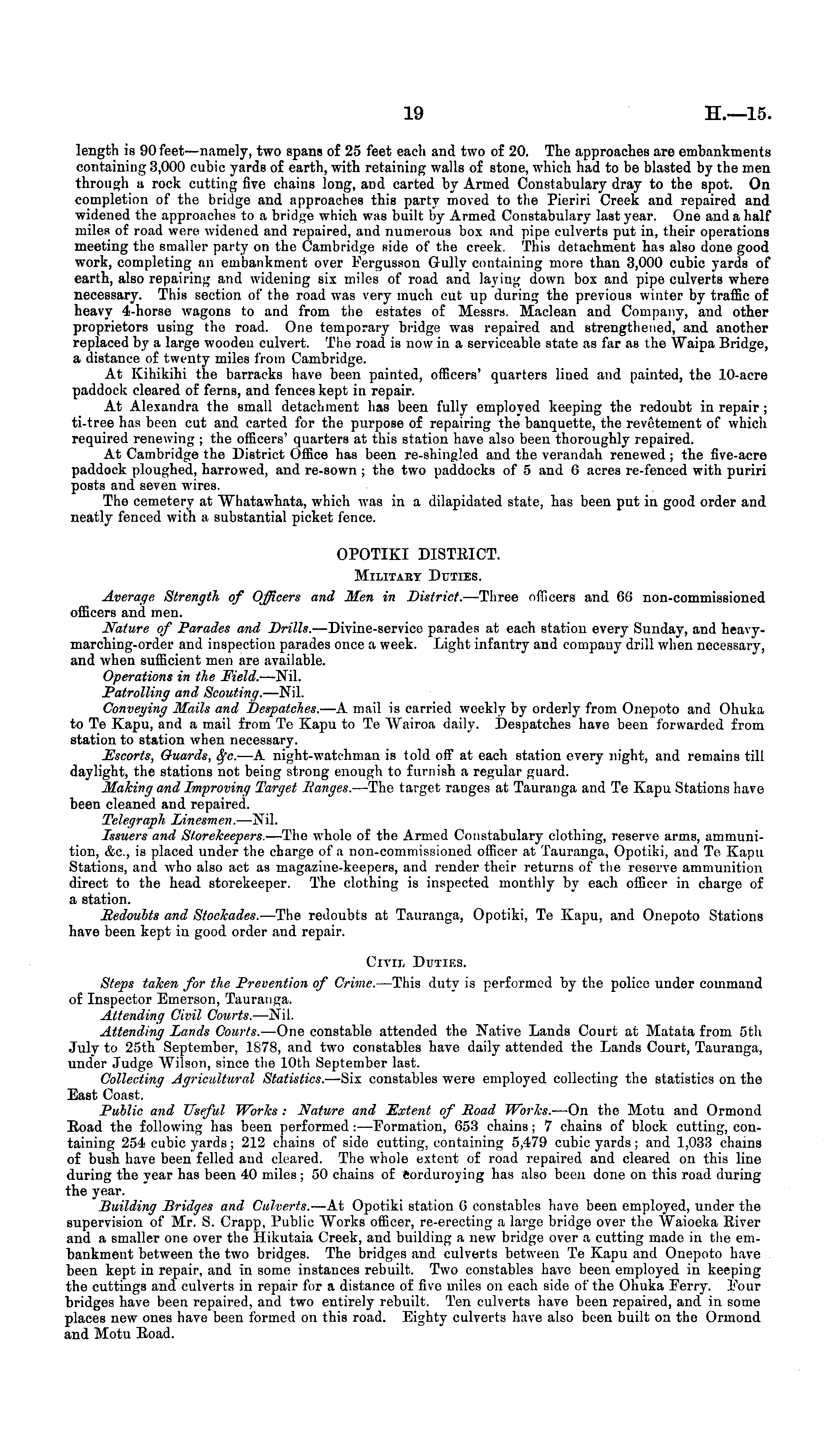 length is 90 feet—namely, two spans of 25 feet each and two of 20. The approaches are embankments containing 3,000 cubic yards of earth, with retaining walls of stone, which had to be blasted by the men through a rock cutting five chains long, and carted by Armed Constabulary dray to the spot. On completion of the bridge and approaches this party moved to the Pieriri Creek and repaired and widened the approaches to a bridge which was built by Armed Constabulary last year. One and a half miles of road were widened and repaired, and numerous box and pipe culverts put in, their operations meeting the smaller party on the Cambridge side of the creek. This detachment has also done good work, completing an embankment over Fergusson Gully containing more than 3,000 cubic yards of earth, also repairing and widening six miles of road and laying down box and pipe culverts where necessary. This section of the road was very much cut up during the previous winter by traffic of heavy 4-horse wagons to and from the estates of Messrs. Maclean and Company, and other proprietors using the road. One temporary bridge was repaired and strengthened, and another replaced by a large wooden culvert. The road is now in a serviceable state as far as the Waipa Bridge, a distance of twenty miles from Cambridge. At Kihikihi the barracks have been painted, officers' quarters lived and painted, the 10-acre paddock cleared of ferns, and fences kept in repair. At Alexandra the small detachment has been fully employed keeping the redoubt in repair ; ti-tree has been cut and carted for the purpose of repairing the banquette, the reveteinent of which required renewing ; the officers' quarters at this station have also been thoroughly repaired. At Cambridge the District Office has been re-shingled and the verandah renewed ; the five-acre paddock ploughed, harrowed, and re-sown ; the two paddocks of 5 and 6 acres re-fenced with puriri posts and seven wires. The cemetery at Whatawhata, which was in a dilapidated state, has been put in good order and neatly fenced with a substantial picket fence. OPOTIKI DISTEICT. Military Duties. Average Strength of Officers and Men in District. —Three officers and 60 non-commissioned officers and men. Nature of Parades and Drills. —Divine-service parades at each station every Sunday, and heavy-marching-order and inspection parades once a week. Light infantry and company drill when necessary, and when sufficient men are available. Operations in the Field. —Nil. Patrolling and Scouting. —-Nil. Conveyiny Mails and Despatches.—-A. mail is carried weekly by orderly from Onepoto and Ohuka to Te Kapu, and a mail from Te Kapu to Te Wairoa daily. Despatches have been forwarded from station to station when necessary. Escorts, Guards, Sfc. —A night-watchman is told off" at each station every night, and remains till daylight, the stations not being strong enough to furnish a regular guard. Making and Improving Target Ranges. —-The target ranges at Tauranga and Te Kapu Stations have been cleaned and repaired. Telegraph Linesmen. —Nil. Issuers and Storekeepers. —The whole of the Armed Constabulary clothing, reserve arms, ammunition, &o, is placed under the charge ofa non-commissioned officer at Tauranga, Opotiki, and Te Kapu Stations, and who also act as magazine-keepers, and render their returns of the reserve ammunition direct to the head storekeeper. The clothing is inspected monthly by each officer in charge of a station. Redoubts and Stockades. —The redoubts at Tauranga, Opotiki, Te Kapu, and Onepoto Stations have been kept in good order and repair. Ciyil Duties. Steps taken for the Prevention of Crime. —This duty is performed by the police under command of Inspector Emerson, Tauranga. Attending Civil Courts. —Nil. Attending Lands Courts. —One constable attended the Native Lands Court at Matata from sth July to 25th September, 1878, and two constables have daily attended the Lands Court, Tauranga, under Judge Wilson, since the 10th September last. Collecting Agricultural Statistics. —Six constables were employed collecting the statistics on the East Coast. Public and Useful Works : Nature and Extent of Road Works. —On the Motu and Ormond Eoad the following has been performed: —Formation, 653 chains; 7 chains of block cutting, containing 254 cubic yards; 212 chains of side cutting, containing 5,479 cubic yards; and 1,033 chains of bush have been felled and cleared. The whole extent of road repaired and cleared on this line during the year has been 40 miles; 50 chains of corduroying has also been done on this road during the year. Building Bridges and Culverts. —At Opotiki station 6 constables have been employed, under the supervision of Mr. S. Crapp, Publio Works officer, re-erecting a large bridge over the Waioeka Eiver and a smaller one over the Hikutaia Creek, and building a new bridge over a cutting made in the embankment between the two bridges. The bridges and culverts between Te Kapu and Onepoto have been kept in repair, and in some instances rebuilt. Two constables have been employed in keeping the cuttings and culverts in repair for a distance of five miles on each side of the Ohuka Ferry. Four bridges have been repaired, and two entirely rebuilt. Ten culverts have been repaired, and in some places new ones have been formed on this road. Eighty culverts have also been built on the Ormond and Motu Eoad.