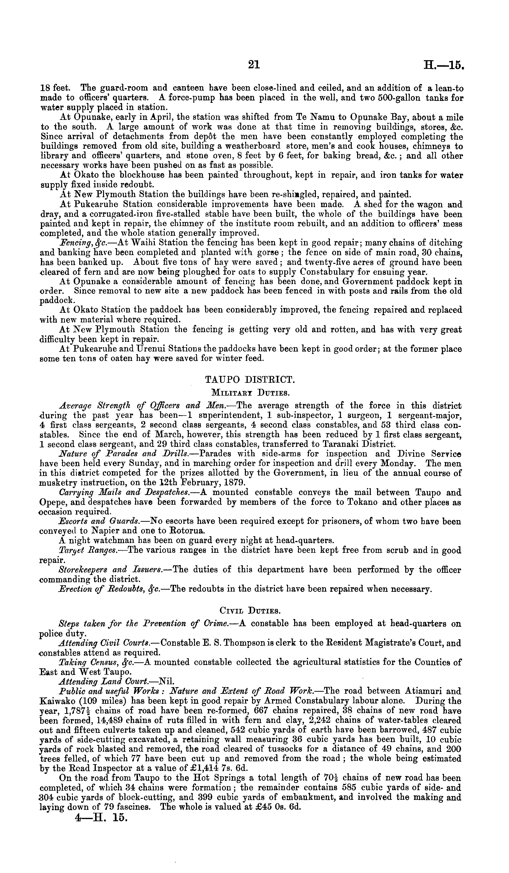 18 feet. The guard-room and canteen have been close-lined and ceiled, and an addition of a lean-to made to officers' quarters. A force-pump has been placed in the well, and two 500-gallon tanks for water supply placed in station. At Opunake, early in April, the station was shifted from Te Namu to Opunake Bay, about a mile to the south. A large amount of work was done at that time in removing buildings, stores, &c. Since arrival of detachments from depot the men have been constantly employed completing the buildings removed from old site, building a weatherboard store, men's and cook houses, chimneys to library and officers' quarters, and stone oven, 8 feet by 6 feet, for baking bread, <fee. ; and all other necessary works have been pushed on as fast as possible. At Okato the blockhouse has been painted throughout, kept in repair, and iron tanks for water supply fixed inside redoubt. At New Plymouth Station the buildings have been re-shingled, repaired, and painted. At Pukearuhe Station considerable improvements have been made. A shed for the wagon and dray, and a corrugated-iron five-stalled stable have been built, the whole of the buildings have been painted and kept in repair, the chimney of the institute room rebuilt, and an addition to officers' mess completed, and the whole station generally improved. Fencing, Sfc. —At Waihi Station the fencing has been kept in good repair; many chains of ditching and banking have been completed and planted with gorse ; the fence on side of main road, 30 chains, has been banked up. About five tons of hay were saved; and twenty-five acres of ground have been cleared of fern and are now being ploughed for oats to supply Constabulary for ensuing year. At Opunake a considerable amount of fencing has been done, and Government paddock kept in order. Since removal to new site a new paddock has been fenced in with posts and rails from the old paddock. At Okato Station the paddock has been considerably improved, the fencing repaired and replaced with new material where required. At New Plymouth Station the fencing is getting very old and rotten, and has with very great difficulty been kept in repair. At Pukearuhe and Urenui Stations the paddocks have been kept in good order; at the former place some ten tons of oaten hay were saved for winter feed. TAUPO DISTEICT. Military Duties. Average Strength of Officers and Men. —The average strength of the force in this district during the past year has been —1 superintendent, 1 sub-inspector, 1 surgeon, 1 sergeant-major, 4 first class sergeants, 2 second class sergeants, 4 second class constables, and 53 third class constables. Since the end of March, however, this strength has been reduced by 1 first class sergeant, 1 second class sergeant, and 29 third class constables, transferred to Taranaki District. Nature of Parades and Drills. —Parades with side-arms for inspection and Divine Service have been held every Sunday, and in marching order for inspection and drill every Monday. The men in this district competed for the prizes allotted by the Government, in lieu of the annual course of musketry instruction, on the 12th February, 1879. Carrying Mails and Despatches. —A mounted constable conveys the mail between Taupo and Opepe, and despatches have been forwarded by members of the force to Tokano and other places as occasion required. Escorts and Guards. —No escorts have been required except for prisoners, of whom two have been conveyed to Napier and one to Eotorua. A night watchman has been on guard every night at head-quarters. Target Ranges. —The various ranges in the district have been kept free from scrub and in good repair. Storekeepers and Issuers. —The duties of this department have been performed by the officer commanding the district. Erection of Redoubts, Sfc. —The redoubts in the district have been repaired when necessary. Civil Duties. Steps taken for the Prevention of Crime.' —A constable has been employed at head-quarters on police duty. Attending Civil Courts. —Constable E. S. Thompson is clerk to the Eesident Magistrate's Court, and constables attend as required. Taking Census, Sfc. —A mounted constable collected the agricultural statistics for the Counties of East and West Taupo. Attending Land Court. —Nil. Public and useful Works : Nature and Extent of Road Work. —The road between Atiamuri and Kaiwako (109 miles) has been kept in good repair by Armed Constabulary labour alone. During the year, 1,787| chains of road have been re-formed, 667 chains repaired, 38 chains of new road have been formed, 14,489 chains of ruts filled in with fern and clay, 2,242 chains of water-tables cleared out and fifteen culverts taken up and cleaned, 542 cubic yards of earth have been harrowed, 487 cubic yards of side-cutting excavated, a retaining wall measuring 36 cubic yards has been built, 10 cubic yards of rock blasted and removed, the road cleared of tussocks for a distance of 49 chains, and 200 trees felled, of which 77 have been cut up and removed from the road : the whole being estimated by the Eoad Inspector at a value of £1,414 7s. 6d. On the road from Taupo to the Hot Springs a total length of 70| chains of new road has been completed, of which 34 chains were formation; the remainder contains 585 cubic yards of side- and 304 cubic yards of block-cutting, and 399 cubic yards of embankment, and involved the making and laying down of 79 fascines. The whole is valued at £45 os. 6d. 4_—H. 15.