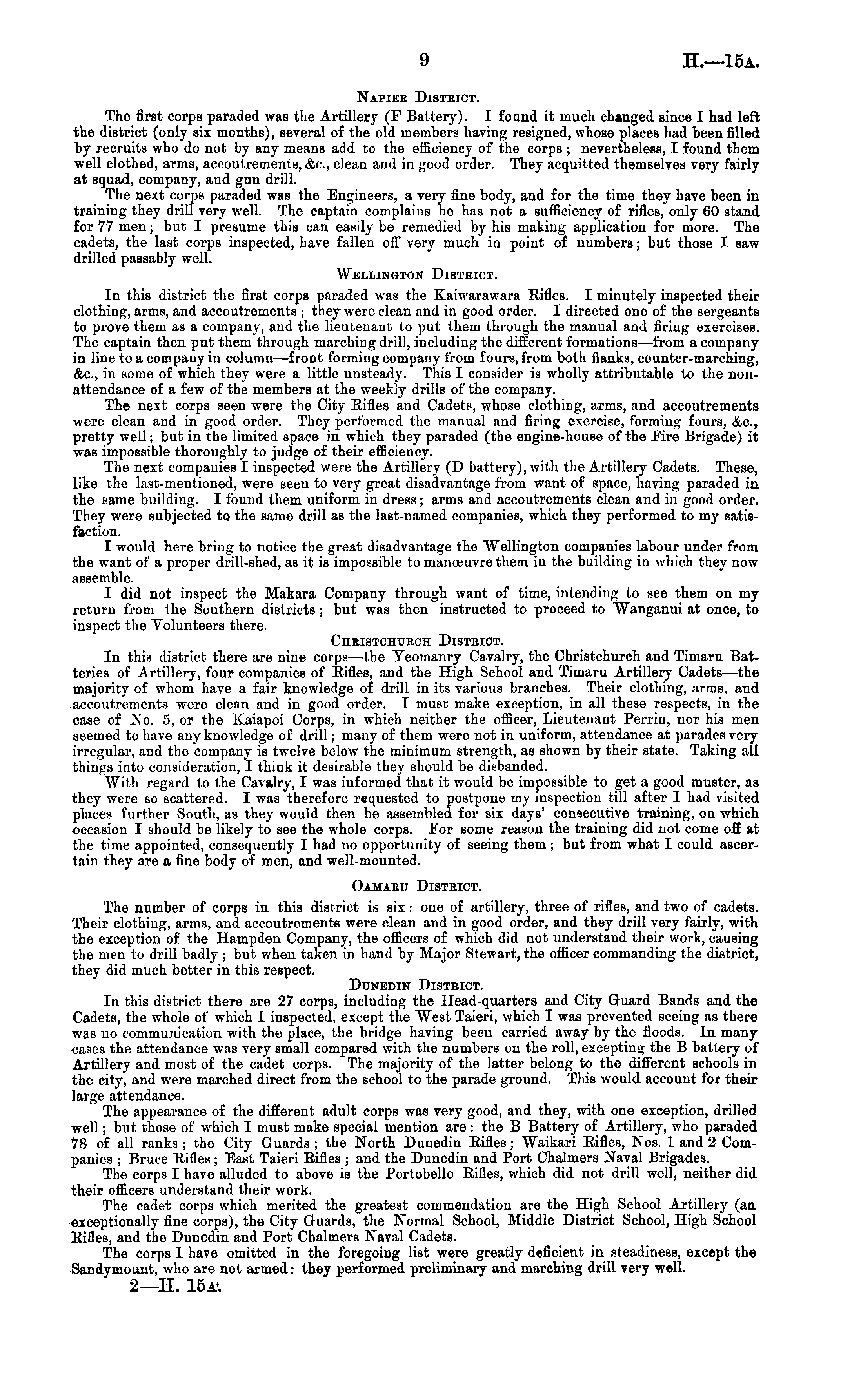Napier District. The first corps paraded was the Artillery (F Battery). I found it much changed since I had left the district (only six months), several of the old members having resigned, whose places had been filled by recruits who do not by any means add to the efficiency of the corps ; nevertheless, I found them well clothed, arms, accoutrements, &c, clean and in good order. They acquitted themselves very fairly at squad, company, and gun drill. The next corps paraded was the Engineers, a very fine body, and for the time they have been in training they drill very well. The captain complains he has not a sufficiency of rifles, only 60 stand for 77 men; but I presume this can easily be remedied by his making application for more. The cadets, the last corps inspected, have fallen off very much in point of numbers; but those I saw drilled passably well. Wellington District. In this district the first corps paraded was the Kaiwarawara Eifles. I minutely inspected their clothing, arms, and accoutrements ; they were clean and in good order. I directed one of the sergeants to prove them as a company, and the lieutenant to put them through the manual and firing exercises. The captain then put them through marching drill, including the different formations—from a company in line to a company in column —front forming company from fours, from both flanks, counter-marching, &c, in some of which they were a little unsteady. This I consider is wholly attributable to the nonattendance of a few of the members at the weekly drills of the company. The next corps seen were the City Eifles and Cadets, whose clothing, arms, and accoutrements were clean and in good order. They performed the manual and firing exercise, forming fours, &c., pretty well; but in the limited space in which they paraded (the engine-house of the Fire Brigade) it was impossible thoroughly to judge of their efficiency. The next companies I inspected were the Artillery (D battery), with the Artillery Cadets. These, like the last-mentioned, were seen to very great disadvantage from want of space, having paraded in the same building. I found them uniform in dress; arms and accoutrements clean and in good order. They were subjected to the same drill as the last-named companies, which they performed to my satisfaction. I would here bring to notice the great disadvantage the Wellington companies labour under from the want of a proper drill-shed, as it is impossible to manoeuvre them in the building in which they now assemble. I did not inspect the Makara Company through want of time, intending to see them on my return from the Southern districts ; but was then instructed to proceed to Wanganui at once, to inspect the Volunteers there. Christchttrch District. In this district there are nine corps —-the Yeomanry Cavalry, the Christchurch and Timaru Batteries of Artillery, four companies of Eifles, and the High School and Timaru Artillery Cadets—the majority of whom have a fair knowledge of drill in its various branches. Their clothing, arms, and accoutrements were clean and in good order. I must make exception, in all these respects, in the case of No. 5, or the Kaiapoi Corps, in which neither the officer, Lieutenant Perrin, nor his men seemed to have any knowledge of drill; many of them were not in uniform, attendance at parades very irregular, and the company is twelve below the minimum strength, as shown by their state. Taking all things into consideration, I think it desirable they should be disbanded. With regard to the Cavalry, I was informed that it would be impossible to get a good muster, as they were so scattered. I was therefore requested to postpone my insjiection till after I had visited places further South, as they would then be assembled for six days' consecutive training, on which occasion I should be likely to see the whole corps. For some reason the training did not come off at the time appointed, consequently I had no opportunity of seeing them; but from what I could ascertain they are a fine body of men, and well-mounted. Oamaru District. The number of corps in this district is six: one of artillery, three of rifles, and two of cadets. Their clothing, arms, and accoutrements were clean and in good order, and they drill very fairly, with the exception of the Hampden Company, the officers of which did not understand their work, causing the men to drill badly ; but when taken in hand by Major Stewart, the officer commanding the district, they did much better in this respect. Dunedin District. In this district there are 27 corps, including the Head-quarters and City Guard Bands and the Cadets, the whole of which I inspected, except the West Taieri, which I was prevented seeing as there was no communication with the place, the bridge having been carried away by the floods. In many cases the attendance was very small compared with the numbers on the roll, excepting the B battery of Artillery and most of the cadet corps. The majority of the latter belong to the different schools in the city, and were marched direct from the school to the parade ground. This would account for their large attendance. The appearance of the different adult corps was very good, and they, with one exception, drilled well; but those of which I must make special mention are : the B Battery of Artillery, who paraded 78 of all ranks ; the City Guards ; the North Dunedin Eifles ; Waikari Eifles, Nos. 1 and 2 Companies ; Bruce Eifles; East Taieri Eifles ; and the Dunedin and Port Chalmers Naval Brigades. The corps I have alluded to above is the Portobello Eifles, which did not drill well, neither did their officers understand their work. The cadet corps which merited the greatest commendation are the High School Artillery (an exceptionally fine corps), the City Guards, the Normal School, Middle District School, High School Eifles, and the Dunedin and Port Chalmers Naval Cadets. The corps I have omitted in the foregoing list were greatly deficient 