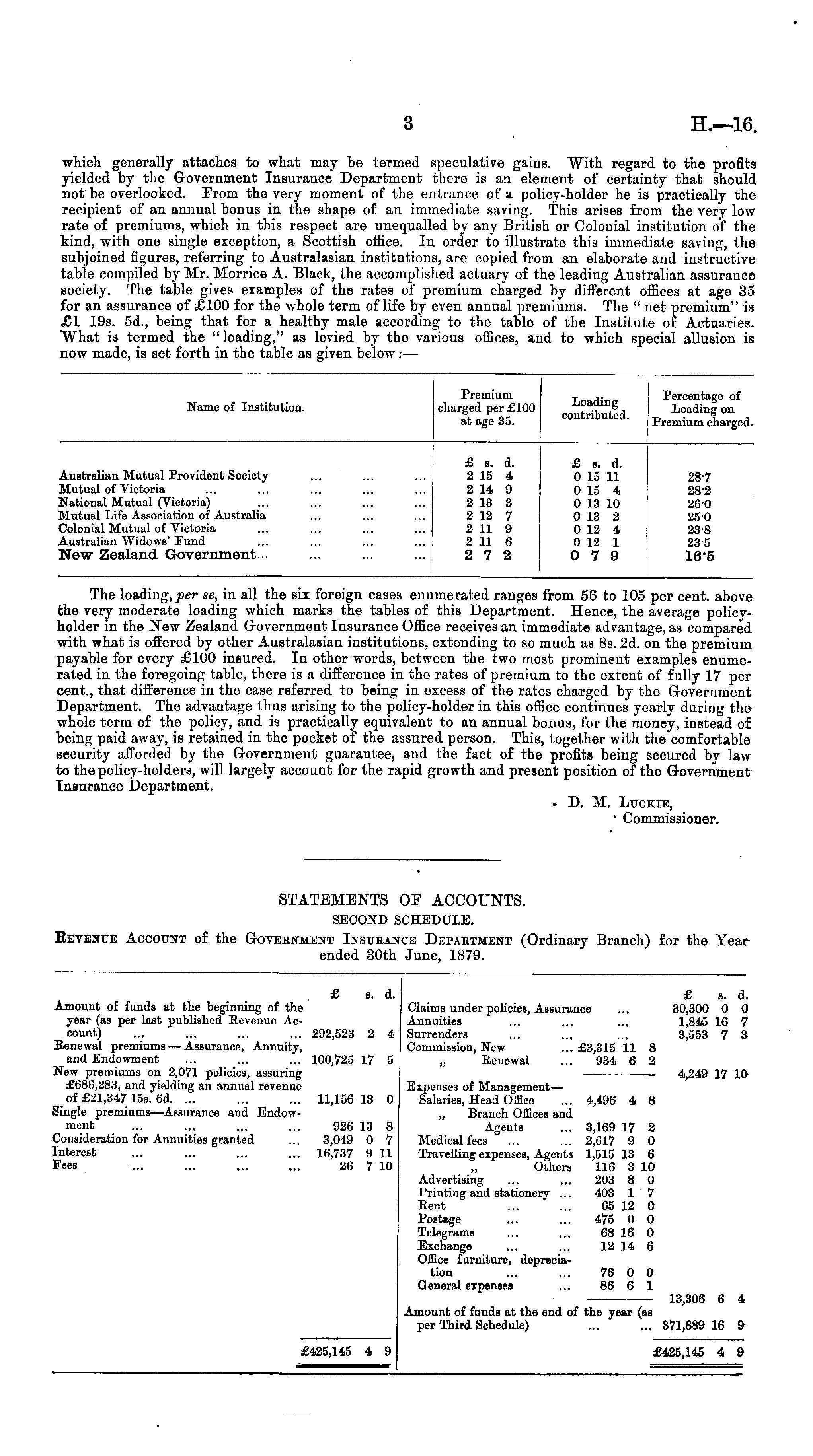 ■which generally attaches to what may be termed speculative gains. "With regard to the profits yielded by the Government Insurance Department there is an element of certainty that should not be overlooked. From the very moment of the entrance of a policy-holder he is practically the recipient of an annual bonus in the shape of an immediate saving. This arises from the very lowrate of premiums, which in this respect are unequalled by any British or Colonial institution of the kind, with one single exception, a Scottish office. In order to illustrate this immediate saving, the subjoined figures, referring to Australasian institutions, are copied from an elaborate and instructive table compiled by Mr. Morrice A. Black, the accomplished actuary of the leading Australian assurance society. The table gives examples of the rates of premium charged by different offices at age 35 for an assurance of £100 for the whole term of life by even annual premiums. The " net premium" ia £1 19s. 5d., being that for a healthy male according to the table of the Institute of Actuaries. What is termed the " loading," as levied by the various offices, and to which special allusion is now made, is set forth in the table as given below: —