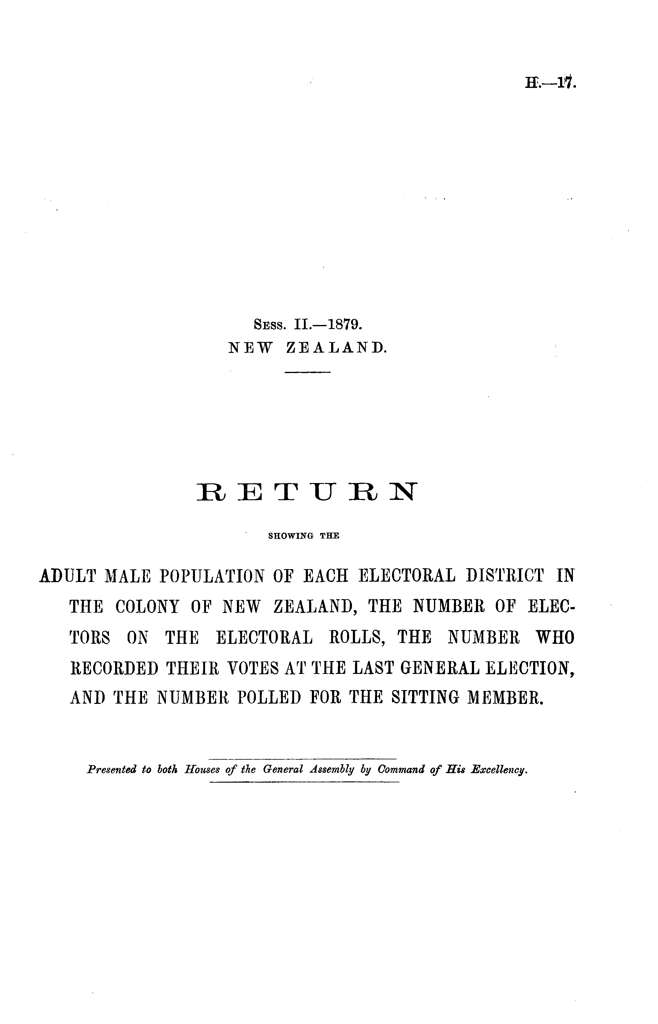RETURN SHOWING THE ADULT MALE POPULATION OF EACH ELECTORAL DISTRICT IN THE COLONY OF NEW ZEALAND, THE NUMBER OF ELECTORS ON THE ELECTORAL ROLLS, THE NUMBER WHO RECORDED THEIR VOTES AT THE LAST GENERAL ELECTION, AND THE NUMBER POLLED FOR THE SITTING MEMBER.