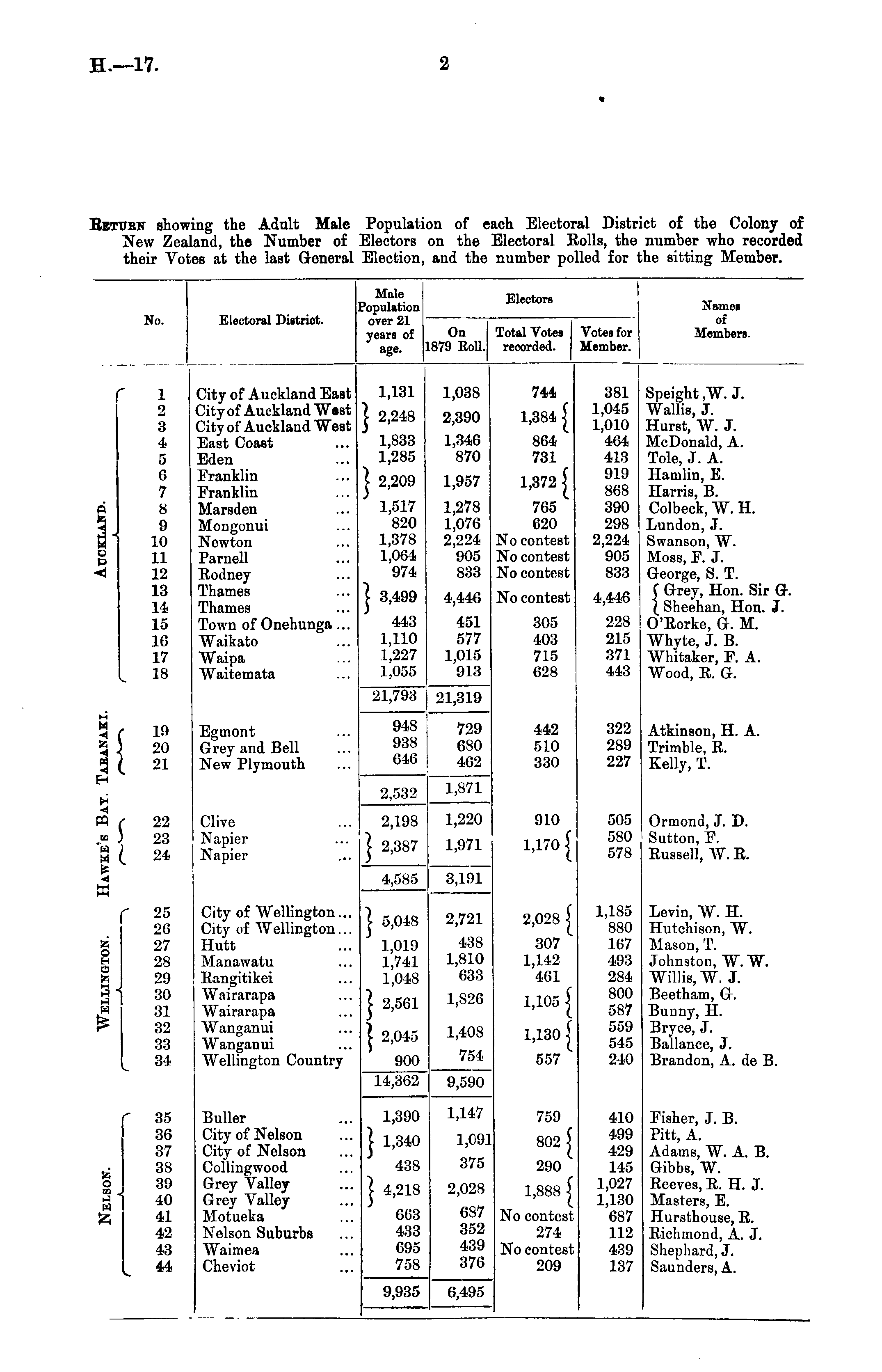 No. Electoral District. Male Population over 21 years of age. On Total Votes Votes for .879 Boll, recorded. Member. Electors Namet Members. r p 1' o P w 1 2 3 4 5 6 7 8 9 10 11 12 13 14 15 16 17 18 City of Auckland EaBt City of Auckland W«st City of Auckland West East Coast Eden Franklin Franklin Marsden Mongonui Newton Parnell Rodney Thames Thames Town of Onehunga... Waikato "Waipa Waitemata 1,131 | 2,248 1,833 1,285 | 2,209 1,517 820 1,378 1,064 974 1,038 2,390 1,346 870 1,957 1,278 1,076 2,224 905 833 744 1,384 | 864 731 1,372 i 765 620 No contest No contest No contest 381 1,045 1,010 464 413 919 868 390 298 2,224 905 833 Speight ,W. J. Wallis, J. Hurst, W. J. McDonald, A. Tole, J. A. Hatnlin, E. Harris, B. Colbeck, W. H. Lundon, J. Swanson, W. Moss, F. J. George, S. T. C Grey, Hon. Sir G. I Sheenan, Hon. J. O'Rorke, G. M. Whyte, J. B. Whitaker, F. A. Wood, R. G. | 3,499 4,446 No contest 4,446 443 1,110 1,227 1,055 451 577 1,015 913 305 403 715 628 228 215 371 443 a? 3( 19 20 21 21,793 21,319 Egmont Grey and Bell New Plymouth 948 938 646 729 680 462 442 510 330 322 289 227 Atkinson, H. A. Trimble, R. Kelly, T. 2,532 1,871 n 22 23 24 Clive Napier Napier 2,198 | 2,387 1,220 1,971 910 1,170 J 505 580 578 Ormond, J. D. Button, F. Russell, W. R. City of Wellington... City of Wellington... Hutt Manawatu Eangitikei Wairarapa Wairarapa Wanganui Wanganui Wellington Country 4,585 3,191 2,028 | 1,185 880 167 493 284 800 587 559 545 240 Levin, W. H. Hutchison, W. Mason, T. Johnston, W. W. Willis, W. J. Beetham, G. Bunny, H. Bryce, J. Ballance, J. Brandon, A. de B. r ta o H O § I" I 25 26 27 28 29 30 31 32 33 34 | 5,048 2,721 O H O i I I 1,019 1,741 1,048 438 1,810 633 307 1,142 461 | 2,561 | 2,045 1,826 1,408 1,105 j 1,130 J 900 14,362 754 557 9,590 ta o H ta o in 3 M 35 36 37 38 39 40 41 42 43 44 Buller City of Nelson City of Nelson Collingwood Grey Valley Grey Valley Motuelta Nelson Suburbs Waimea Cheviot 1,390 | 1,340 438 | 4,218 1,147 1,091 375 2,028 759 802 | 290 1,888 | No contest 274 No contest 209 410 499 429 145 1,027 1,130 687 112 439 137 Fisher, J. B. Pitt, A. Adams, W. A. B. Gibbs, W. Reeves, R. H. J. Masters, E. Hursthouse, R. Richmond, A. J. Shephard, J. Saunders, A. 663 433 695 758 9,935 687 352 439 376 6,495