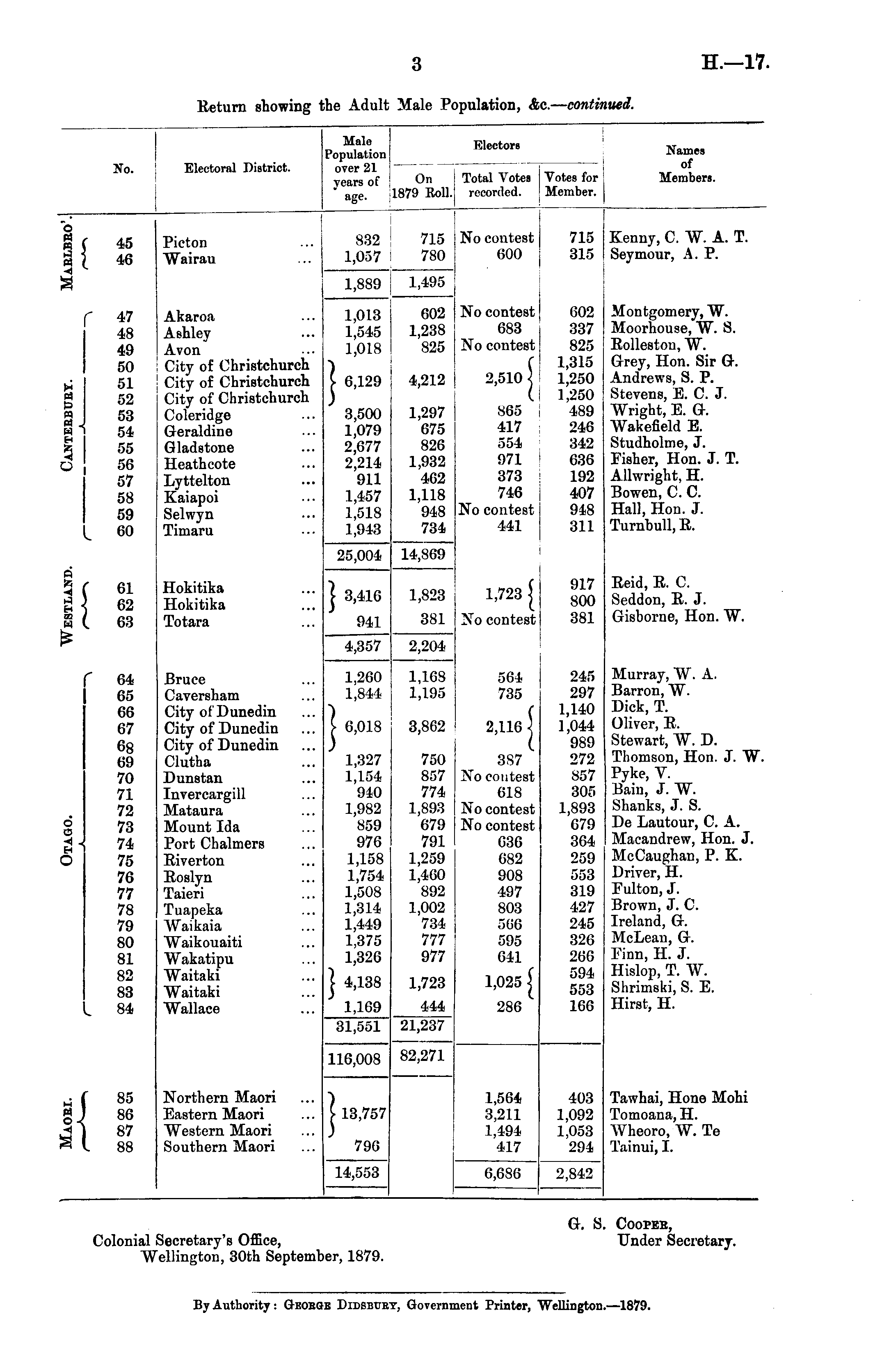 Return showing ;he Adult Male Population, &c.— continued. No. Electoral District. Male Population over 21 years of Electors Names On Total Votes Votes for 1879 Roll, recorded. Member. Members. age. 45 46 Picton Wairau 832 1,057 715 780 No contest 600 715 315 Kenny, C. W. A. T. Seymour, A. P. 1,889 1,495 602 337 825 1,315 1,250 1,250 489 246 342 636 192 407 948 311 Montgomery, W. Moorhouse, W. S. Eolleston,W. Grey, Hon. Sir Q-. Andrews, S. P. Stevens, E. C. J. Wright, E. Or. Wakefield E. Studholme, J. Fisher, Hon. J. T. Allwright, H. Bowen, C. C. Hall, Hon. J. Turnbull, E. r g pa W 1 5 47 48 49 50 51 52 53 54 55 56 57 58 59 60 Akaroa Ashley Avon City of Ohristchurch City of Christchurcb. City of Christchurch Coleridge Geraldine Gladstone Heath cote Lyttelton Kaiapoi Selwyn Timaru 1,013 1,545 1,018 602 1,238 825 No contest 683 No contest 2,510 j =3 w ( 6,129 4,212 3,500 1,079 2,677 2,214 911 1,457 1,518 1,943 1,297 675 826 1,932 462 1,118 948 734 865 417 554 971 373 746 No contest 441 p aj / 61 62 63 25,004 14,869 1,723 \ No contest 917 800 381 Eeid, E. C. Seddon, E. J. Gisborne, Hon. W. Hokitika Hokitika Totara \ 3,416 1,823 941 381 4,357 2,204 Murray, W. A. Barron, W. Dick, T. Oliver, B, Stewart, W. D. Thomson, Hon. J. W. Pyke, V. Bain, J. W. Shanks, J. S. De Lautour, C. A. Macandrew, Hon. J. McCaughan, P. K. Driver, H. Fulton, J. Brown, J. C. Ireland, G. McLean, G. Finn, H. J. Hislop, T. W. Shrimski, S. E. Hirst, H. r d O I 64 65 66 67 68 69 70 71 72 73 74 75 76 77 78 79 80 81 82 83 84 Bruce Caversham City of Dunedin City of Dunedin City of Dunedin Clutha Dunstan Invercargill Mataura Mount Ida Port Chalmers Eiverton Eoslyn Taieri Tuapeka Waikaia Waikouaiti Wakatipu Waitaki Waitaki Wallace 1,260 1,844 1,168 1,195 564 735 245 297 1,140 1,044 989 272 857 305 1,893 679 364 259 553 319 427 245 326 266 594 553 166 I 6,018 3,862 2,116 5 o c ■< H O 1,327 1,154 940 1,982 859 976 1,158 1,754 1,508 1,314 1,449 1,375 1,326 750 857 774 1,893 679 791 1,259 1,460 892 1,002 734 777 977 3S7 No contest 618 No contest No contest G36 682 908 497 803 506 595 641 | 4,138 1,723 1,025 { 1,169 444 286 31,551 21,237 116,008 82,271 sat 85 86 87 88 Northern Maori Eastern Maori Western Maori Southern Maori [ 13,757 1,564 3,211 1,494 417 403 1,092 1,053 294 Tawhai, Hone Mohi Tomoana, H. Wheoro, W. Te Tainui, I. 796 14,553 6,686 2,842 g. a. COOPEE, "Under Secretary. Colonial Secretary's Office, Wellington, 30th September, 1879. By Authority : Geoeqb Didsbuet, Government Printer, Wellington.—1879.