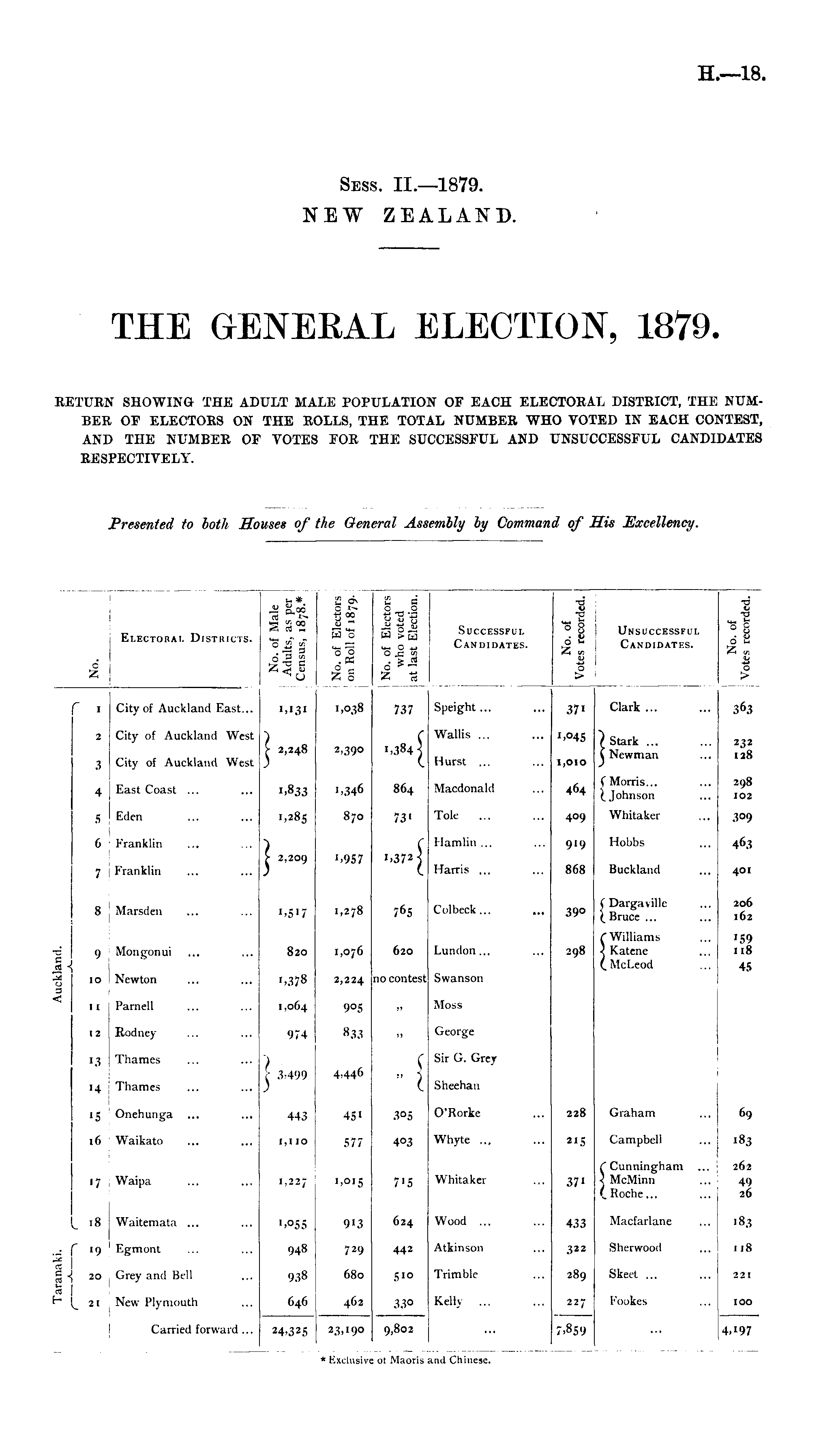 THE GENERAL ELECTION, 1879. RETURN SHOWING THE ADULT MALE POPULATION OF EACH ELECTORAL DISTRICT, THE NUMBER OF ELECTORS ON THE ROLLS, THE TOTAL NUMBER WHO VOTED IN EACH CONTEST, AND THE NUMBER OF VOTES FOR THE SUCCESSFUL AND UNSUCCESSFUL CANDIDATES RESPECTIVELY.