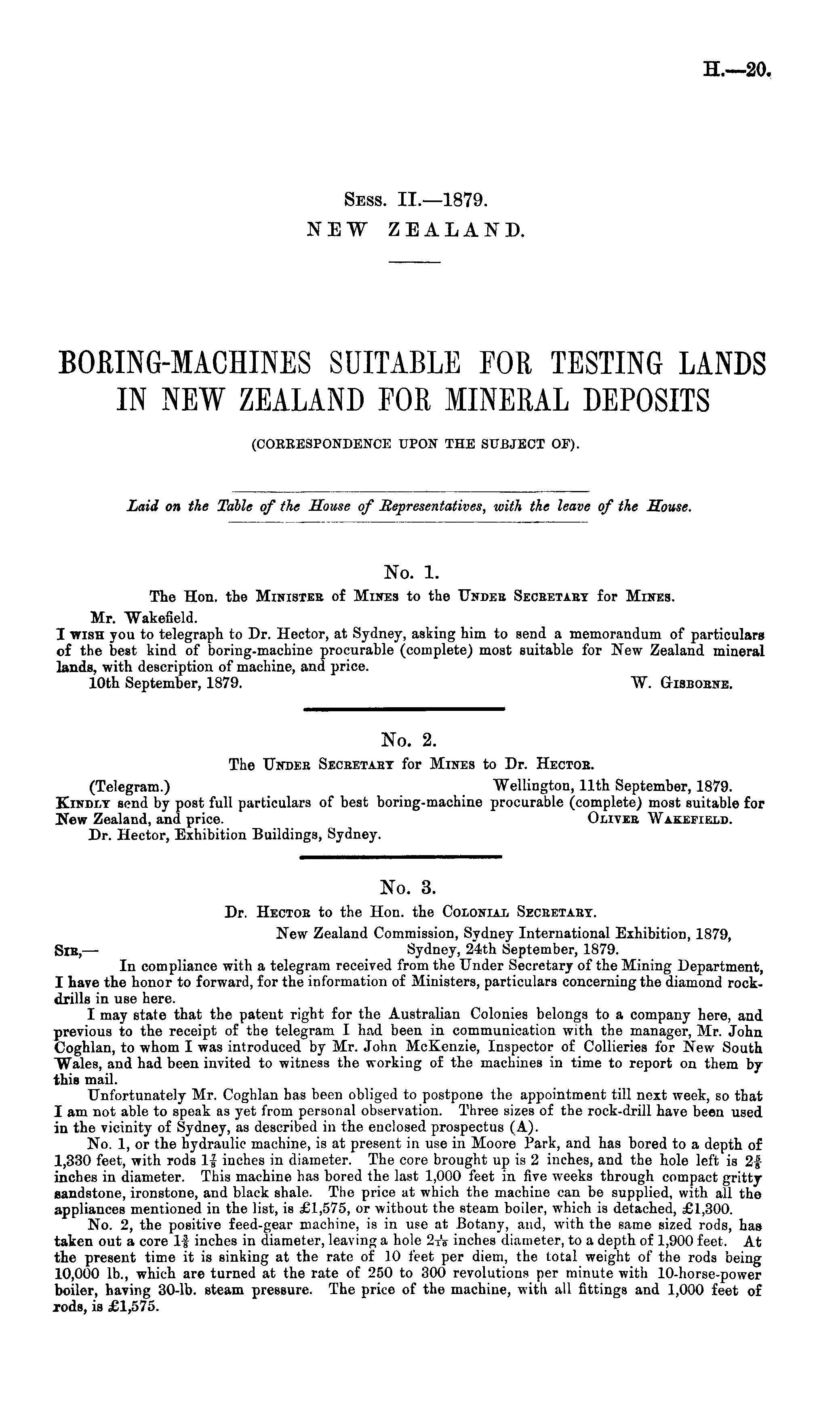 Laid on the Table of the House of Representatives, with the leave of the House. No. 1. The Hon. the Minister of Mines to the TJndee Seceetaet for Mines. Mr. "Wakefield. I wish you to telegraph to Dr. Hector, at Sydney, asking him to send a memorandum of particulars of the best kind of boring-machine procurable (complete) most suitable for New Zealand mineral lands, with description of machine, and price. 10th September, 1879. W. Gisbobne.