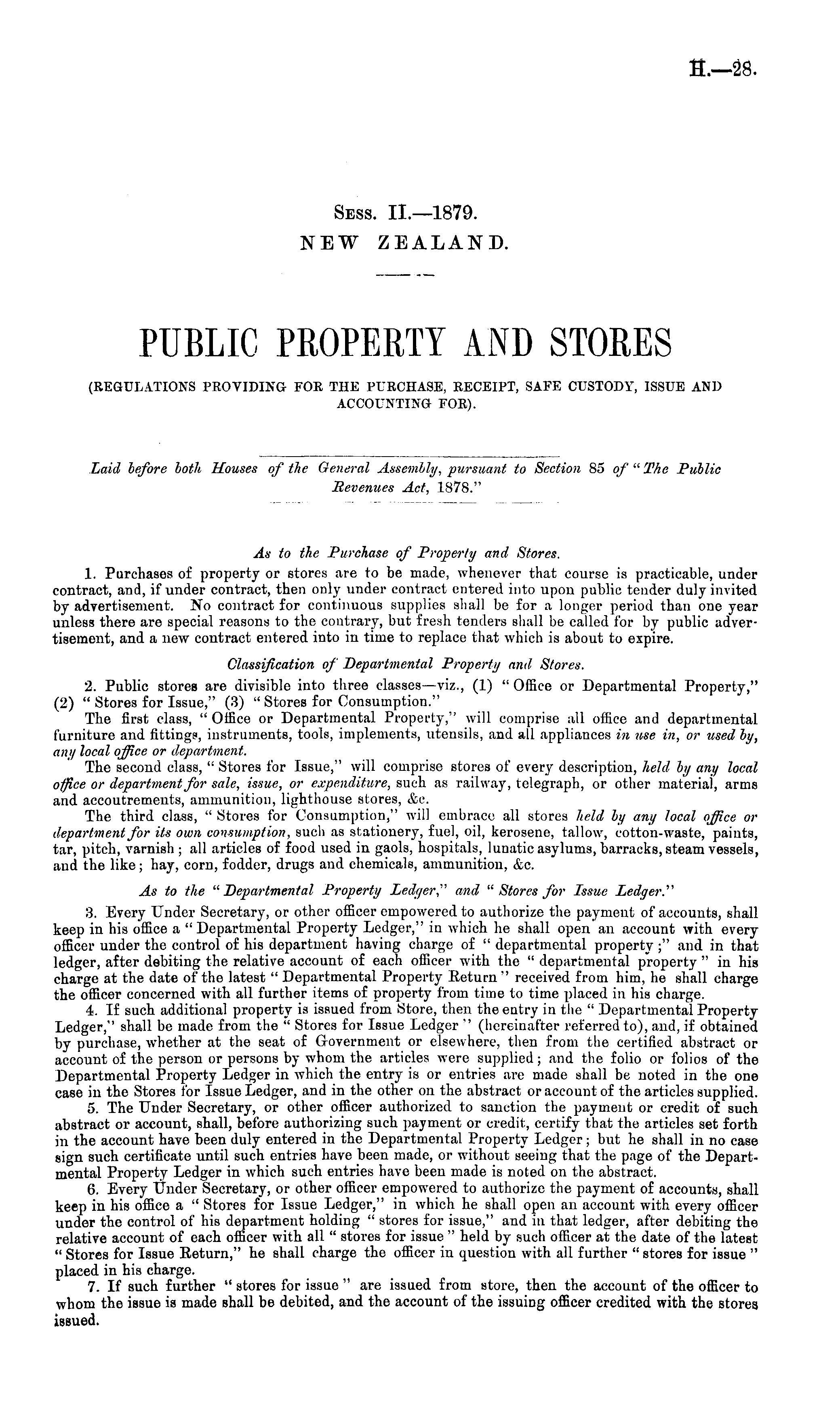 As to the Purchase of Properly and Stores. 1. Purchases of property or stores are to be made, whenever that course is practicable, under contract, and, if under contract, then only under contract entered into upon public tender duly invited by advertisement. No contract for continuous supplies shall be for a longer period than one year unless there are special reasons to the contrary, but fresh tenders shall be called for by public advertisement, and a new contract entered into in time to replace that which is about to expire. Classification of Departmental Property and Stores. 2. Public stores are divisible into three classes—viz., (1) " Office or Departmental Property," (2) " Stores for Issue," (3) " Stores for Consumption." The first class, " Office or Departmental Property," will comprise all office and departmental furniture and fittings, instruments, tools, implements, utensils, and all appliances in use in, or used by, am/ local office or department. The second class, " Stores for Issue," will comprise stores of every description, held by any local office or department for sale, issue, or expenditure, such as railway, telegraph, or other material, arms and accoutrements, ammunition, lighthouse stores, &c. The third class, " Stores for Consumption," will embrace all stores held by any local office or department for its own consumption, such as stationery, fuel, oil, kerosene, tallow, cotton-waste, paints, tar, pitch, varnish ; all articles of food used in gaols, hospitals, lunatic asylums, barracks, steam vessels, and the like; hay, corn, fodder, drugs and chemicals, ammunition, &c. As to the "Departmental Property Ledr/er," and " Stores for Issue Ledger." 3. Every Under Secretary, or other officer empowered to authorize the payment of accounts, shall keep in his office a "Departmental Property Ledger," in which he shall open an account with every officer under the control of his department having charge of " departmental property ;" and in that ledger, after debiting the relative account of each officer with the " departmental property " in his charge at the date of the latest "Departmental Property Eeturn"' received from him, he shall charge the officer concerned with all further items of property from time to time placed in his charge. 4. If such additional property is issued from Store, then the entry in the " Departmental Property Ledger," shall be made from the " Stores for Issue Ledger " (hereinafter referred to), and, if obtained by purchase, whether at the seat of Government or elsewhere, then from the certified abstract or account of the person or persons by whom the articles were supplied; and the folio or folios of the Departmental Property Ledger in which the entry is or entries are made shall be noted in the one case in the Stores for Issue Ledger, and in the other on the abstract or account of the articles supplied. 5. The Under Secretary, or other officer authorized to sanction the payment or credit of such abstract or account, shall, before authorizing such payment or credit, certify that the articles set forth in the account have been duly entered in the Departmental Property Ledger; but he shall in no case sign such certificate until such entries have been made, or without seeing that the page of the Departmental Property Ledger in which such entries have been made is noted on the abstract. 6. Every Under Secretary, or other officer empowered to authorize the payment of accounts, shall keep in his office a " Stores for Issue Ledger," in which he shall open an account with every officer under the control of his department holding " stores for issue," and in that ledger, after debiting the relative account of each officer with all " stores for issue " held by such officer at the date of the latest " Stores for Issue Return," he shall charge the officer in question with all further " stores for issue " placed in his charge. 7. If such further " stores for issue " are issued from store, then the account of the officer to whom the issue is made shall be debited, and the account of the issuing officer credited with the stores issued.