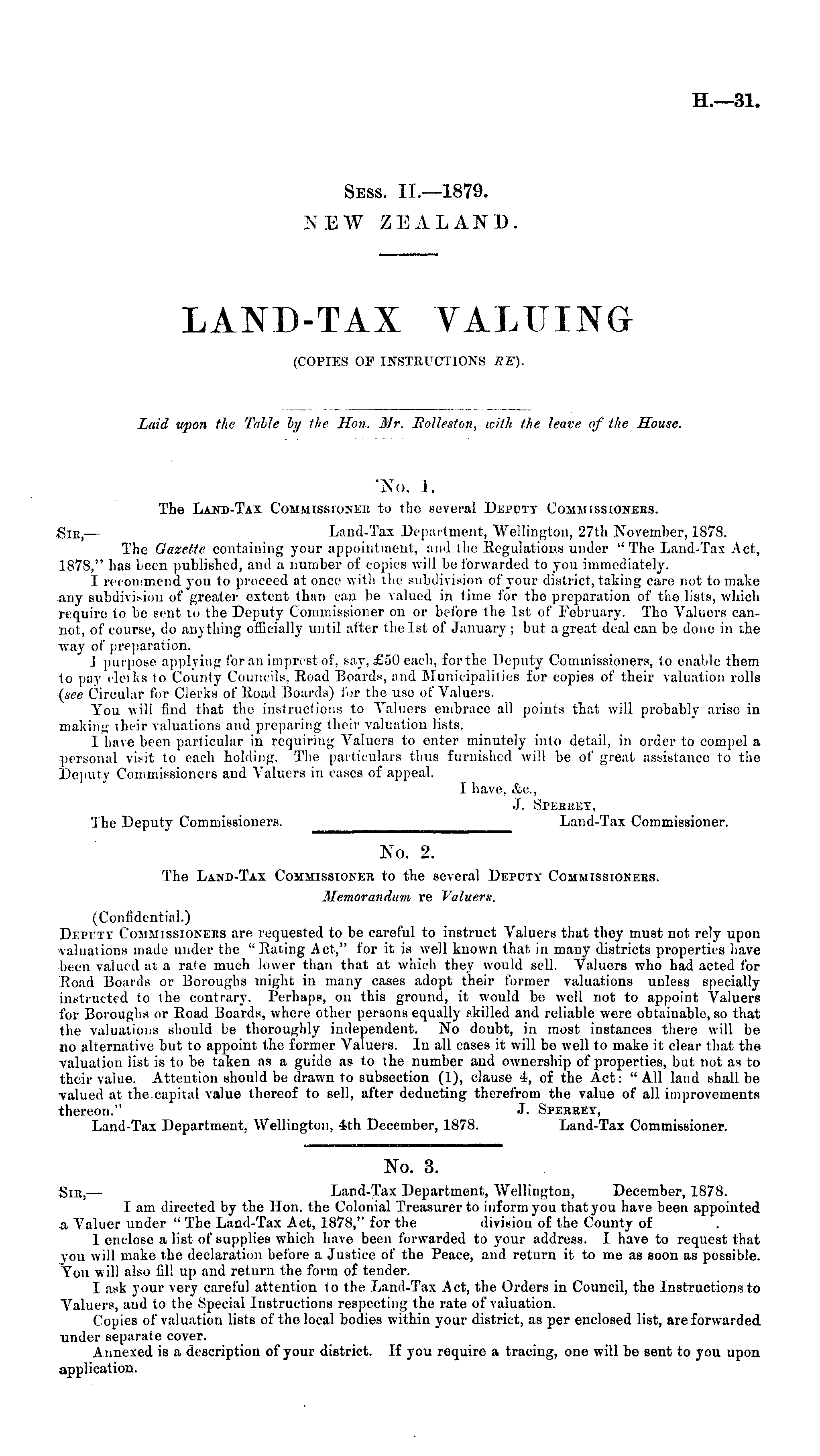Laid upon the Table by the Hon. HJr. Rolleston, with the leave of the House. 'No. 1. The Land-Tax Commissi usee to tho several Deputy Commissionees. Sib, — Land-Tax Department, Wellington, 27th November, 1878. The Gazette containing your appointment, and ihe Begulations under "The Land-Tax Act. 1878," has been published, and a number of copies will be forwarded to you immediately. I rei ommend you to proceed at once with the subdivision of your district, taking care not to make any subdivision of greater extent than can be valued in time for the preparation of the lists, which require to be sent tv the Deputy Commissioner on or before the Ist of February. The Valuers cannot, of course, do anything officially until after the Ist of January ; but a great deal can be done in the way of preparation. I purpose applying for an imprest of, say, £50 each, forthe Deputy Commissioners, to enable them to pay clerks to County Councils, Road Boards, and Municipalities for copies of their valuation rolls (see Circular for Clerks of Road Boards) for the use of Valuers. You -will find that the instructions to Valuers embrace all points that will probably arise in making their valuations and preparing their valuation lists. 1 have been particular in requiring Valuers to enter minutely into detail, in order to compel a personal visit to each holding. The particulars thus furnished will be of great assistance to the Deputy Commissioners and Valuers in cases of appeal. I have, &c, J. Sperrey, The Deputy Commissioners. Land-Tax Commissioner.