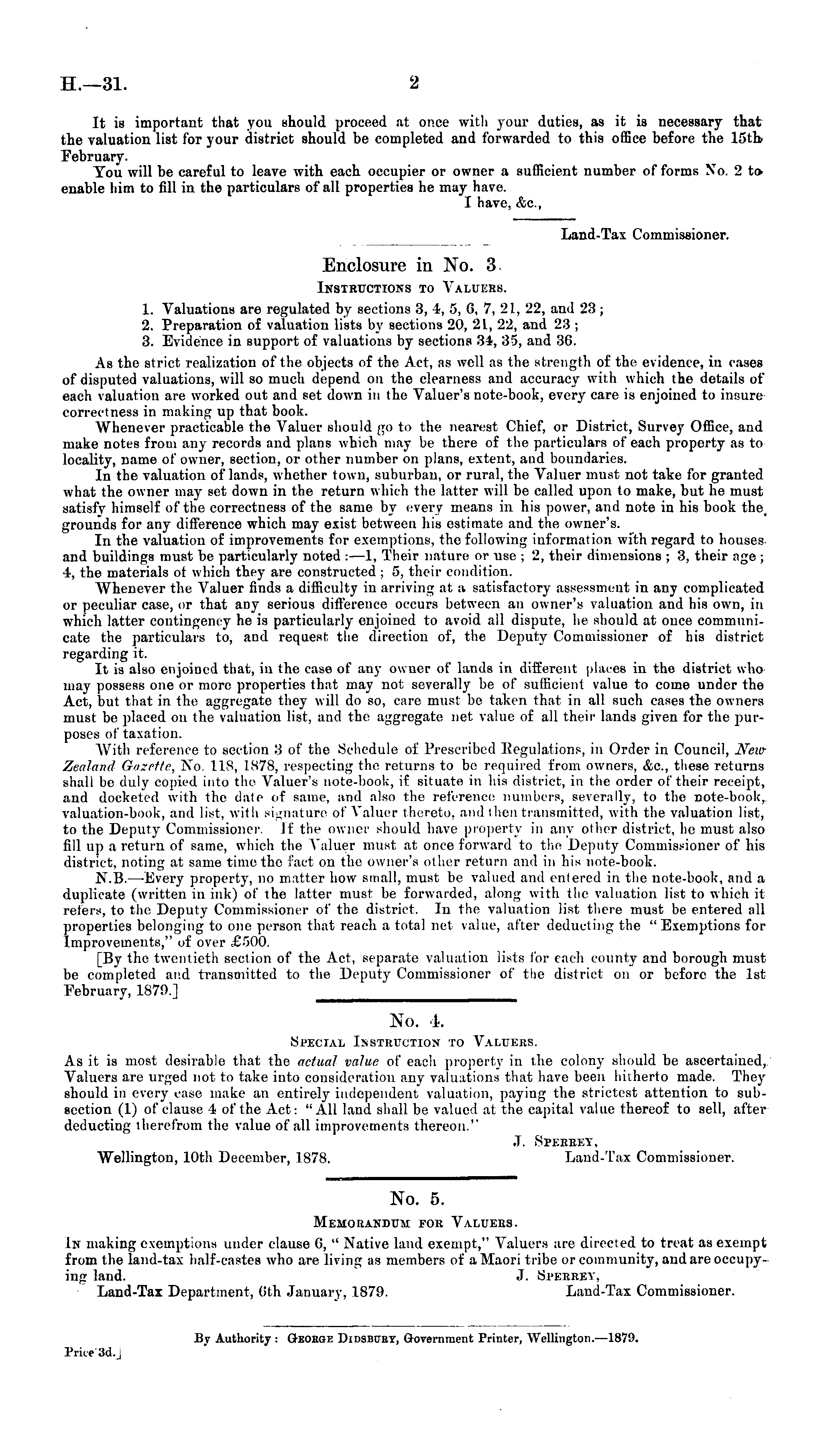 No. 1, Special Issteuction to Valuers. As it is most desirable that the actual value of each property in the colony should be ascertained, Valuers are urged not to take into consideration any valuations that have been hitherto made. They should in every case make au entirely independent valuation, paying the strictest attention to subsection (1) of clause 4 of the Act: "All land shall be valued at the capital value thereof to sell, after deducting therefrom the value of all improvements thereon." J. Speeeey, Wellington, 10th December, 1878. Laud-Tax Commissioner.