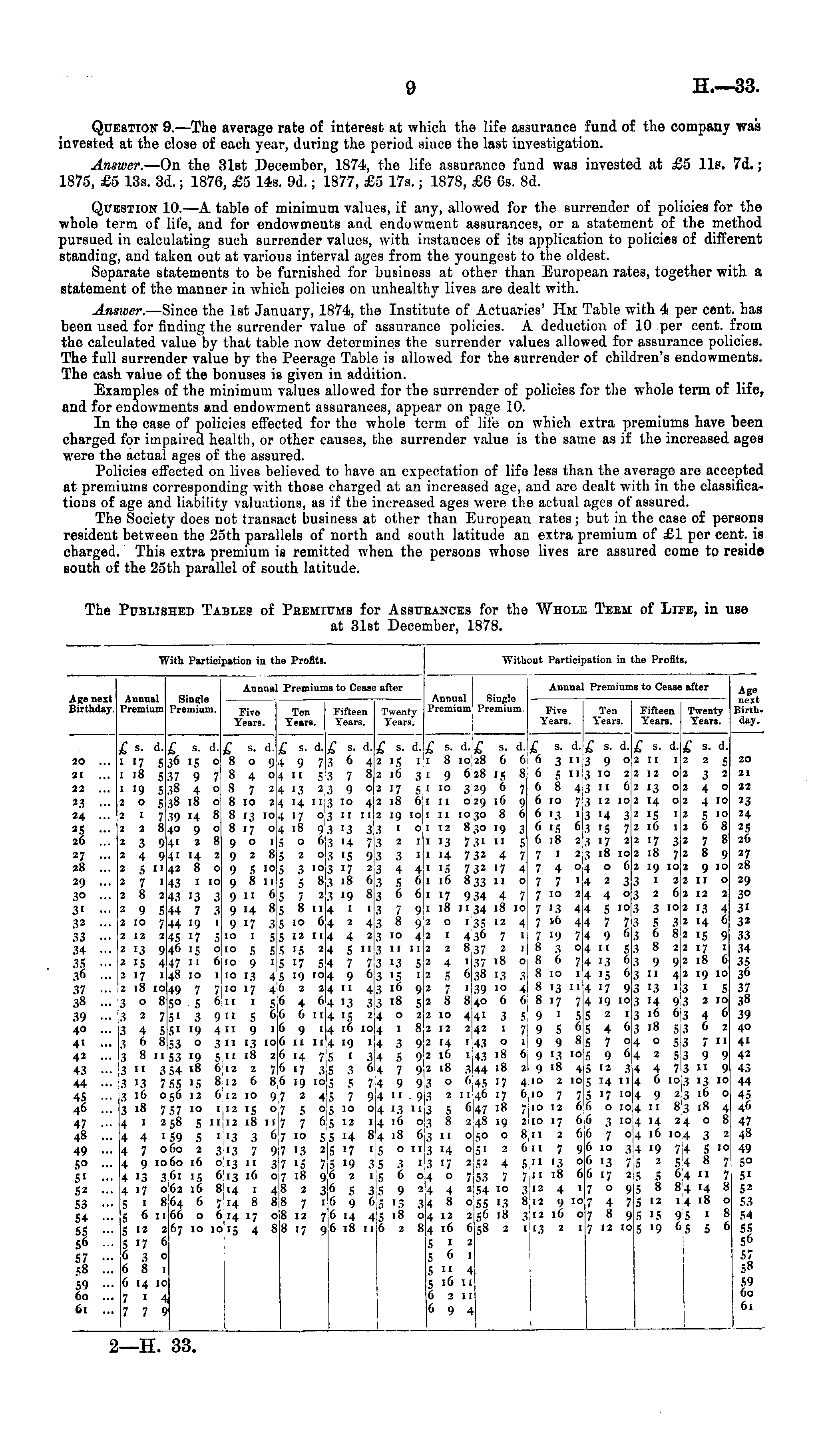 Question 9.—The average rate of interest at which the life assurance fund of the company was invested at the close of each year, during the period since the last investigation. Answer. —On the 31st December, 1874, the life assurance fund was invested at £5 lls. 7d.; 1875, £5 13s. 3d.; 1876, £5 14s. 9d. j 1877, £5 175.; 1878, £6 Gs. Bd. Question 10.— A. table of minimum values, if any, allowed for the surrender of policies for the whole term of life, and for endowments and endowment assurances, or a statement of the method pursued in calculating such surrender values, with instances of its application to policies of different standing, and taken out at various interval ages from the youngest to the oldest. Separate statements to be furnished for business at other than European rates, together with a statement of the manner in which policies on unhealthy lives are dealt with. Answer. —Since the Ist January, 1874, the Institute of Actuaries' Hsr Table with 4 per cent, has been used for finding the surrender value of assurance policies. A deduction of 10 per cent, from the calculated value by that table now determines the surrender values allowed for assurance policies. The full surrender value by the Peerage Table is allowed for the surrender of children's endowments. The cash value of the bonuses is given in addition. Examples of the minimum values allowed for the surrender of policies for the whole term of life, and for endowments and endowment assurances, appear on page 10. In the case of policies effected for the whole term of life on which extra premiums have been charged for impaired health, or other causes, the surrender value is the same as if the increased ages were the actual ages of the assured. Policies effected on lives believed to have an expectation of life less than the average are accepted at premiums corresponding with those charged at an increased age, and are dealt with in the classifications of age and liability valuations, as if the increased ages were the actual ages of assured. The Society does not transact business at other than European rates ; but in the case of persons resident between the 25th parallels of north and south latitude an extra premium of £1 per cent, is charged. This extra premium is remitted when the persons whose lives are assured come to reside south of the 25th parallel of south latitude. The Published Tables of Premiums for Assubances for the Whole Teem of Lite, in use at 31st December, 1878.