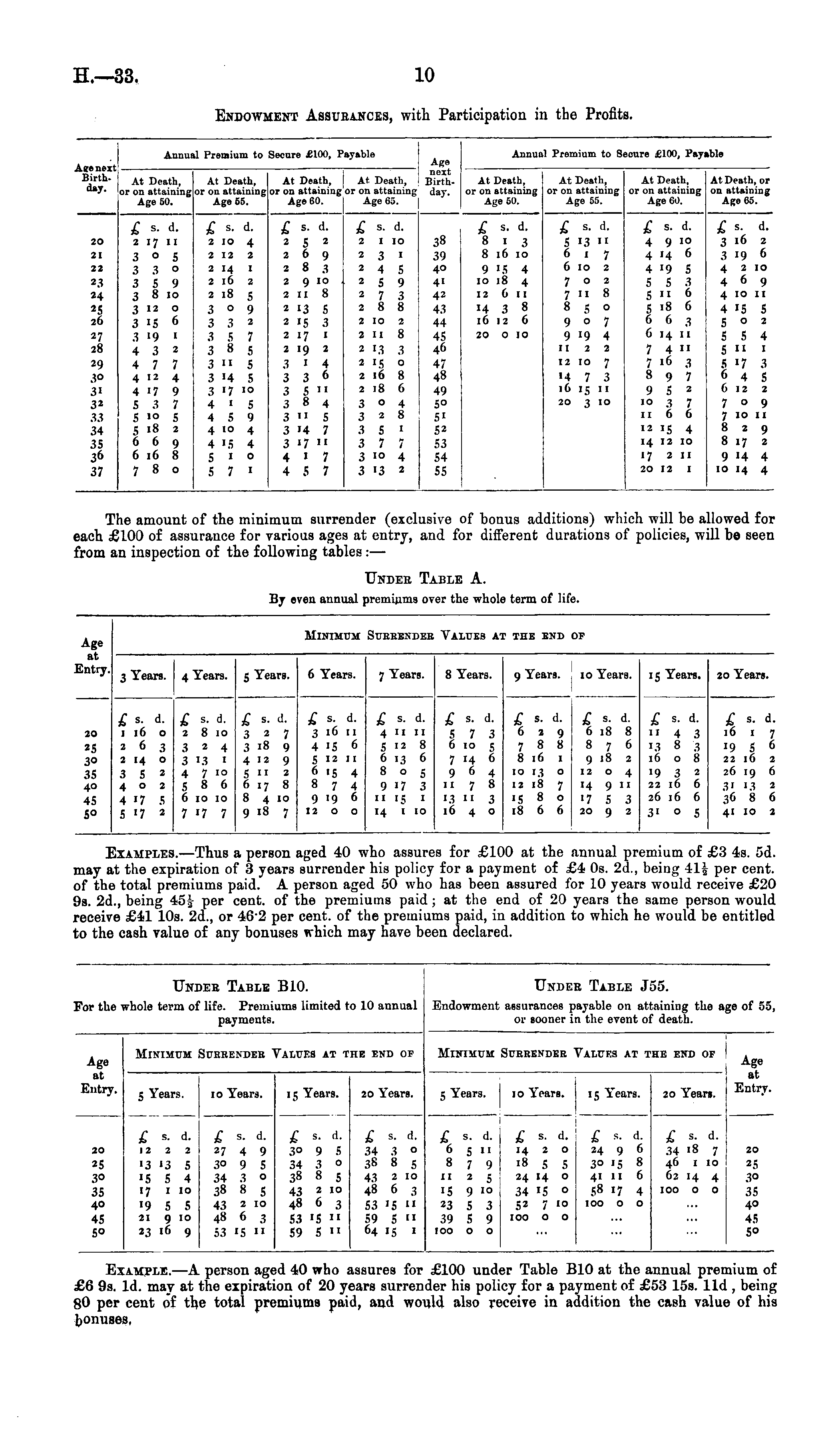 Examples.—Thus a person aged 40 who assures for £100 at the annual premium of £3 4s. sd. may at the expiration of 3 years surrender his policy for a payment of £4 os. 2d., being 41J per cent, of the total premiums paid. A person aged 50 who has been assured for 10 years would receive £20 9s. 2d., being 4o| per cent, of the premiums paid ; at the end of 20 years the same person would receive £41 10s. 2d., or 46'2 per cent, of the premiums paid, iu addition to which he would be entitled to the cash value of any bonuses which may have been declared.