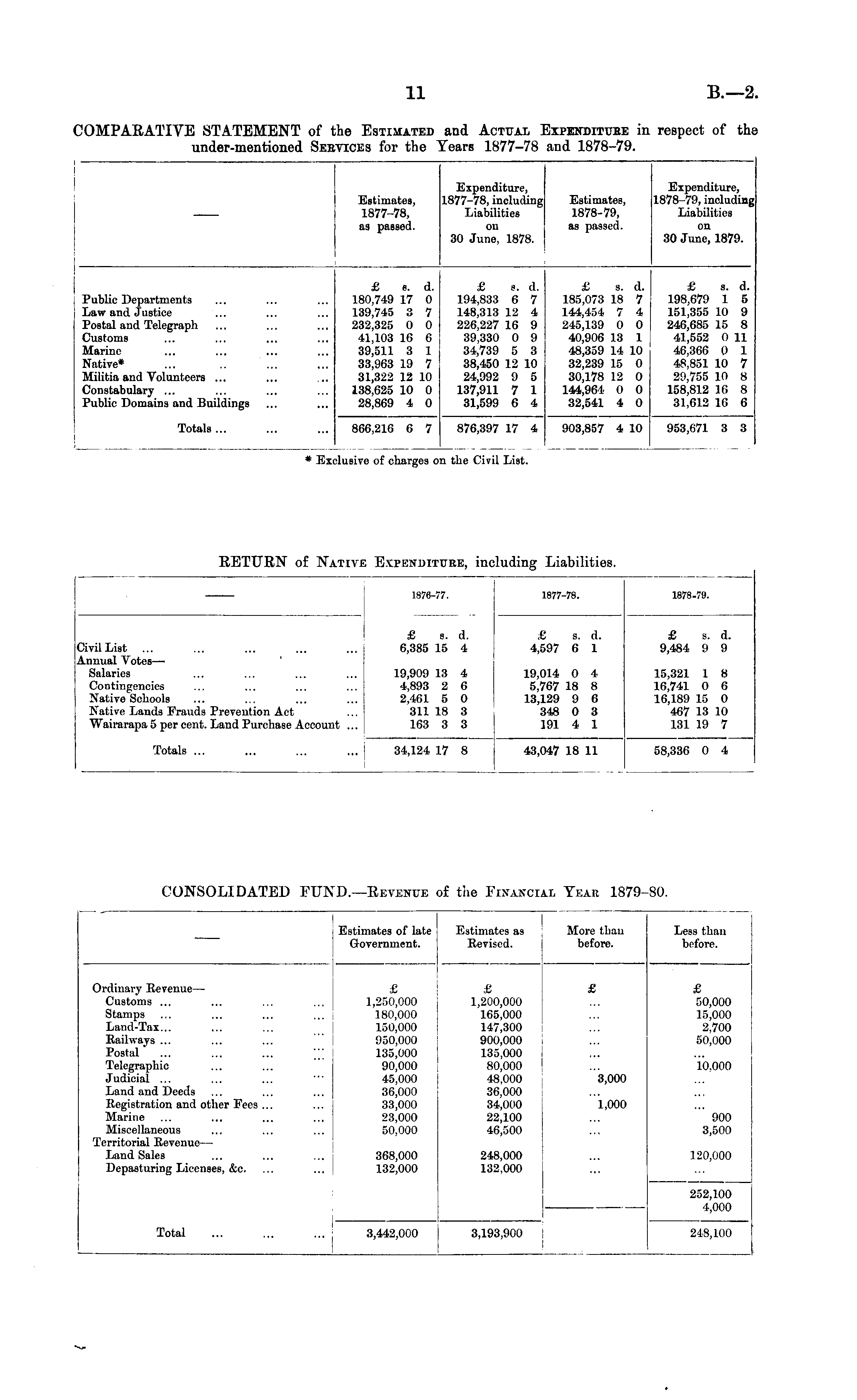 Estimates, 1877-78, as passed. Expenditure, 1877-78, includinj Liabilities on Estimates, 1878-79, as passed. Expenditure, 1878-79, including Liabilities on 30 June, 1879. 30 June, 1878. Public Departments Law and Justice Postal and Telegraph Customs Marine Native* Militia and Volunteers ... Constabulary ... Public Domains and Buildings £ e. d. 180,749 17 0 139,745 3 7 232,325 0 0 41,103 16 6 39,511 3 1 33,963 19 7 31,322 12 10 138,625 10 0 28,869 4 0 £ I. d. 194,833 6 7 148,313 12 4 226,227 16 9 39,330 0 9 34,739 5 3 38,450 12 10 24,992 9 5 137,911 7 1 31,599 6 4 £ a. d. 185,073 18 7 144,454 7 4 245,139 0 0 40,906 13 1 48,359 14 10 32,239 15 0 30,178 12 0 144,964 0 0 32,541 4 0 £ s. d. 198,679 1 5 151,355 10 9 246,685 15 8 41,552 0 11 46,366 0 1 48.851 10 7 29,755 10 8 158,812 16 8 31,612 1G 6 Totals ... 866,216 6 7 876,397 17 4 903,857 4 10 953,671 3 3 * Ex. elusive of chari res oi the Civil List.