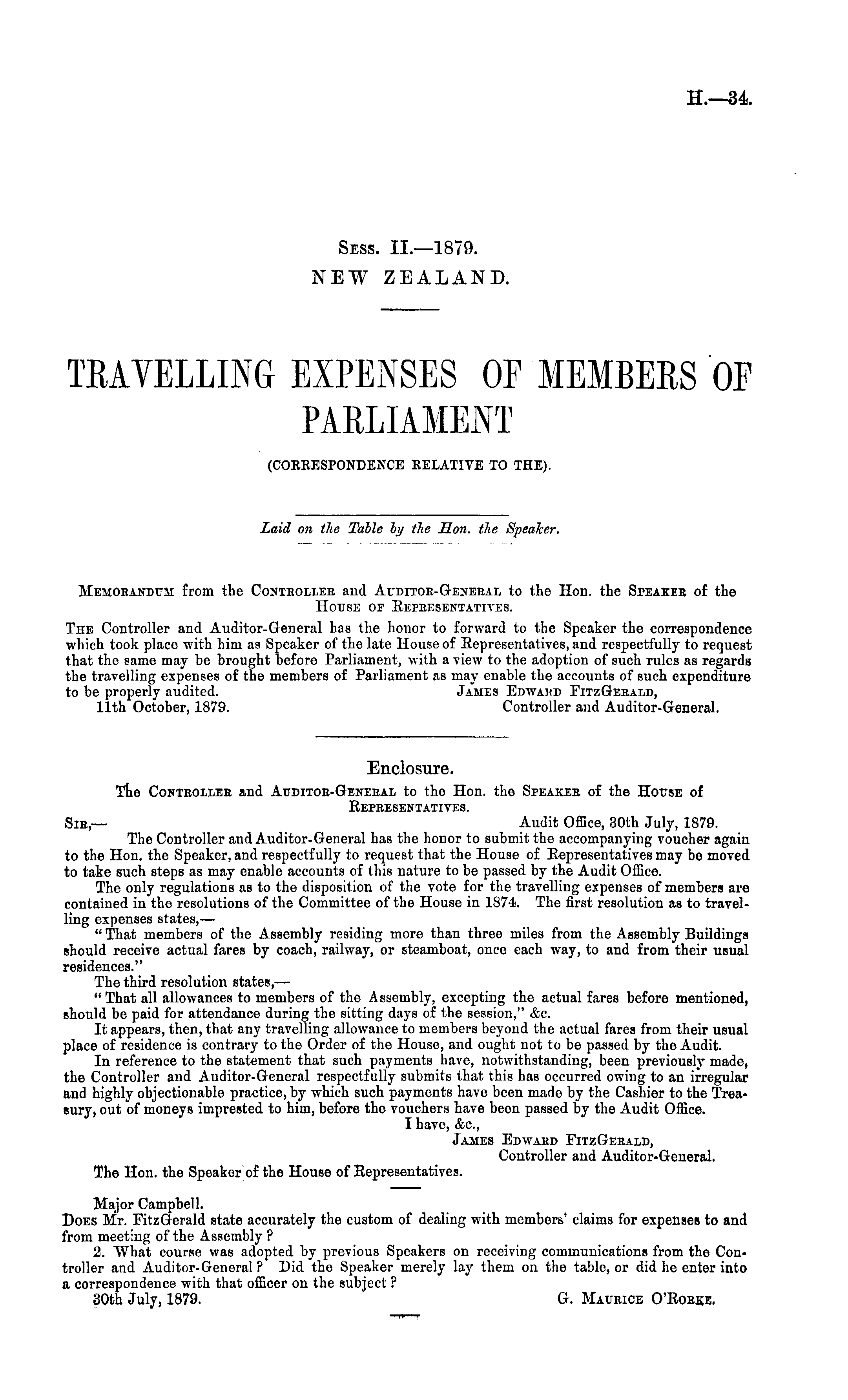 Major Campbell. Does Mr. FitzGerald state accurately the custom of dealing with members' claims for expenses to and from meeting of the Assembly ? 2. What course was adopted by previous Speakers on receiving communications from the Controller and Auditor-General ? Did tho Speaker merely lay them on the table, or did he enter into a correspondence with that officer on the subject ? 30th July, 1879, G. Maurice O'Roeke.
