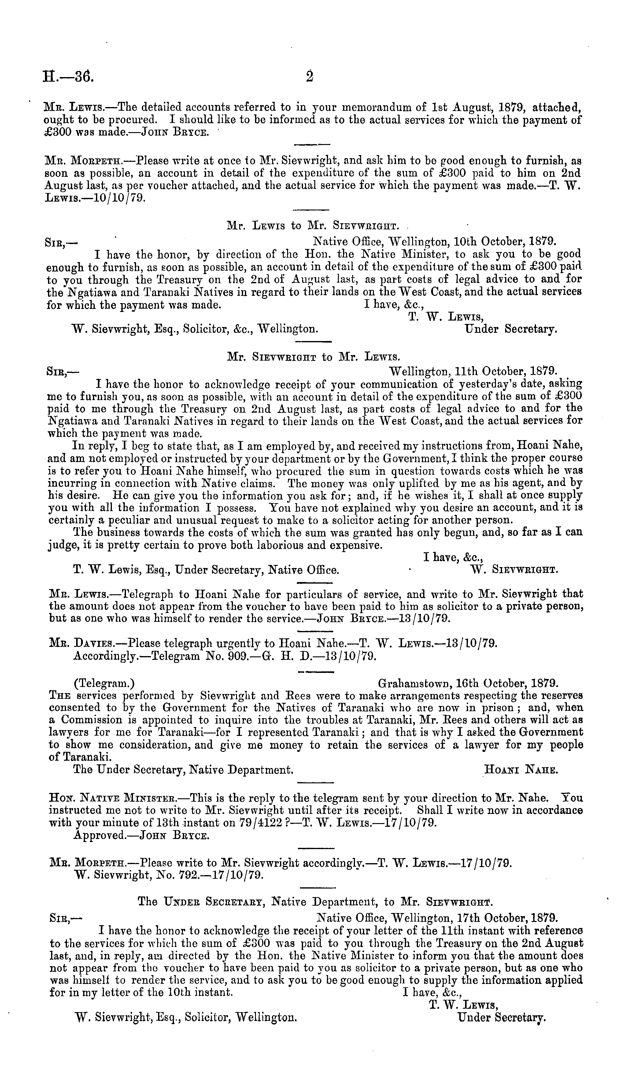 Mr. Sievweight to Mr. Lewis. Sib,— Wellington, 11th October, 1579. 1 have the honor to acknowledge receipt of your communication of yesterday's date, asking me to furnish you, as soon as possible, with an account in detail of the expenditure of the sum of £300 paid to me through the Treasury on 2nd August last, as part costs of legal advice to and for the Ngatiawa and Taranaki Natives in regard to their lands on the West Coast, and the actual services for which the payment was made. In reply, I beg to state that, as I am employed by, and received my instructions from, Hoani Nahe, and am not employed or instructed by your department or by the Government, I think the proper course is to refer you to Hoani Nahe himself, who procured the sum in question towards costs which he was incurring in connection with Native claims. The money was only uplifted by me as his agent, and by his desire. He can give you the information you ask for; and, if he wishes it, I shall at once supply you with all the information I possess. You have not explained why you desire an account, and it is certainly a peculiar and unusual request to make to a solicitor acting for another person. The business towards the costs of which the sum was granted has only begun, and, so far as I can judge, it is pretty certain to prove both laborious and expensive. I have, &c, T. W. Lewis, Esq., Under Secretary, Native Office. • W. Sieywright.