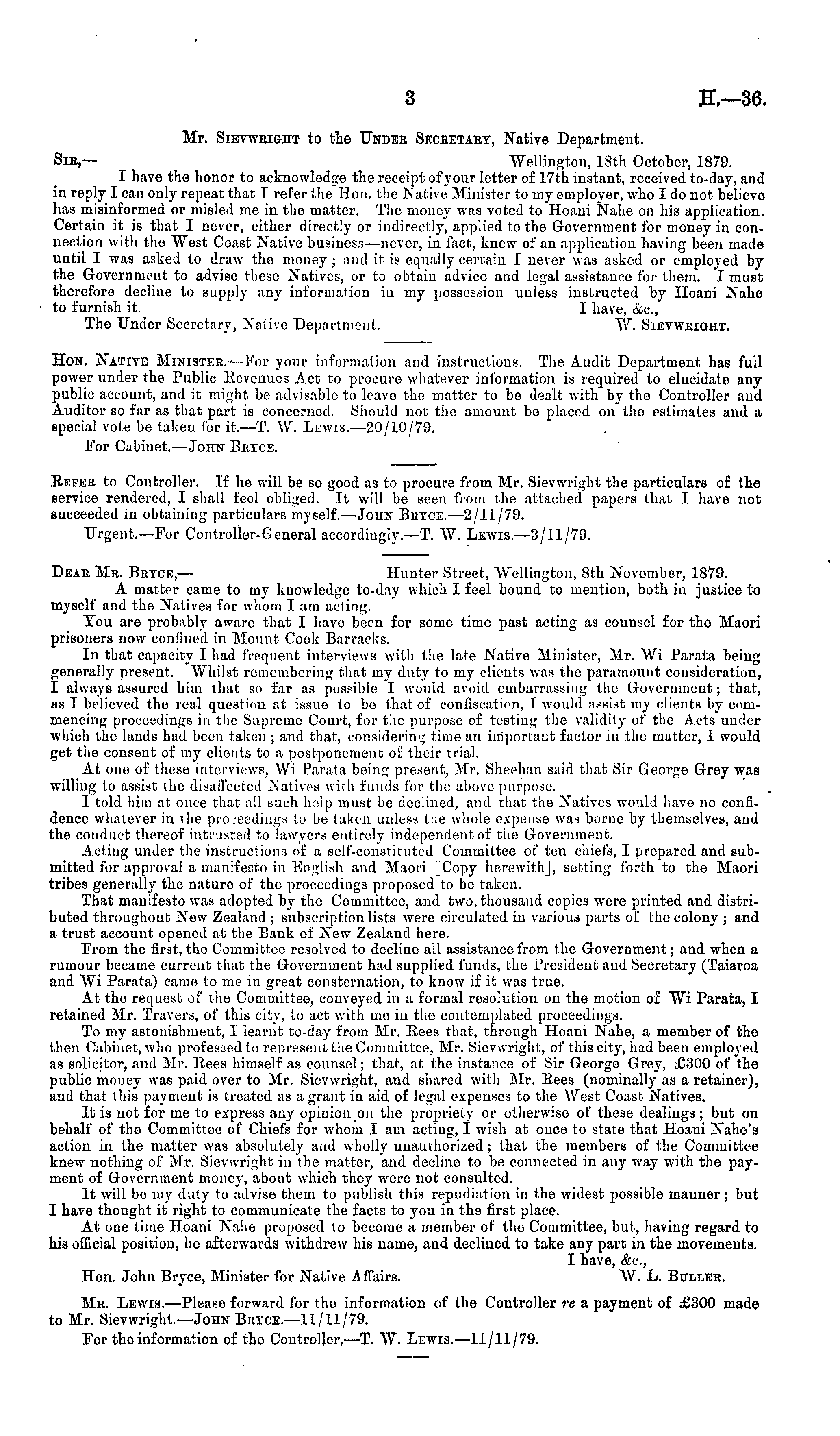 Deae Mb. Betoe, — Hunter Street, Wellington, Bth November, 1879. A matter came to my knowledge to-day which I feel bound to mention, both iv justice to myself and the Natives for whom I am acting. You are probably aware that I have been for some time past acting as counsel for the Maori prisoners now confined in Mount Cook Barracks. In that capacity I had frequent interviews with the late Native Minister, Mr. Wi Parata being generally present. Whilst remembering that my duty to my clients was the paramount consideration, I always assured him that so far as pussible I would avoid embarrassing the Government; that, as I believed the real question at issue to be that of confiscation, I would assist my clients by commencing proceedings in the Supreme Court, for the purpose of testing the validity of the Acts under which the lands had been taken; and that, considering time an important factor iv the matter, I would get the consent of my clients to a postponement of their trial. At one of these interviews, Wi Parata being present, Mr. Sheehan said that Sir George Grey was willing to assist the disaffected Natives with funds for the above purpose. I told him at once that all such help must be declined, and that the Natives would have no confidence whatever in the proceedings to be taken unless the whole expense was borne by themselves, and the conduct thereof intrusted to lawyers entirely independent of the Government. Acting under the instructions of a self-constituted Committee of ten chiefs, I prepared and submitted for approval a manifesto in English and Maori [Copy herewith], setting forth to the Maori tribes generally the nature of the proceedings proposed to be taken. That manifesto was adopted by the Committee, and two,thousand copies were printed and distributed throughout New Zealand ; subscription lists were circulated in various parts of the colony ; and a trust account opened at the Bank of New Zealand here. From the first, the Committee resolved to decline all assistance from the Government; and when a rumour became current that the Government had supplied funds, the President and Secretary (Taiaroa and Wi Parata) came to me in great consternation, to know if it was true. At the request of the Committee, conveyed in a formal resolution on the motion of Wi Parata, I retained Mr. Travers, of this city, to act with mo in the contemplated proceedings. To my astonishment, 1 learnt to-day from Mr. Rees that, through Hoani Nuhe, a member of the then Cabinet, who professed to represent the Committee, Mr. Sievwriglit, of this city, had been employed as solicitor, and Mr. Rees himself as counsel; that, at the instance of Sir Georgo Grey, £300 of the public money was paid over to Mr. Sievwright, and shared with Mr. Rees (nominally as a retainer), and that this payment is treated as a grant in aid of legal expenses to the West Coast Natives. It is not for me to express any opinion on the projiriety or otherwise of these dealings ; but on behalf of the Committee of Chiefs for whom I am acting, 1 wish at once to state that Hoani Nahe's action in the matter was absolutely and wholly unauthorized ; that the members of the Committee knew nothing of Mr. Sievwright in the matter, and decline to be connected in any way with the payment of Government money, about which they were not consulted. It will be my duty to advise them to publish this repudiation in the widest possible manner; but I have thought it right to communicate the facts to you in the first place. At one time Hoani Nahe proposed to become a member of the Committee, but, having regard to his official position, he afterwards withdrew his name, and declined to take any part in the movements. I have, &c, Hon. John Bryce, Minister for Native Affairs. W. L. Bullee. Mb. Lewis. —Please forward for the information of the Controller re a payment of £300 made to Mr. Sievwright.—John Bryce.—ll/11/79. For the information of the Controller,—T. W. Lewis.—ll/11/79.