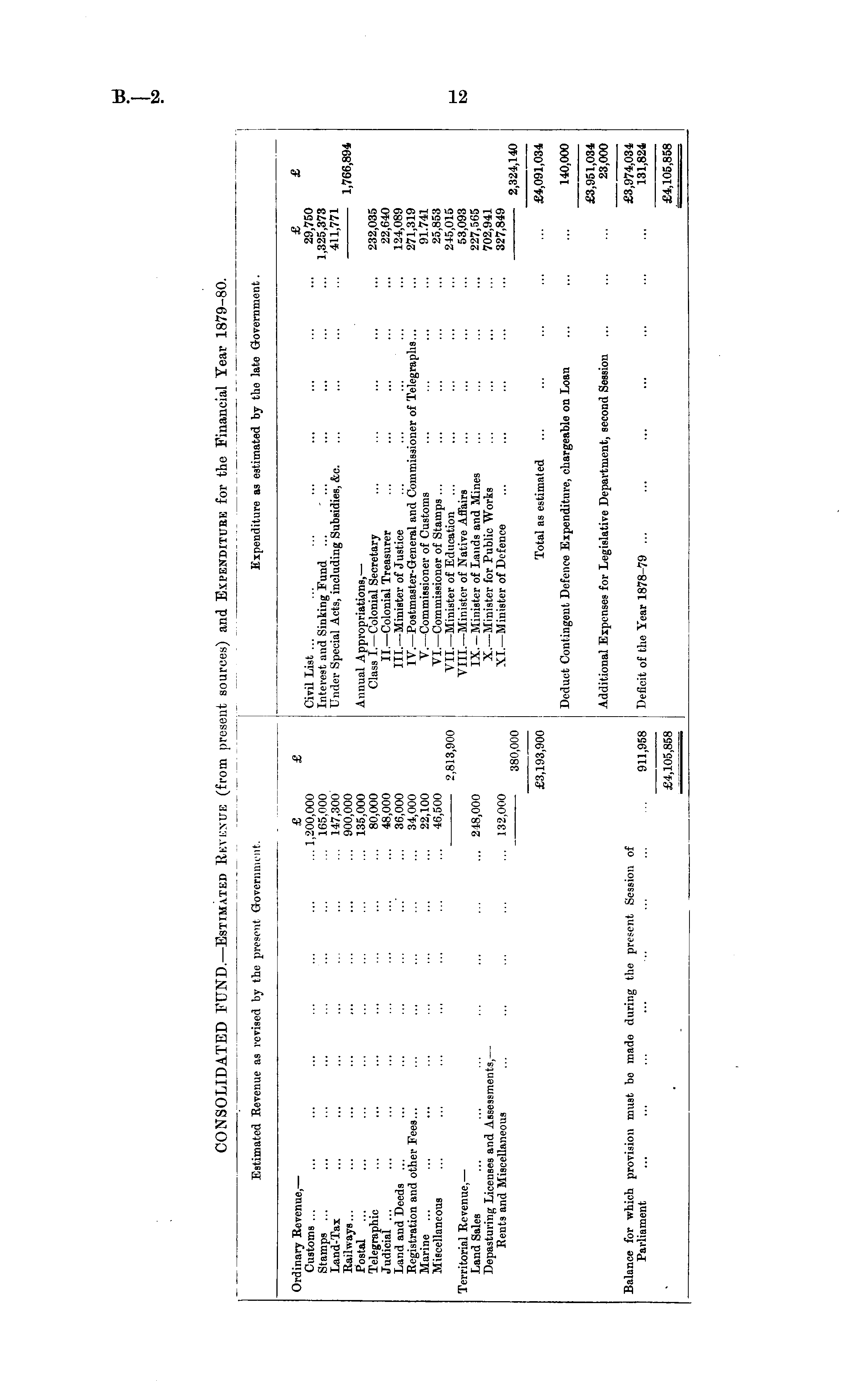 Estimated Revenue as revised by the present Government. Expenditure as estimated by the late (3-overnment. Ordinary Revenue, — £ £ Customs... ... ... ... ... ... ... ...1,200,000 Stamps ... ... ... ... ... ... ... ... 165,000 Land-Tax ... ... ... ... ... ... ... 147,300 Railways... ... ... ... ... ... ... ... 900,000 Postal ... ... ... ... ... ... ... ... 135,000 Telegraphic ... ... ... ... ... ... ... 80,000 Judicial ... ... ... ... ... ... ... ... 48,000 Land and Deeds ... ... ... ... ... ...' ... 36,000 Registration and other Fees... ... ... ... ... ... 34,000 Marine ... ... ... ... ... ... ... ... 22,100 Miscellaneous ... ... ... ... ... ... ... 46,500 2,813,900 Civil List ... Interest and Sinking Fund ... ' ... Under Special Acts, including Subsidies, &c. Annual Appropriations, — Class I.—Colonial Secretary II. —Colonial Treasurer III. —Minister of Justice IV. —Postmaster-General and Commissioner of Telegraphs... V.—Commissioner of Customs VI. —Commissioner of Stamps ... VII. —Minister of Education VIII. —Minister of Native Affairs IX. — Minister of Lands and Mines X. —Minister for Public Works XI. —Minister of Defence £ £ 29,750 1,325,373 411,771 1,766,894 232,035 22,640 124,089 271,319 91.741 25,853 245,015 53,093 227,565 702,941 327,849 Territorial Revenue, — Land Sales ... ... ... ... ... ... ... 248,000 Depasturing Licenses and Assessments, — Rent3 and Miscellaneous ... ... ... ... ... 132,000 380,000 Total as estimated 2,324,140 £4,091,034 £3,193,900 Deduct Contingent Defence Expenditure, chargeable on Loan Additional Expenses for Legislative Department, second Session Deficit of the Year 1878-79 ... 140,000 £3,951,034 23,000 £3,974,034 131,824 £4,105,858 Balance for which provision must bo made during the present Session of Parliament ... ... ... ... ... ... ... ... 911,958 £4,105,858