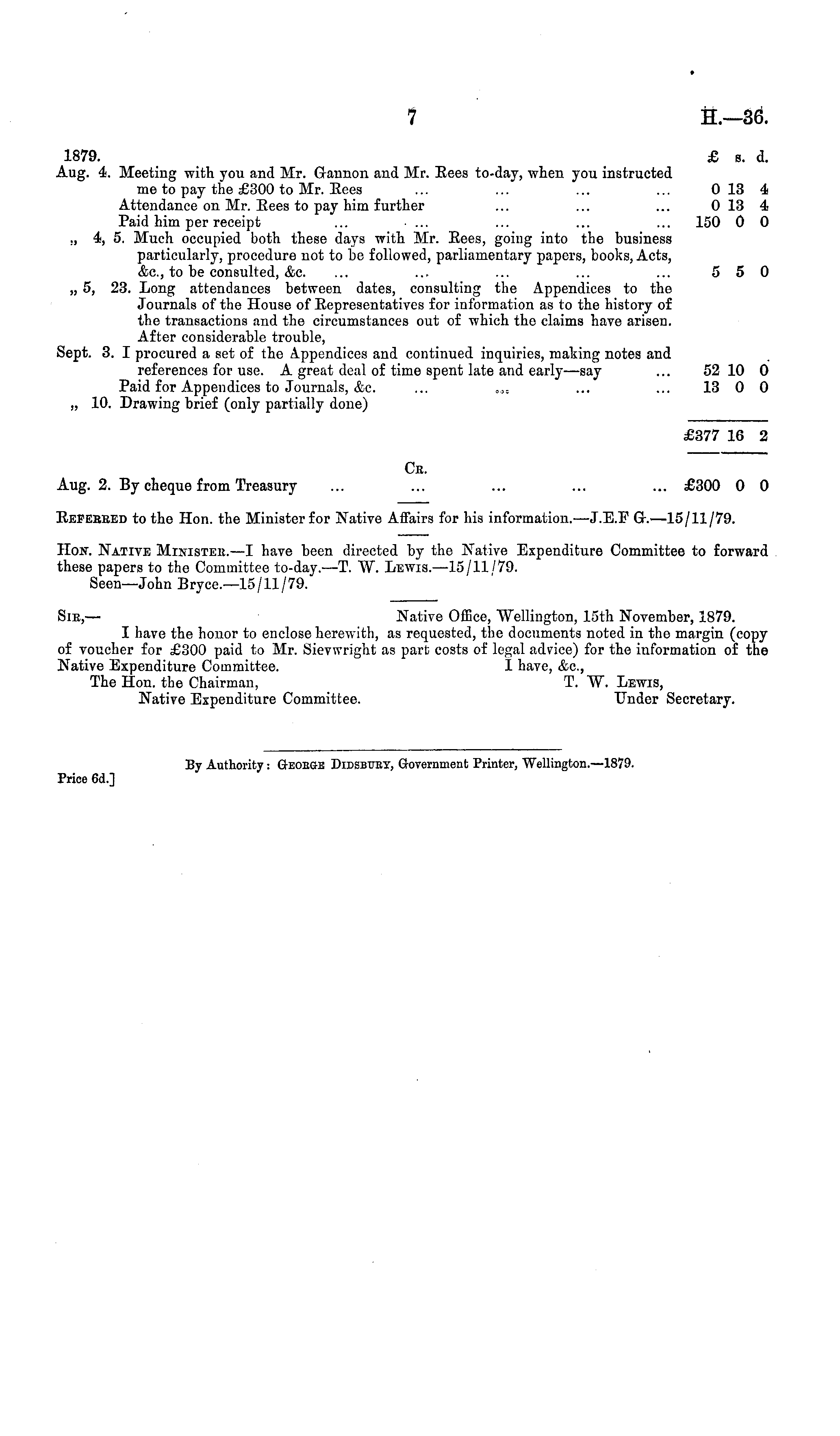1879. £ s. d. Aug. 4. Meeting with you and Mr. G-aunon and Mr. Eees to-day, when you instructed me to pay the £300 to Mr. Eees ... ... ... ... 0 13 4 Attendance on Mr. Eees to pay him further ... ... ... 0 13 4 Paid him per receipt ... ■ ... ... ... ... 150 0 0 ~ 4, 5. Much occupied both these days with Mr. Eees, going into the business particularly, procedure not to be followed, parliamentary papers, books, Acts, <fee, to be consulted, &c. ... ... ... ... ... 5 5 0 „5, 23. Long attendances between dates, consulting the Appendices to the Journals of the House of Representatives for information as to the history of the transactions and the circumstances out of which the claims have arisen. After considerable trouble, Sept. 3. I procured a set of the Appendices and continued inquiries, mating notes and references for use. A great deal of time spent late and early—say ... 52 10 0 Paid for Appendices to Journals, &c. ... ... ... ... 13 0 0 „ 10. Drawing brief (only partially done) £377 16 2 Ce. Aug. 2. By cheque from Treasury ... ... ... ... ... £300 0 0 Eeferbed to the Hon. the Minister for Native Affairs for his information. —J.E.P Gr.—ls/11/79. Hon\ Native Minister.—l have been directed by the Native Expenditure Committee to forward these papers to the Committee to-day.-—T. "W". Lewis.—ls/11/79. Seen—John Bryce.—ls/11/79. Sin,— Native Office, Wellington, 15th November, 1879. I have the honor to enclose herewith, as requested, the documents noted in the margin (copy of voucher for £300 paid to Mr. Sievwright as part costs of legal advice) for the information of the Native Expenditure Committee. I have, &c, The Hon. the Chairman, T. W. Lewis, Native Expenditure Committee. Under Secretary. By Authority : G-eoege Dibsbuey, Government Printer, Wellington.—lß79. Price 6d.]