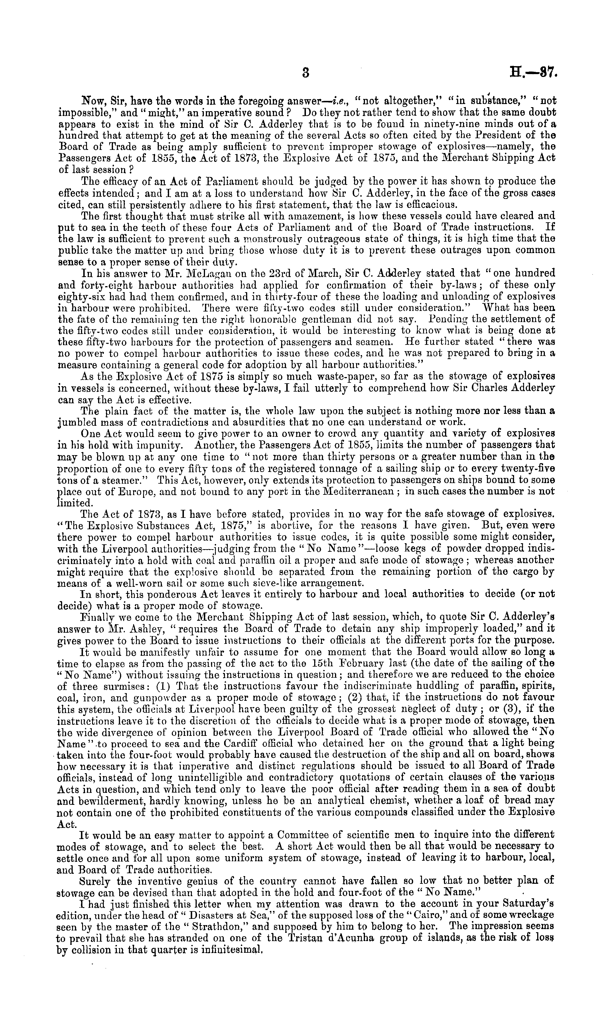 Now, Sir, have the words in the foregoing answer— i.e., "not altogether," "in substance," "not impossible," and " miE;ht," an imperative sound ? Do they not rather tend to show that the same doubt appears to exist in the mind of Sir C. Adderley that ia to be found iu ninety-nine minds out of a hundred that attempt to get at the meaning of the several Acts so often cited by the President of the Board of Trade as being amply sufficient to prevent improper stowage of explosives —namely, the Passengers Act of 1855, the Act of 1873, the Explosive Act of 1875, aud the Merchant Shipping Act of last session ? The efficacy of an Act of Parliament should be judged by the power it has shown to produce the effects intended; and lamat a loss to understand how Sir C. Adderley, in the face of the gross cases cited, can still persistently adhere to his first statement, that the law is efficacious. The first thought that must strike all with amazement, is how these vessels could have cleared and put to sea in the teeth of these four Acts of Parliament and of the Board of Trade instructions. If the law is sufficient to prevent such a monstrously outrageous state of things, it is high time that the public take the matter up and bring those whose duty it is to prevent these outrages upon common sense to a proper sense of their duty. In his answer to Mr. McLagan on the 23rd of March, Sir C. Adderley stated that "one hundred and forty-eight harbour authorities had applied for confirmation of their by-laws; of these only eighty-six had had them confirmed, and in thirty-four of these the loading and unloading of explosives in harbour were prohibited. There were fifty-two codes still under consideration." What has been the fate of the remaining ten the right honorable gentleman did not say. Pending the settlement of the fifty-two codes still under consideration, it would be interesting to know what is being done at these fifty-two harbours for the protection of passengers and seamen. He further stated " there was no power to compel harbour authorities to issue these codes, and he was not prepared to bring in a measure containing a general code for adoption by all harbour authorities." As the Explosive Act of 1875 is simply so much waste-paper, so far as the stowage of explosives in vessels is concerned, without these by-laws, I fail utterly to comprehend how Sir Charles Adderley can say the Act is effective. The plain fact of the matter is, the whole law upon the subject is nothing more nor less than a jumbled mass of contradictions and absurdities that no one can understand or work. One Act would seem to give power to an owner to crowd any quantity and variety of explosives in his hold with impunity. Another, the Passengers Act of 1855, limits the number of passengers that may be blown up at any one time to "not more than thirty persons or a greater number than in the proportion of one to every fifty tous of the registered tonnage of a sailing ship or to every twenty-five tons of a steamer." This Act, however, only extends its protection to passengers on ships bound to some place out of Europe, and not bound to any port in the Mediterranean ; in such cases the number is not limited. The Act of 1873, as I have before stated, provides in no way for the safe stowage of explosives. " The Explosive Substances Act, 1875," is abortive, for the reasons I have given. But, even were there power to compel harbour authorities to issue codes, it is quite possible some might consider, with the Liverpool authorities —judging from the " No Name" —loose kegs of powder dropped indiscriminately into a hold with coai and paraffin oil a proper aud safe mode of stowage ; whereas another might require that the explosive should be separated from the remaining portion of the cargo by means of a well-worn sail or some such sieve-like arrangement. In short, this ponderous Act leaves it entirel}' to harbour and local authorities to decide (or not decide) what is a proper mode of stowage. Eiually we come to the Merchant Shipping Act of last session, which, to quote Sir C. Adderley's answer to Mr. Ashley, " requires the Board of Trade to detain any ship improperly loaded," and it gives power to the Board to issue instructions to their officials at the different ports for the purpose. It would be manifestly unfair to assume for one moment that the Board would allow so long a time to elapse as from the passing of the act to the 15th February last (the date of the sailing of the "No Name") without issuing the instructions in question; and therefore we are reduced to the choice of three surmises: (1) That the instructions favour the indiscriminate huddling of paraffin, spirits, coal, iron, and gunpowder as a proper mode of stowage; (2) that, if the instructions do not favour this system, the officials at Liverpool have been guilty of the grossest neglect of duty ; or (3), if the instructions leave it to the discretion of the officials to decide what is a proper mode of stowage, then the wide divergence of opinion between the Liverpool Board of Trade official who allowed the "No Name " to proceed to sea and the Cardiff official who detained her on the ground that a light being taken into the four-foot would probably have caused the destruction of the ship and all on board, shows how necessary it is that imperative and distinct regulations should be issued to all Board of Trade officials, instead of long unintelligible and contradictory quotations of certain clauses of the various Acts in question, and which tend only to leave the poor official after reading them in a sea of doubt and bewilderment, hardly knowing, unless he be an analytical chemist, whether a loaf of bread may not contain one of the prohibited constituents of the various compounds classified under the Explosive Act. It would be an easy matter to appoint a Committee of scientific men to inquire into the different modes of stowage, and to select the best. A short Act would 