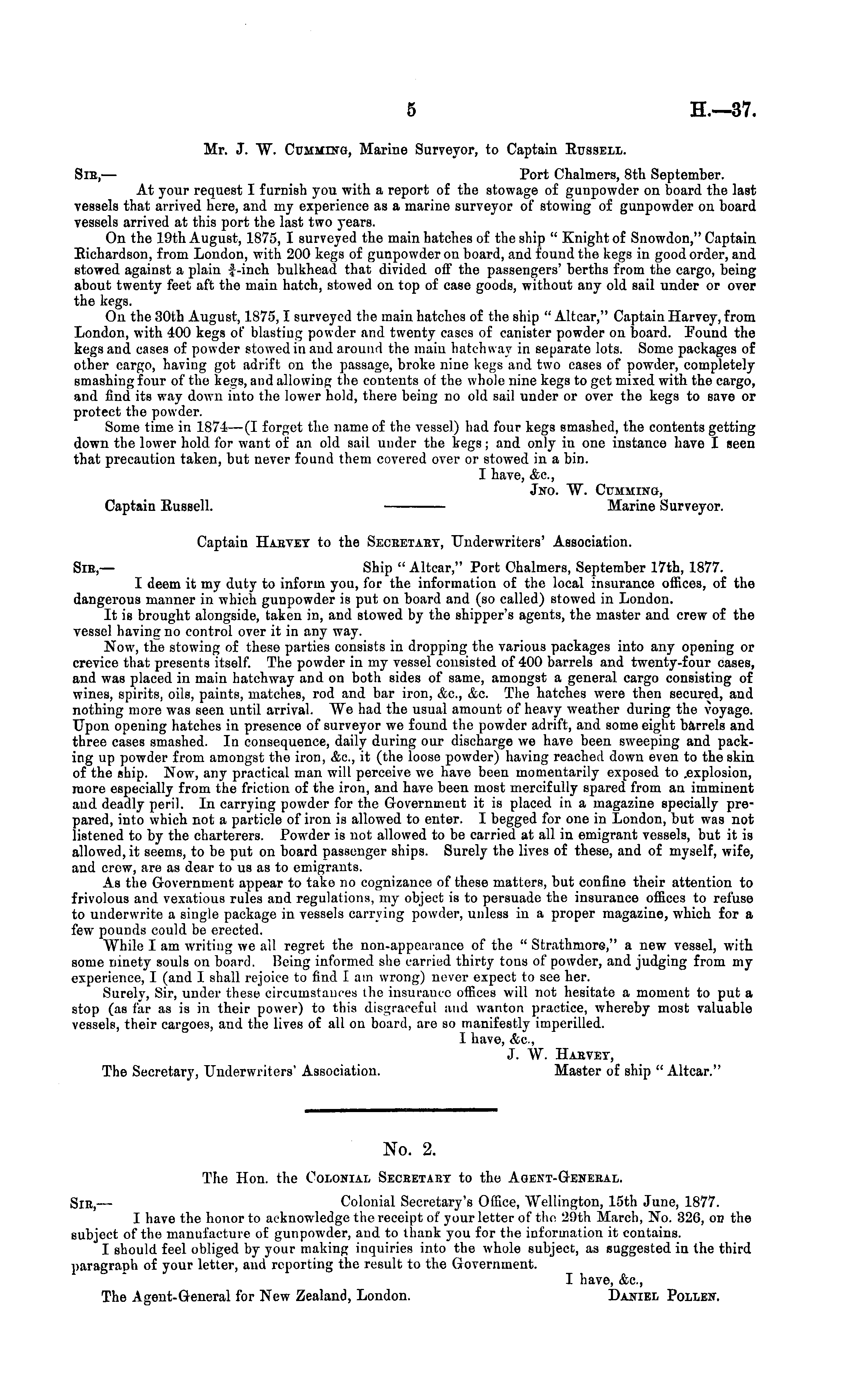 Mr. J. W. Cummlng, Marine Surveyor, to Captain Eussell. Sir, — Port Chalmers, Bth September. At your request I furnish you with a report of the stowage of gunpowder on board the last vessels that arrived here, and my experience as a marine surveyor of stowing of gunpowder on board vessels arrived at this port the last two years. On the 19th August, 1875, I surveyed the main hatches of the ship " Knight of Snowdon," Captain Richardson, from London, with 200 kegs of gunpowder on board, and found the kegs in good order, and stowed against a plain f-inch bulkhead that divided off the passengers' berths from the cargo, being about twenty feet aft the main hatch, stowed on top of case goods, without any old sail under or over the kegs. On the 30th August, 1875,1 surveyed the main hatches of the ship " Altcar," Captain Harvey, from London, with 400 kegs of blasting powder and twenty cases of canister powder on board. Found the kegs and cases of powder stowed in and around the main hatchway in separate lots. Some packages of other cargo, having got adrift on the passage, broke nine kegs and two cases of powder, completely smashing four of the kess, and allowing the contents of tho whole nine kegs to get mixed with the cargo, and find its way down into the lower hold, there being no old sail under or over the kegs to save or protect the powder. Some time in 1874 —(I forgot the name of the vessel) had four kegs smashed, the contents getting down the lower hold for want of an old sail under the kegs; and only in one instance have I seen that precaution taken, but never found them covered over or stowed in a bin. I have, &c, Jno. "W. CrsraiNG, Captain Bussell. Marine Surveyor.