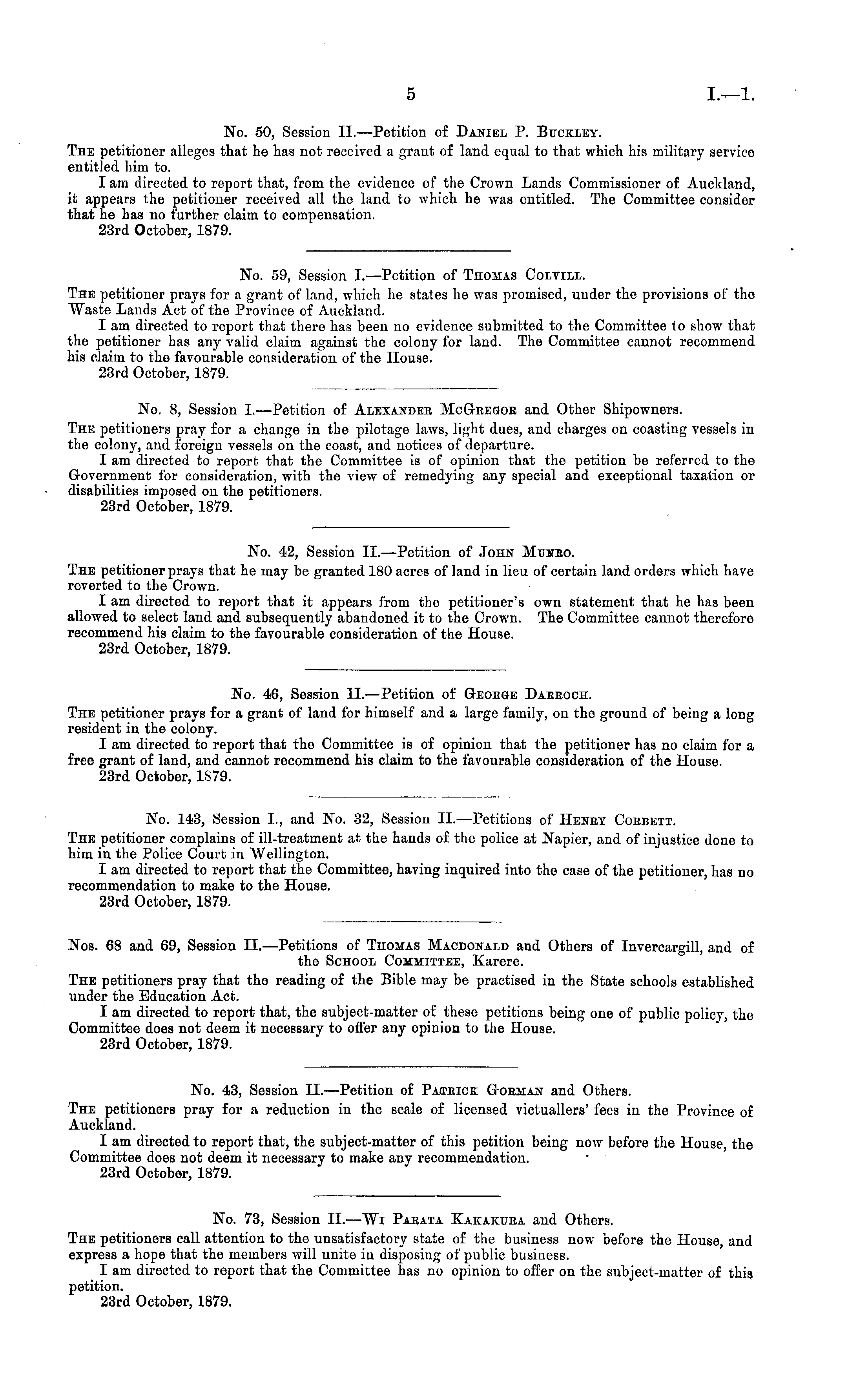No. 50, Session ll.—Petition of Daniel P. Buckley. The petitioner alleges that he has not received a grant of land equal to that which his military service entitled him to. I am directed to report that, from the evidence of the Crown Lands Commissioner of Auckland, it appears the petitioner received all tho land to which he was entitled. The Committee consider that he has no further claim to compensation. 23rd October, 1879.