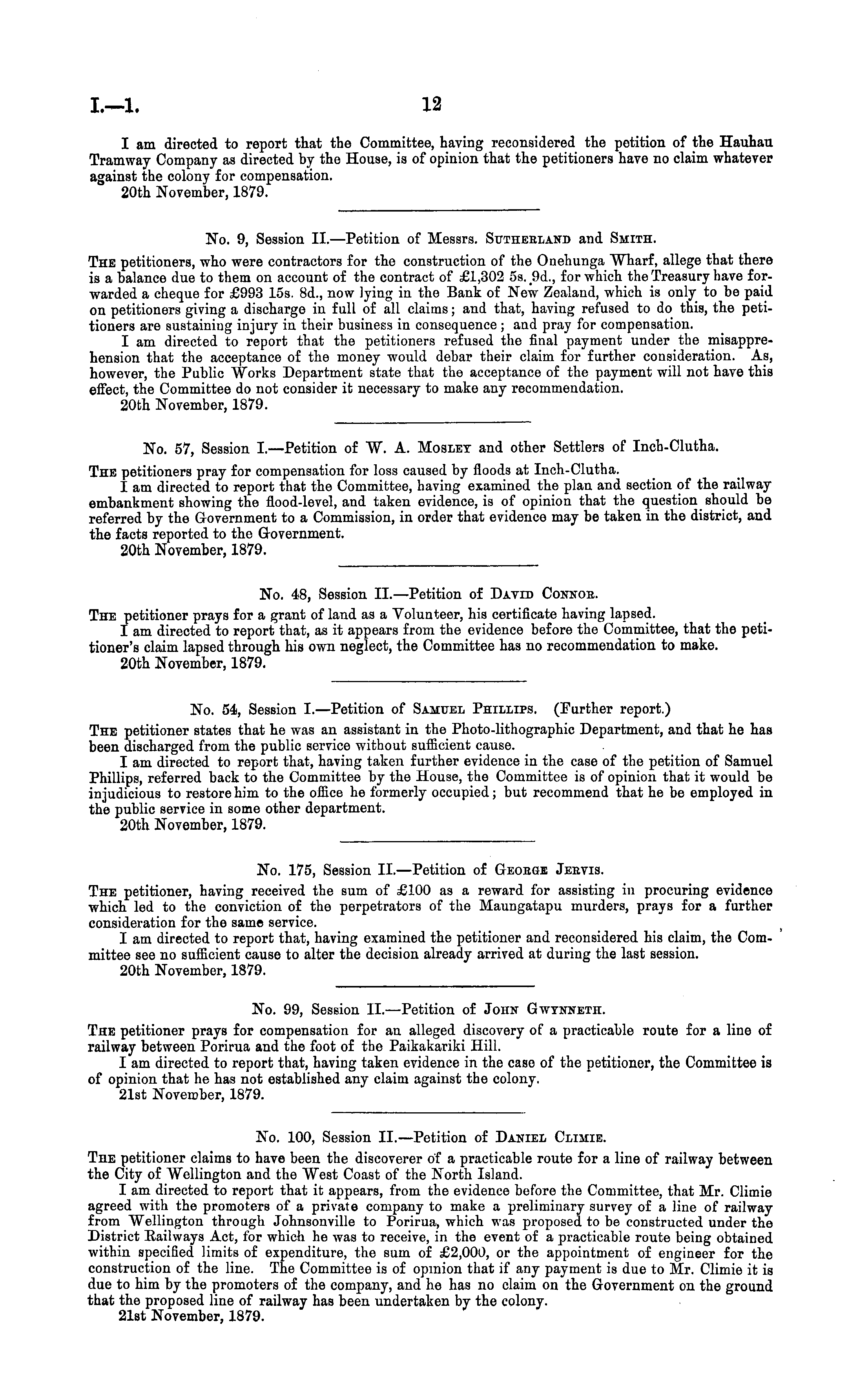 No. 57, Session I.—Petition of W. A. Mosley and other Settlers of Inch-Clutha. The petitioners pray for compensation for loss caused by floods at Inch-Clutha. I am directed to report that the Committee, having examined the plan and section of the railway embankment showing the flood-level, and taken evidence, is of opinion that the question should be referred by the Government to a Commission, in order that evidence may be taken in the district, and the facts reported to the Government. 20th November, 1879.